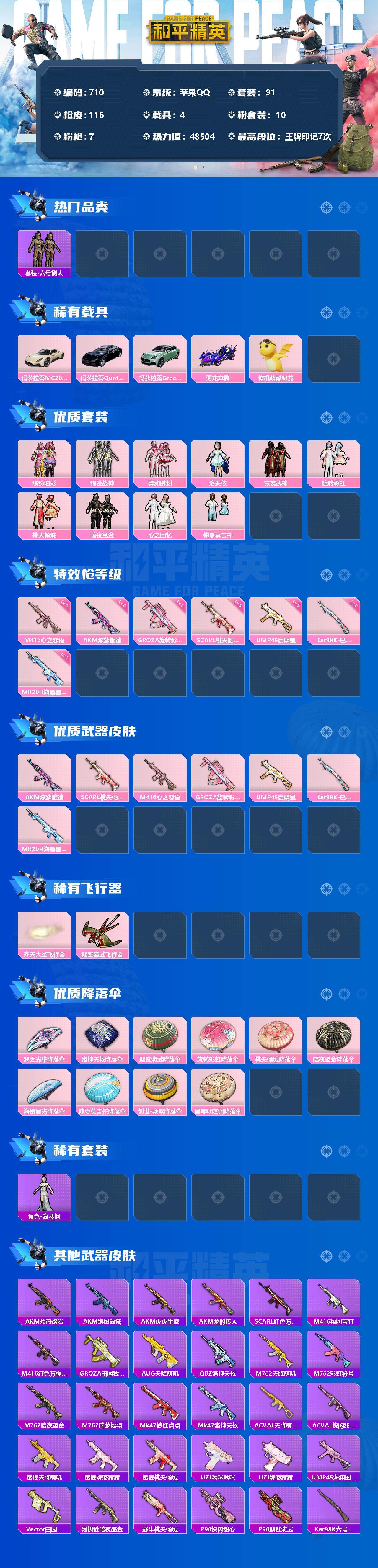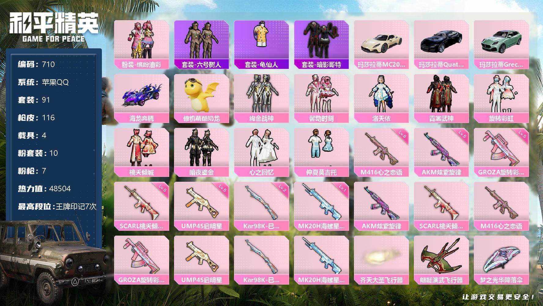 [12372420]【商品标题】:苹果 手Q-10粉装-7特效枪-4载具-2粉色飞行器-48504热力值-7王牌印记-91套装-116枪皮 【热门品类】:粉装-缤纷油彩,套装-六号树人,套装-龟仙人,套装-暗影哥特 【粉色载具】:玛莎拉蒂MC20(星石白),玛莎拉蒂Quattroporte(夜幕蓝),玛莎拉蒂Grecale(薄荷绿),海龙奔腾,僚机-萌酷奶龙 【粉色套装】:粉装-缤纷油彩,粉装-绚金战神,粉装-馨动时刻,角色-洛天依,粉装-霓裳武神,粉装-旋转彩虹,粉装-桃夭倾城,粉装-暗夜鎏金,粉装-心之回忆,粉装-仲夏莫吉托 【粉色枪皮等级】:AKM-炫紫旋律(五级),SCAR-L-桃夭倾城(五级),M416-心之恋语(六级),GROZA-旋转彩虹(五级),UMP45-启明星(五级),Kar98K-巳巳如意(二级),MK20-H-海螺星光(一级) 【粉色枪皮】:AKM-炫紫旋律,SCAR-L-桃夭倾城,M416-心之恋语,GROZA-旋转彩虹,UMP45-启明星,Kar98K-巳巳如意,MK20-H-海螺星光 【粉色飞行器】:齐天大圣飞行器,翩跹演武飞行器 【粉色降落伞】:梦之光华降落伞,洛神天依降落伞,翩跹演武降落伞,旋转彩虹降落伞,桃夭倾城降落伞,暗夜鎏金降落伞,海螺星光降落伞,仲夏莫吉托降落伞,创世·救赎降落伞,星穹咏叹调降落伞 【稀有套装】:套装-龟仙人,角色-海琴烟 【稀有枪皮】:AKM-灼热熔岩,AKM-缤纷海域,AKM-虎虎生威,AKM-龙的传人,SCAR-L-红色方程式,M416-糯团青竹,M416-红色方程式,GROZA-田园牧歌,AUG-天降萌叽,QBZ-洛神天依,M762-天降萌叽,M762-彩虹符号,M762-暗夜鎏金,M762-瑞龙福将,Mk47-妙红点点,Mk47-洛神天依,AC-VAL-天降萌叽,AC-VAL-快闪甜心,蜜獾-天降萌叽,蜜獾-娇憨猪猪,蜜獾-桃夭倾城,UZI-啾咪啾咪,UZI-娇憨猪猪,UMP45-海渊国主,Vector-田园牧歌,汤姆逊-暗夜鎏金,野牛-桃夭倾城,P90-快闪甜心,P90-翩跹演武,Kar98K-六号树人,Kar98K-洛神天依,M24-仲夏莫吉托,SKS-心之恋语,SKS-糯团青竹,SKS-金玉无双,VSS-田园牧歌,Mini14-旋转彩虹,Mk14-海螺星光,Win94-瑞龙福将,SLR-娇憨猪猪,SLR-彩虹符
