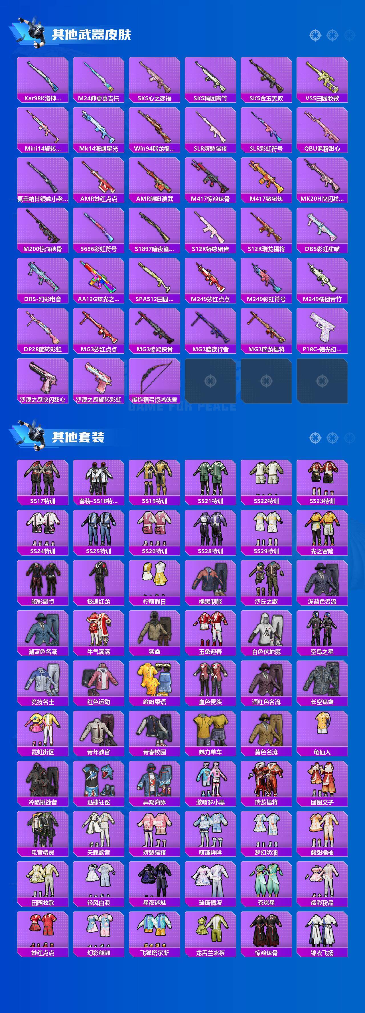 【稀有枪皮】:AKM-灼热熔岩,AKM-缤纷海域,AKM-虎虎生威,AKM-龙的传人,SCAR-L-红色方程式,M416-糯团青竹,M416-红色方程式,GROZA-田园牧歌,AUG-天降萌叽,QBZ-洛神天依,M762-天降萌叽,M762-彩虹符号,M762-暗夜鎏金,M762-瑞龙福将,Mk47-妙红点点,Mk47-洛神天依,AC-VAL-天降萌叽,AC-VAL-快闪甜心,蜜獾-天降萌叽,蜜獾-娇憨猪猪,蜜獾-桃夭倾城,UZI-啾咪啾咪,UZI-娇憨猪猪,UMP45-海渊国主,Vector-田园牧歌,汤姆逊-暗夜鎏金,野牛-桃夭倾城,P90-快闪甜心,P90-翩跹演武,Kar98K-六号树人,Kar98K-洛神天依,M24-仲夏莫吉托,SKS-心之恋语,SKS-糯团青竹,SKS-金玉无双,VSS-田园牧歌,Mini14-旋转彩虹,Mk14-海螺星光,Win94-瑞龙福将,SLR-娇憨猪猪,SLR-彩虹符