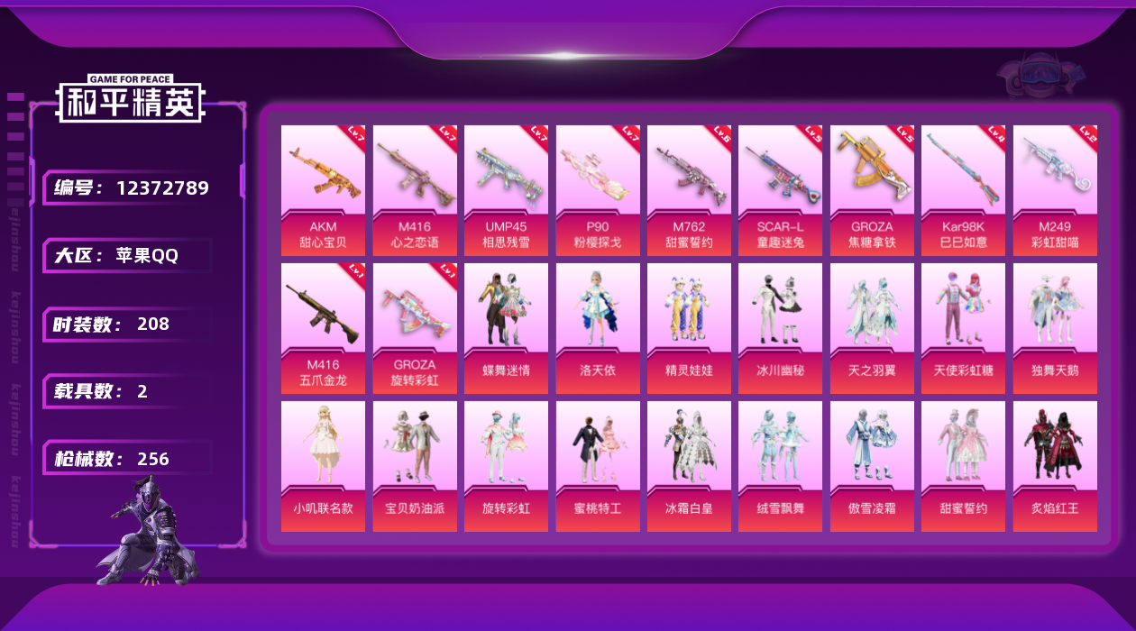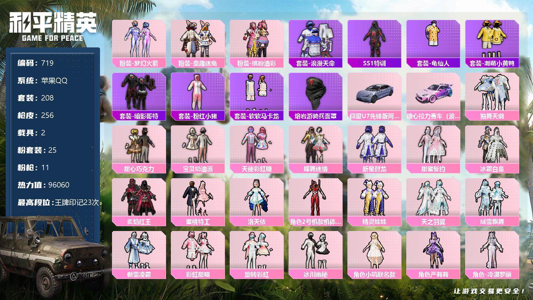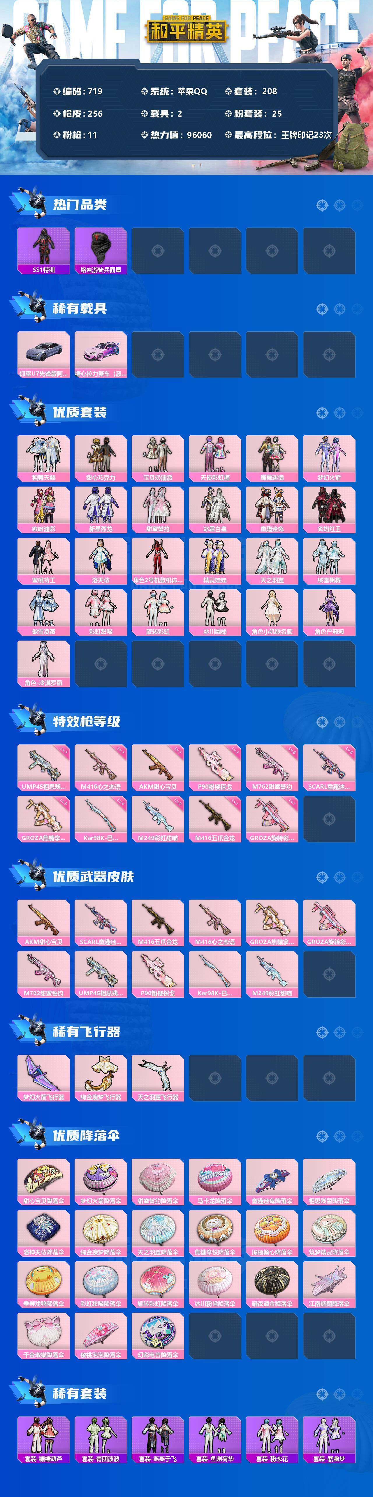 [12372789]【商品标题】:苹果 手Q-25粉装-11特效枪-2载具-3粉色飞行器-96060热力值-23王牌印记-208套装-256枪皮
