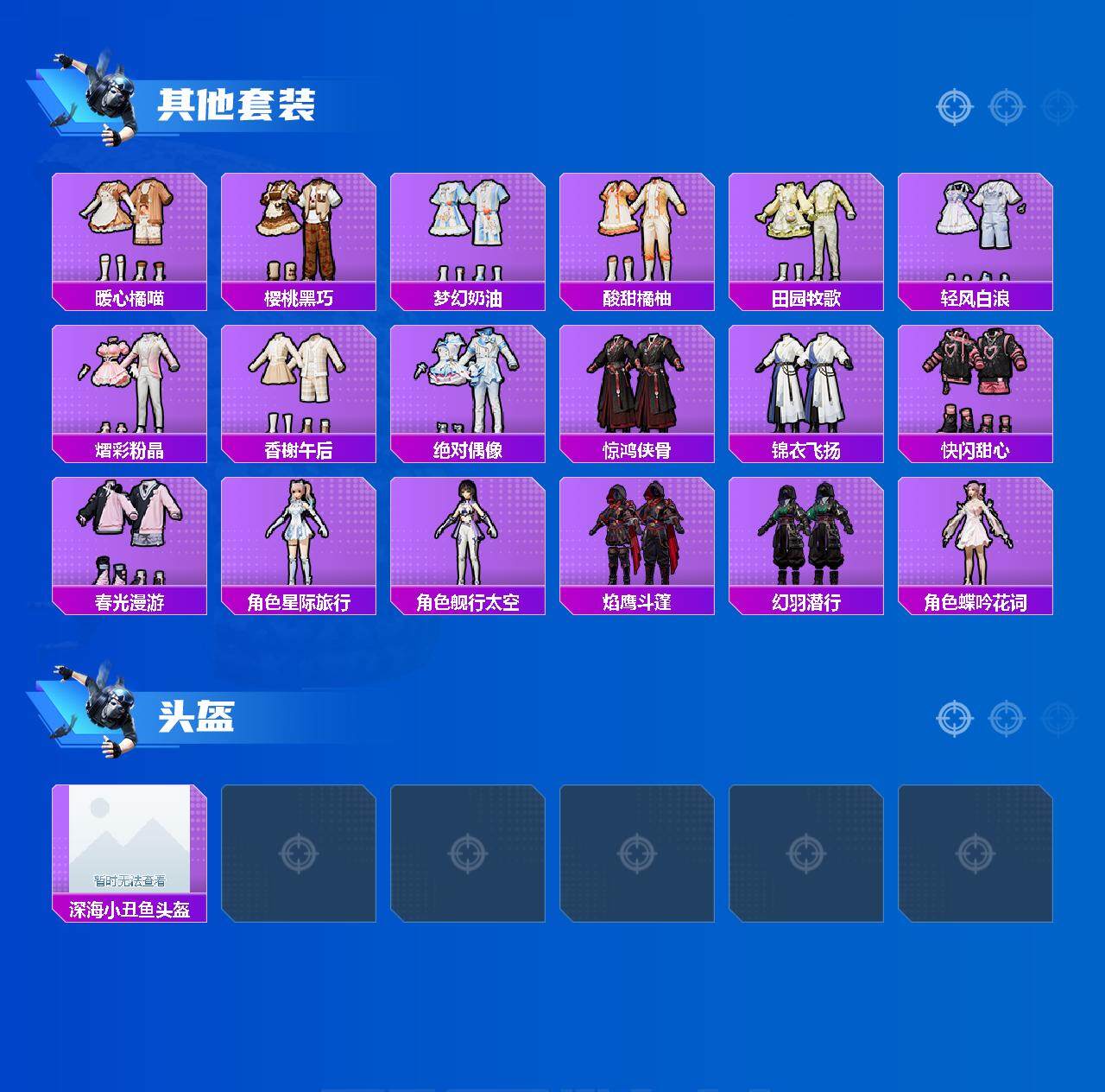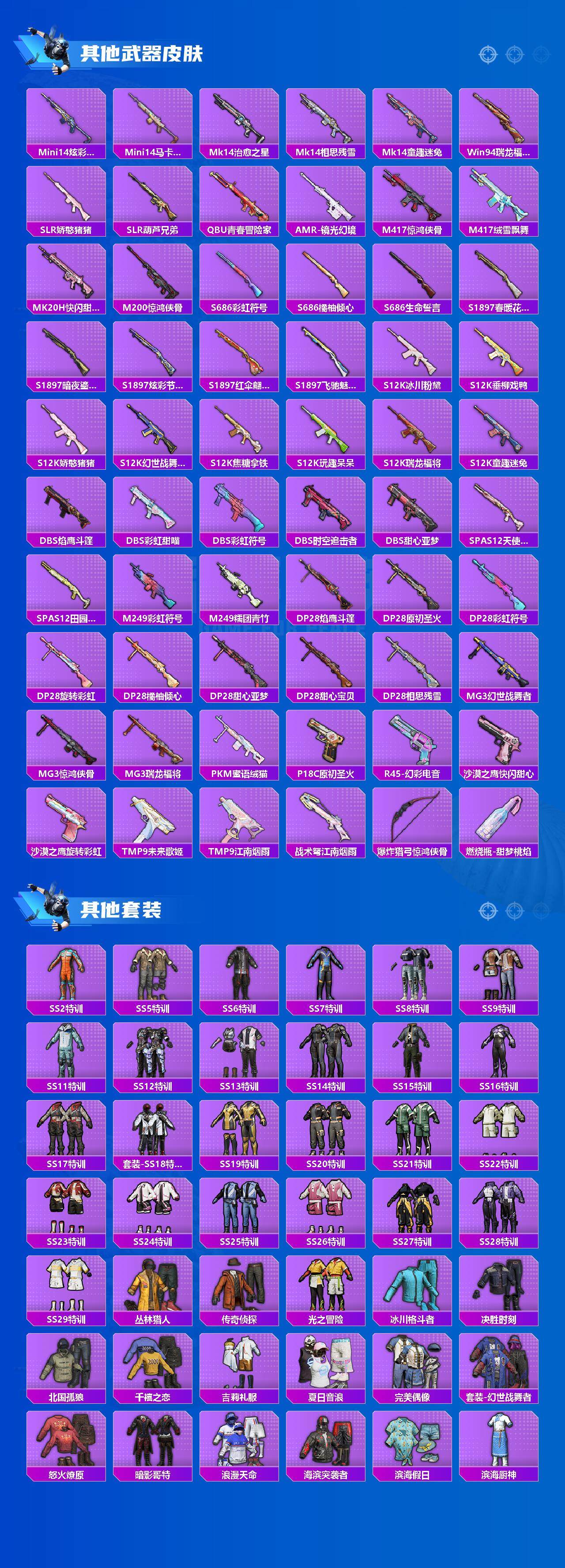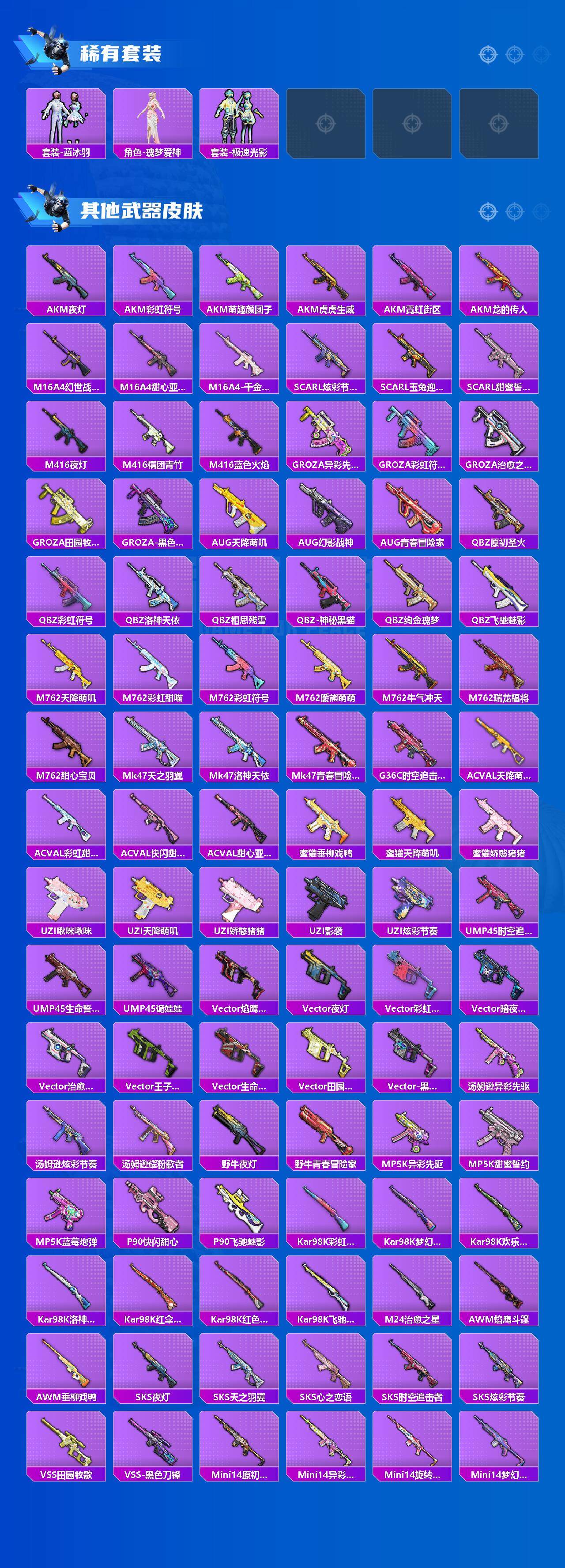 - [12234024]30粉装 9特效枪 3载具 12印记 可二次 可修改实名 身法装备:暗影哥特(红眼罩) 优质装备:晶梦灵驹,海龙奔腾,路特斯ELETRE(冰川蓝),MG3洛神天依,宝贝奶油派,粉色回忆,甜蜜誓约,炙焰红王,馨动时刻,SLR暗夜玫瑰,UMP45恐龙拽拽,七级UMP45-恐龙拽拽,七级MG3-洛神天依,GROZA-镜光银凌,SVD-月影灵韵,七级SVD-月影灵韵,萨利娅,晶梦幻蝶,MK14-樱桃泡泡,羊梦糖心,Kar98K-巳巳如意 热门装扮:彩虹鹿灵,山涧鹿灵,黑伞漫漫,酣梦娃娃,碧影闪光,海渊国主,紫电风暴,赤焰黑爵,闪耀律动,橘柚倾心,霞光圣骑,寒光使者,傲雪凌霜,霁雪冰心,旋转彩虹,冰川红玫,冰川幽秘,音爆索尼克,呆萌星弥,小可学妹,闲梦青缨,美雪,兔兔白日梦,神秘黑猫,胖达圆圆,奶芙汪汪,激萌罗小黑,恶魔喵喵,爱崽白熊,浪漫波比 载具:僚机-萌兔起飞 稀有枪皮:DP-28-豹影疾电 五级特效枪:五级GROZA-镜光银凌,五级Kar98K-巳巳如意,五级DP-28-豹影疾电 四级特效枪:四级MK14-樱桃泡泡 二级特效枪:二级SLR-暗夜玫瑰 紫色装扮:幻彩翩翩,SS23特训,妙红点点,SS30特训套装,SS31特训套装,SS33特训套装,旭日情侣,SS21特训,熠彩粉晶,紫芒星,岑岑玉浪,星夜迷魅,琉璃情波,田园牧歌,轻风白浪,和煦暖阳,SS22特训,香榭午后,顶瓜瓜,冷焰舞者,北国孤狼,千禧之恋,吉莉礼服,夏日音浪,完美偶像,帅气教官,幻世战舞者,幻影武者,萌趣咩咩,军械专家,灵幻魔术师,娇憨猪猪,海龙战士,冰爽风暴,爆裂葡萄,瑞龙福将,团圆交子,SS17特训,SS14特训,萌趣颜团子,特种颜团子,星河入梦,SS15特训,极乐追光,浓情摩卡,SS20特训,醇脆可可,香草威化,浑天鲲鹏,甜心亚梦,虚音幻奏,猎梦纪元,粉团憨憨,梦幻奶油,酸甜橘柚,奶油香芋,樱桃黑巧,怒火燎原,夏雨游龙,软羊咩咩,魔力冰咖,沁蓝冰爽,冰川谧蓝,焰山流火,绿翡凌光,月蓝流光,异彩先驱,缤纷焰火,SS18特训,水晶王族,雪兔飞飞,茉莉之诺,风铃甜诗,飞驰魅影,音速流光,SS19特训,圣诞惊喜,沙暴悍客,青年教官,风暴特警,飞行日记,骑行爱好者,魅力单车,鹤鸣,麻辣教官,黄色运动,黑色伏地魔,龙的传人,冰河战士,龙魂突击队,蝶变,香桃花海,霓虹街区,酷潮明星,都市魅力,霓虹极客,野性