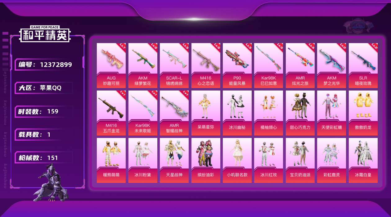 - PX_2095365- 苹果微信-16王牌印记-26粉装-14特效枪-5载具-115109热力值-223套装-310枪皮-0卓越印记-0传奇印记 【26粉装】,梦幻火箭,甜心巧克力,宝贝奶油派,天使彩虹糖,童趣迷兔,玩偶服-猪猪侠,恐龙拽拽,星空武士,飓风飞鹰,冰域雷影,黄族统领,星之信仰,绚丽摇曳,闪耀律动,赤焰黑爵,紫电风暴,圣光天使,霞光圣骑,馨动时刻,冰霜白皇,炙焰红王,绚金战神,音爆索尼