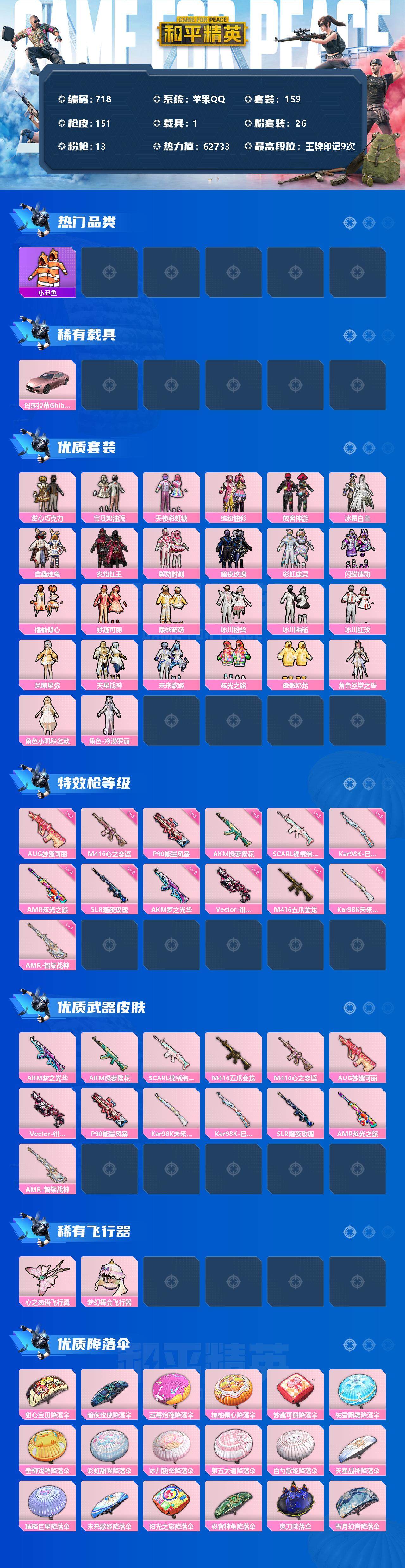 [12372899]【商品标题】:苹果 手Q-26粉装-13特效枪-1载具-2粉色飞行器-62733热力值-9王牌印记-159套装-151枪皮
