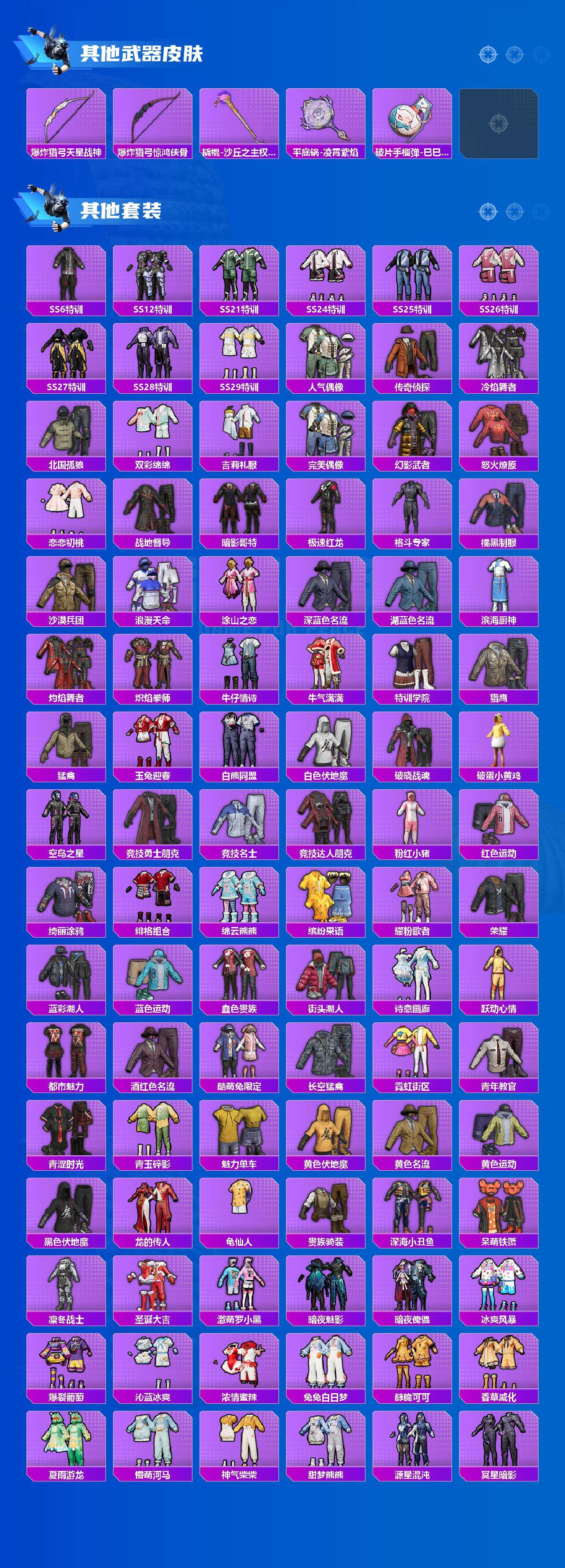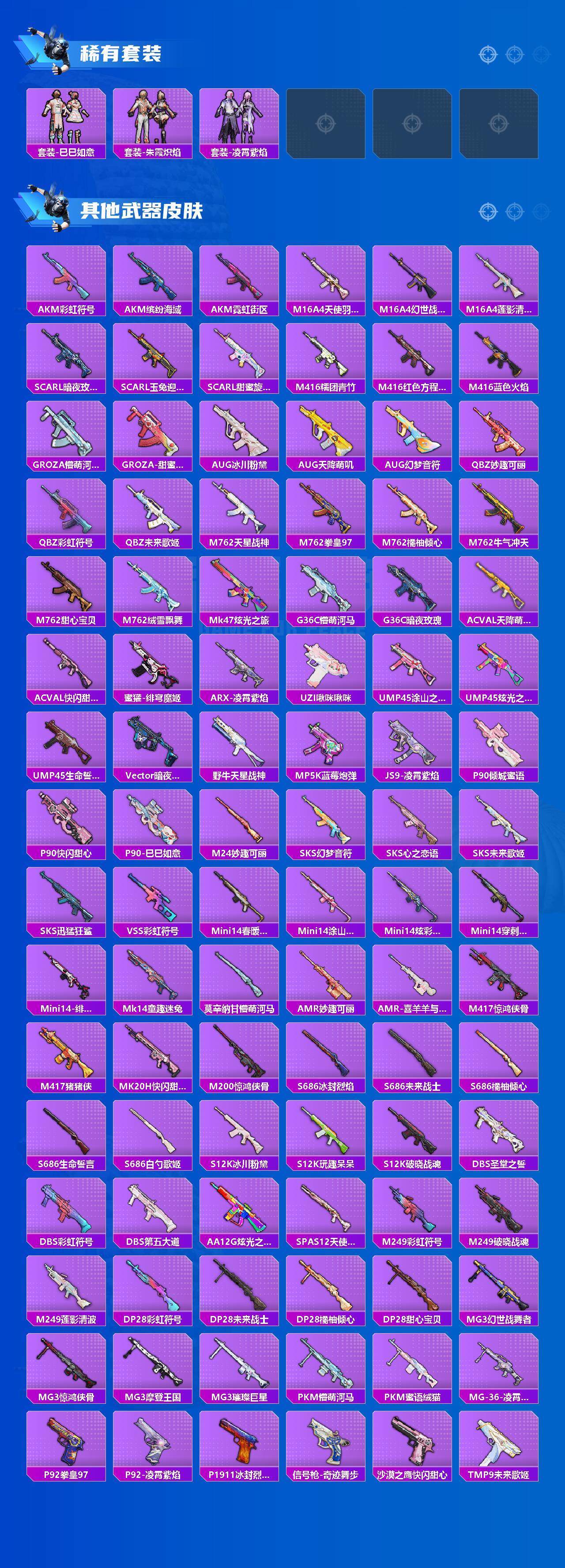 - PX_2084985-【和平精英连体王者荣耀 具体看图!】时装数: 82 枪械数: 127 战备数: 81 热门装扮: 深海小丑鱼,黄族统领,莲影清波 稀有枪皮: AKM绿萝繁花,M416电玩时刻,UMP45量子极限,Kar98K-巳巳如意