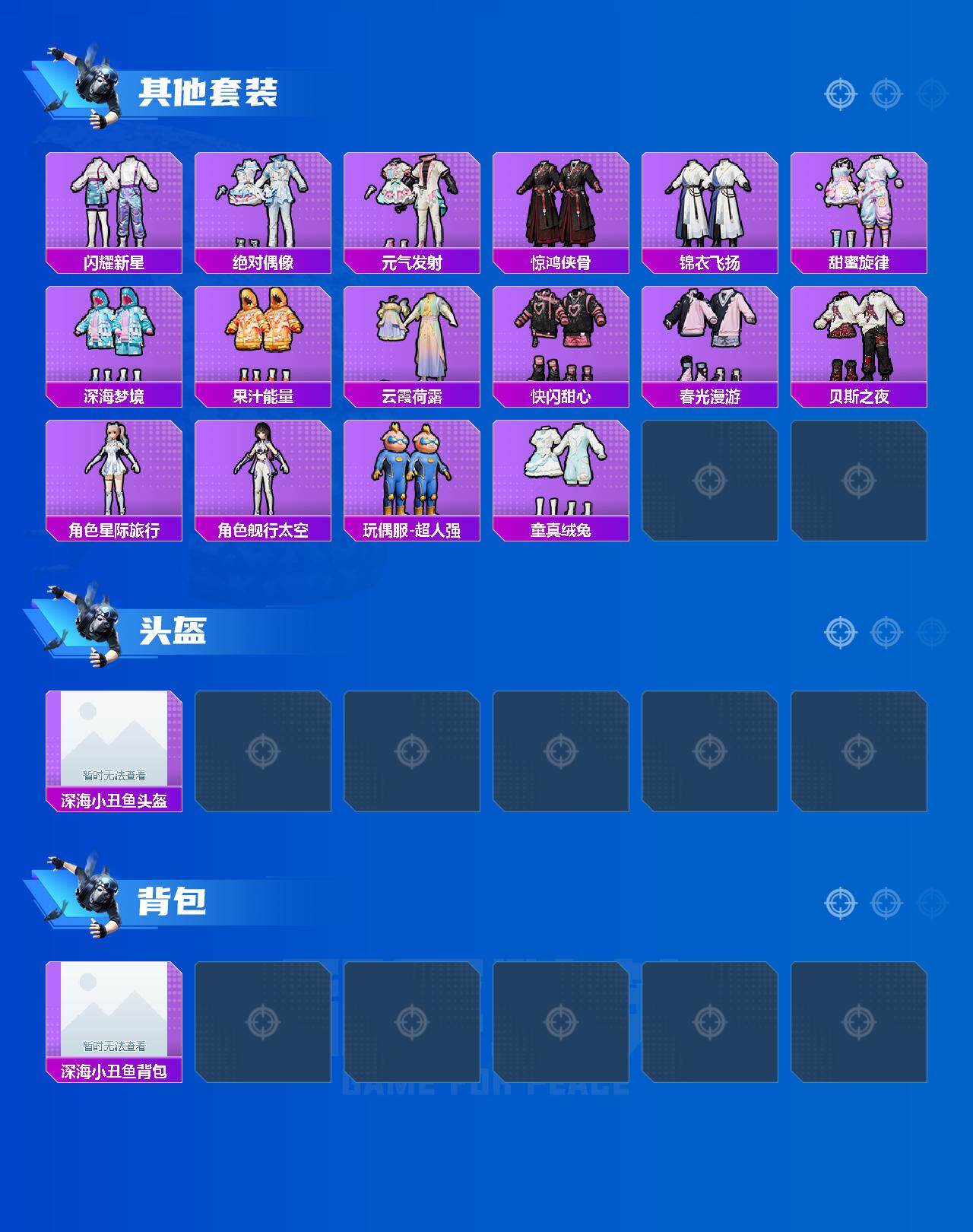 角色-呆萌星弥,套装-冰川幽秘,套装-橘柚倾心,套装-天使彩虹糖,套装-傲傲奶龙,套装-暖熊萌萌,套装-冰川粉黛,套装-天星战神,套装-缤纷油彩,角色-小叽联名款,套装-冰川红玫,套装-宝贝奶油派,套装-彩虹鹿灵,套装-暗夜玫瑰,套装-闪耀律动,套装-放客神游,套装-未来歌姬,套装-妙趣可丽,套装-馨动时刻,套装-炙焰红王,角色-圣堂之誓,套装-炫光之旅