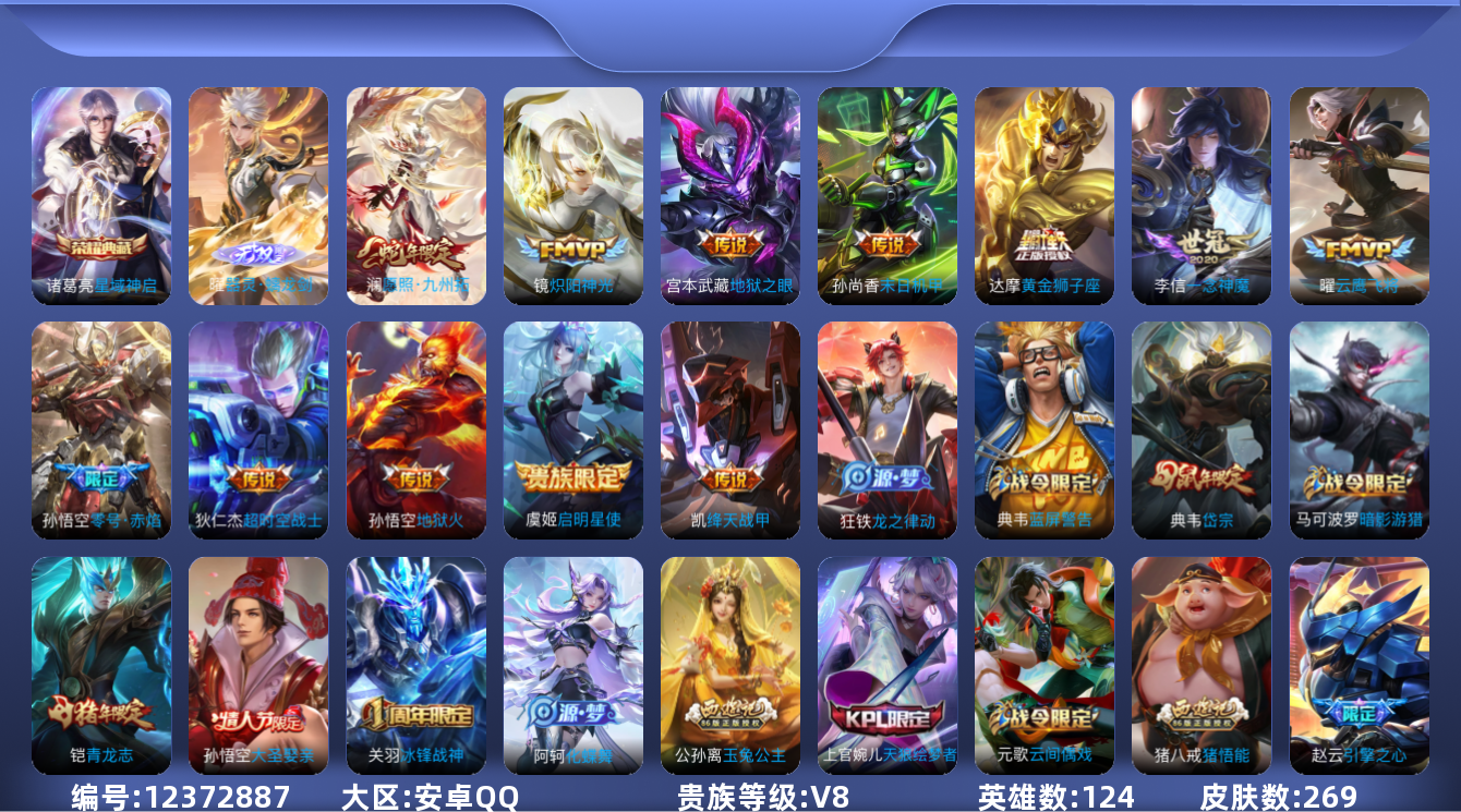 [12372887]【商品标题】:安卓Q-V8-最强王者段位-124英雄-269皮肤-1典藏-0珍品无双-1无双-0珍品传说-12传说-78史诗