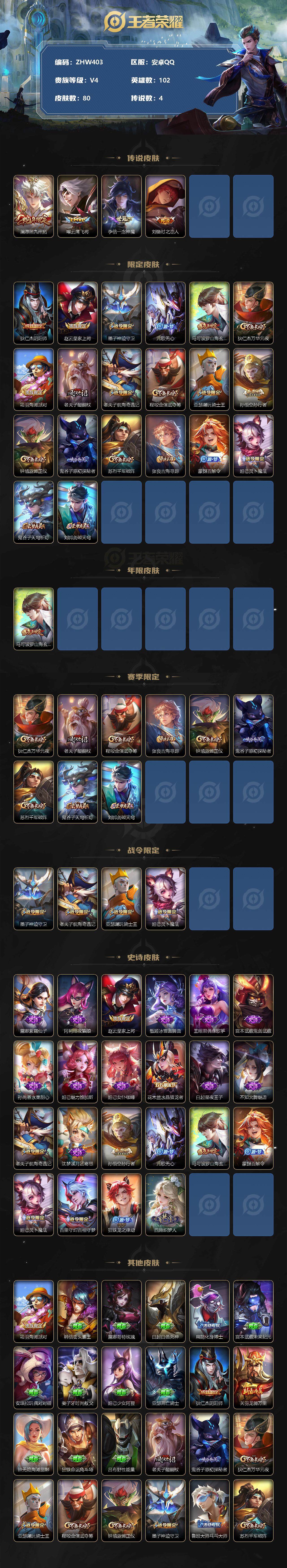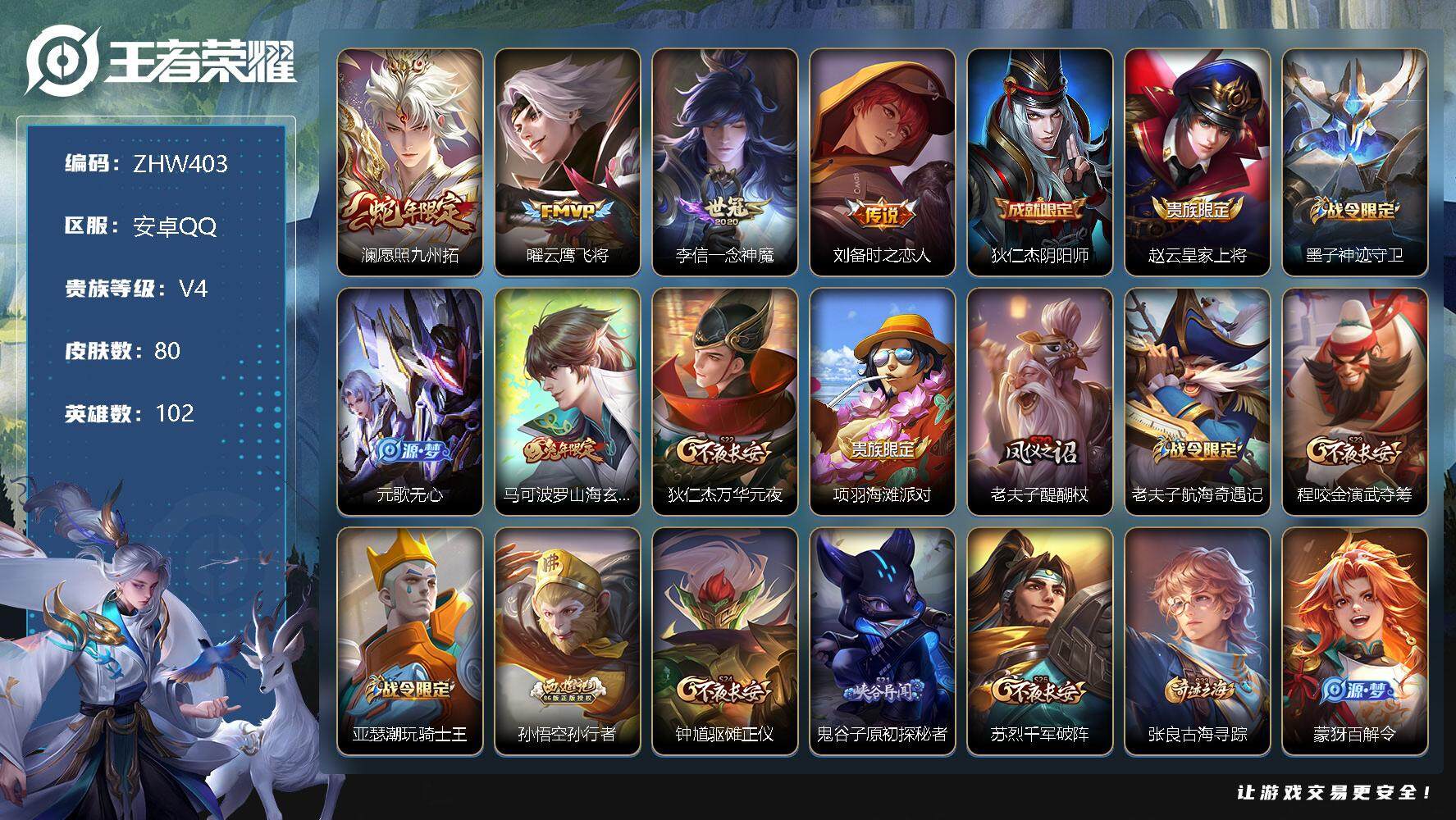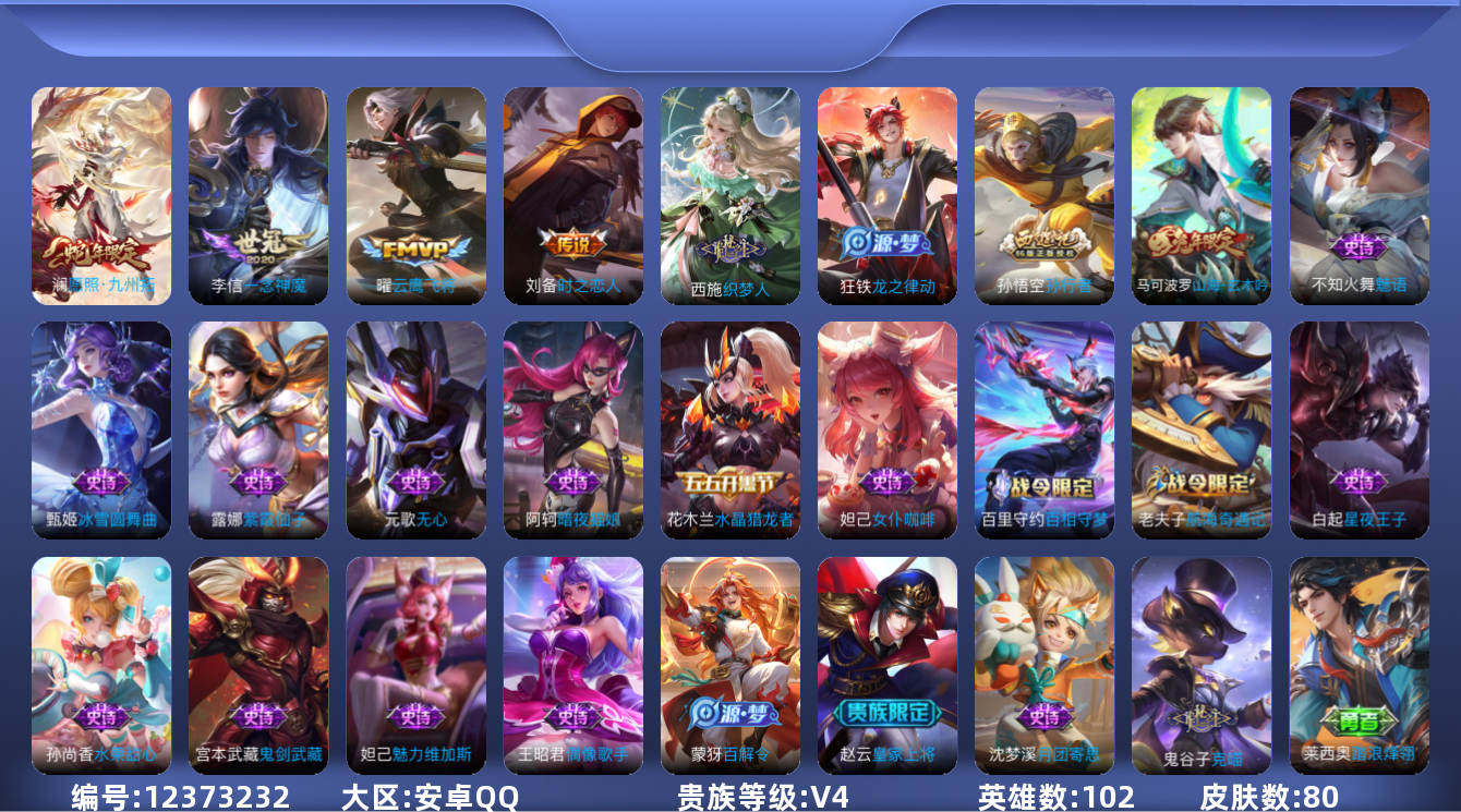 [12373232]【特价急出/详情看图】:安卓Q-V4-永恒钻石II段位-102英雄-80皮肤-4传说-21史诗