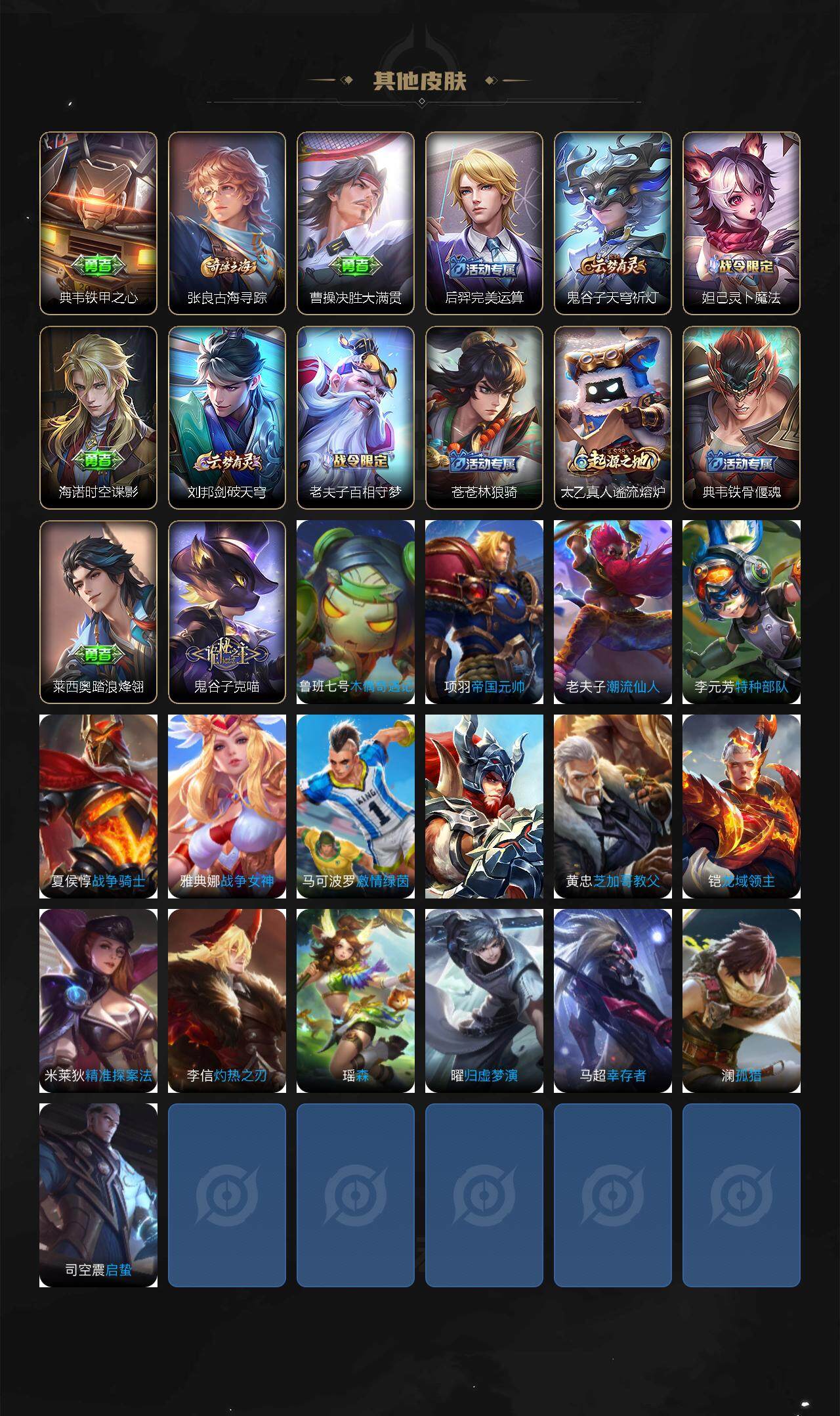 【其他皮肤】:项羽海滩派对,韩信街头霸王,露娜哥特玫瑰,白起白色死神,扁鹊化身博士,宫本武藏未来纪元,安琪拉玩偶对对碰,姜子牙时尚教父,妲己少女阿狸,亚瑟死亡骑士,狄仁杰阴阳师,关羽龙腾万里,钟无艳海滩丽影,狂铁命运角斗场,吕布野性能量,老夫子醍醐杖,鬼谷子原初探秘者,狄仁杰万华元夜,亚瑟潮玩骑士王,程咬金演武夺筹,钟馗驱傩正仪,墨子神迹守卫,鲁班大师乓乓大师,苏烈千军破阵,典韦铁甲之心,张良古海寻踪,曹操决胜大满贯,后羿完美运算,鬼谷子天穹祈灯,妲己灵卜魔法,海诺时空谍影,刘邦剑破天穹,老夫子百相守梦,苍苍林狼骑,太乙真人谧流熔炉,典韦铁骨偃魂,莱西奥踏浪烽翎,鬼谷子克喵,鲁班七号木偶奇遇记,项羽帝国元帅,老夫子潮流仙人,李元芳特种部队,夏侯惇战争骑士,雅典娜战争女神,马可波罗激情绿茵,苍维京掠夺者,黄忠芝加哥教父,铠龙域领主,米莱狄精准探案法,李信灼热之刃,瑶森,曜归虚梦演,马超幸存者,澜孤猎,司空震启蛰