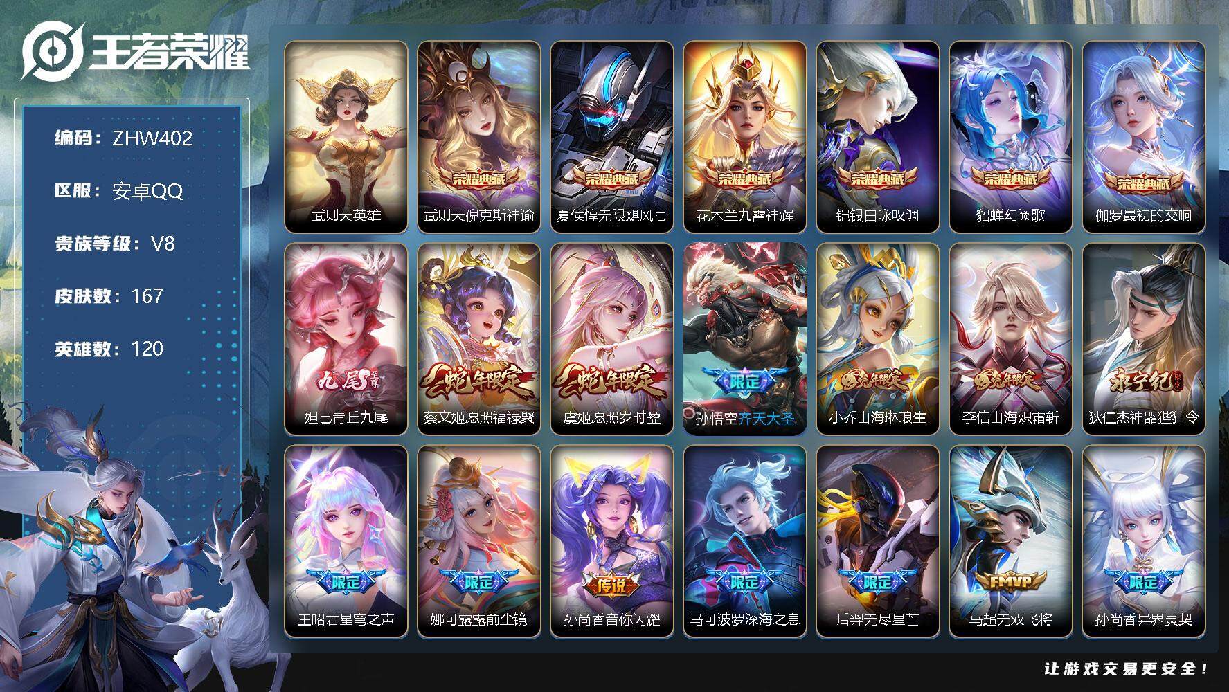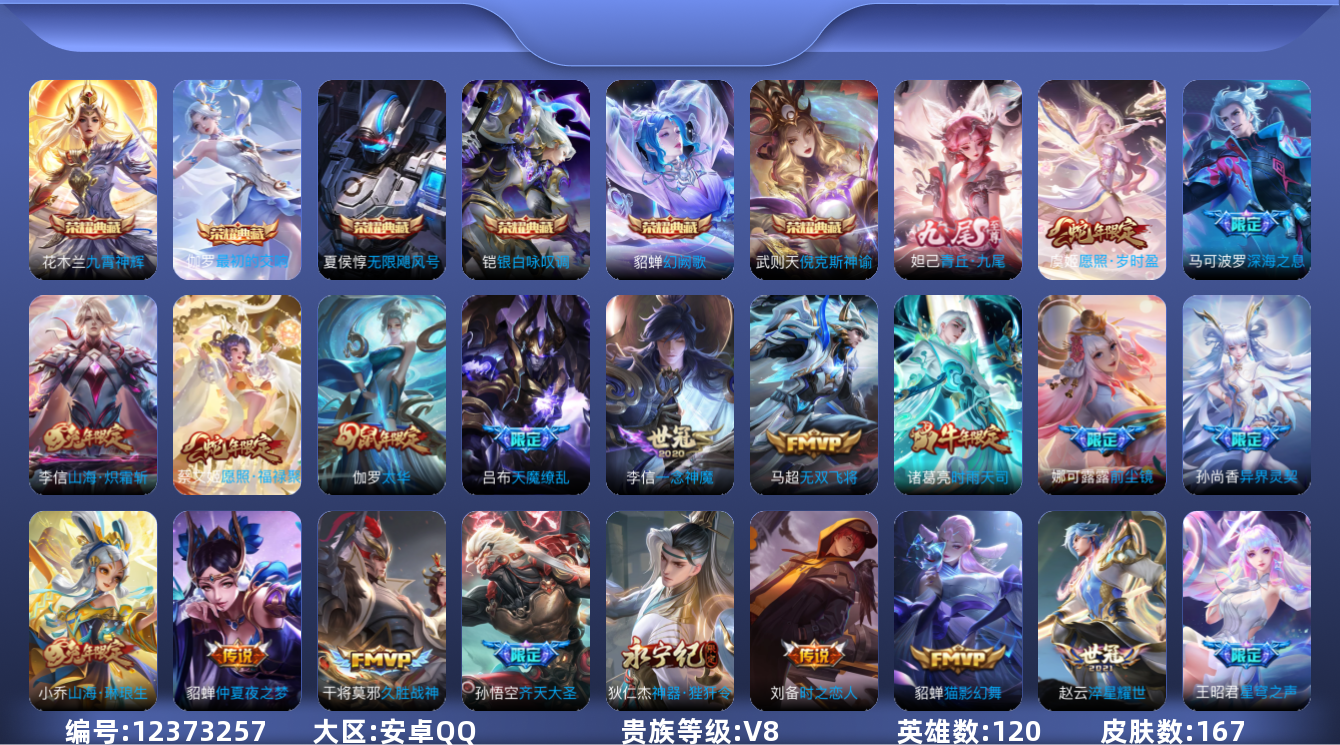 [12373257]【商品标题】:安卓Q-V8-最强王者段位-120英雄-167皮肤-6典藏-1无双-26传说-42史诗