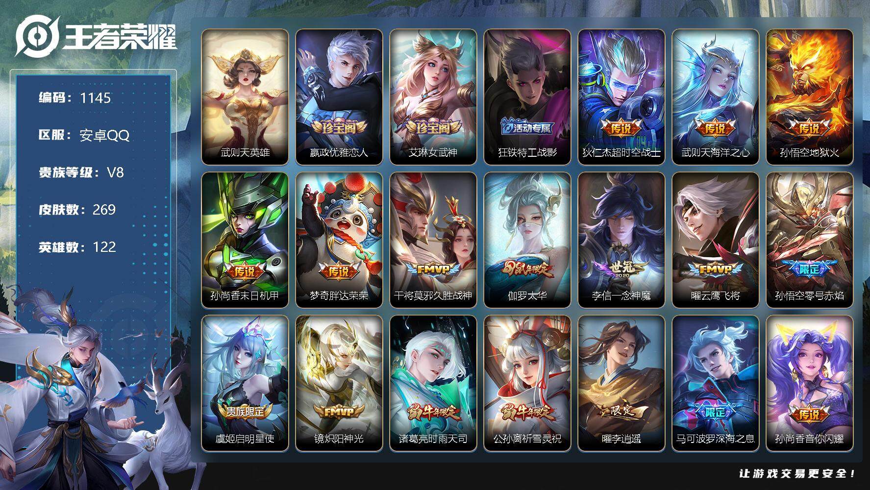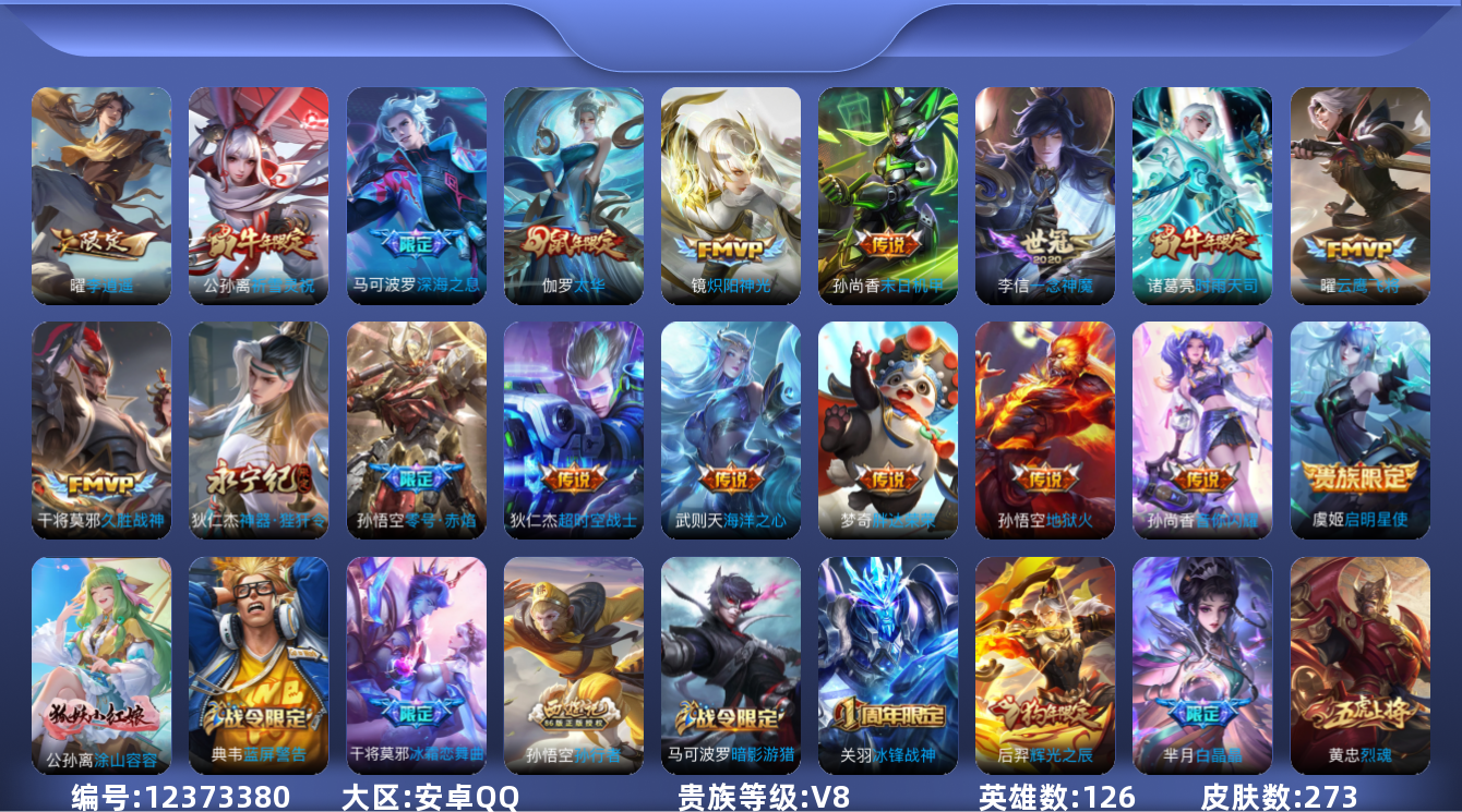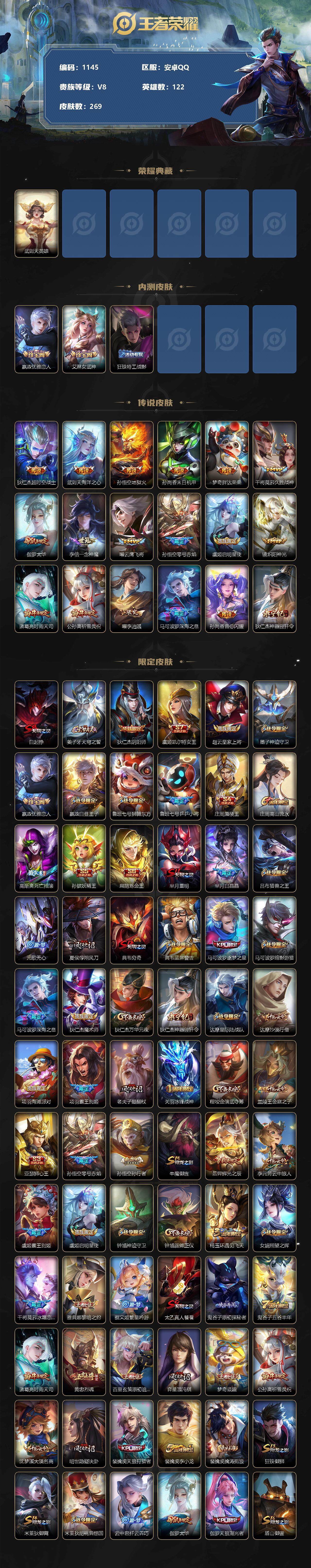 [12373380]【商品标题】:安卓Q-V8-永恒钻石III段位-122英雄-269皮肤-0典藏-0珍品无双-0无双-0珍品传说-18传说-71史诗