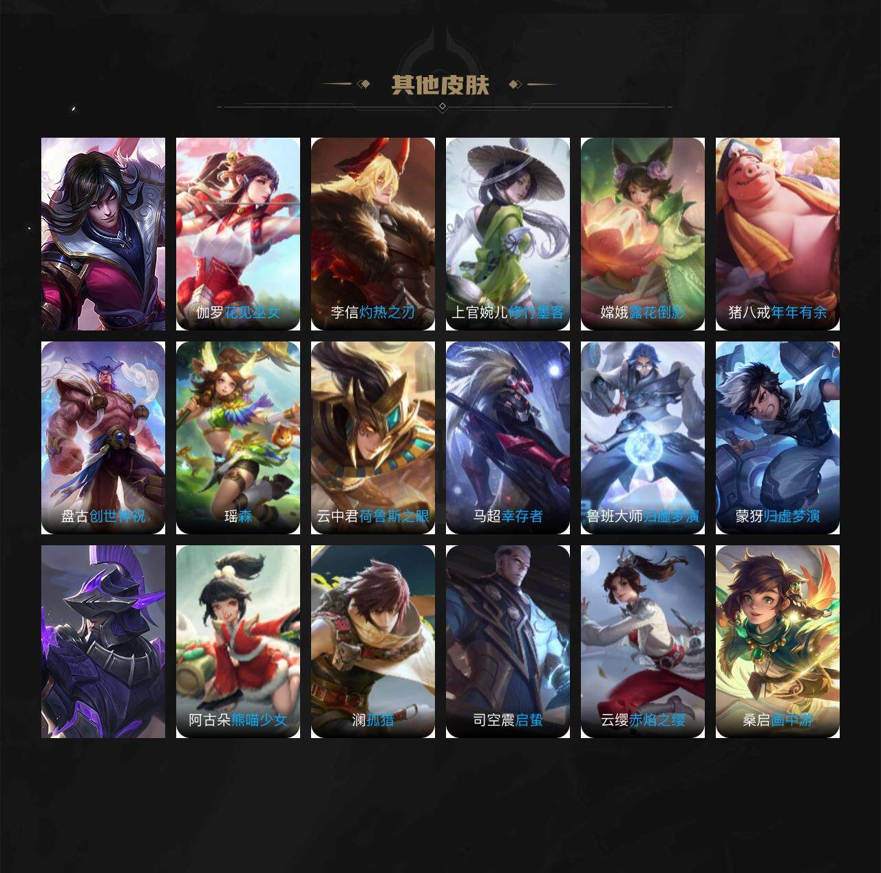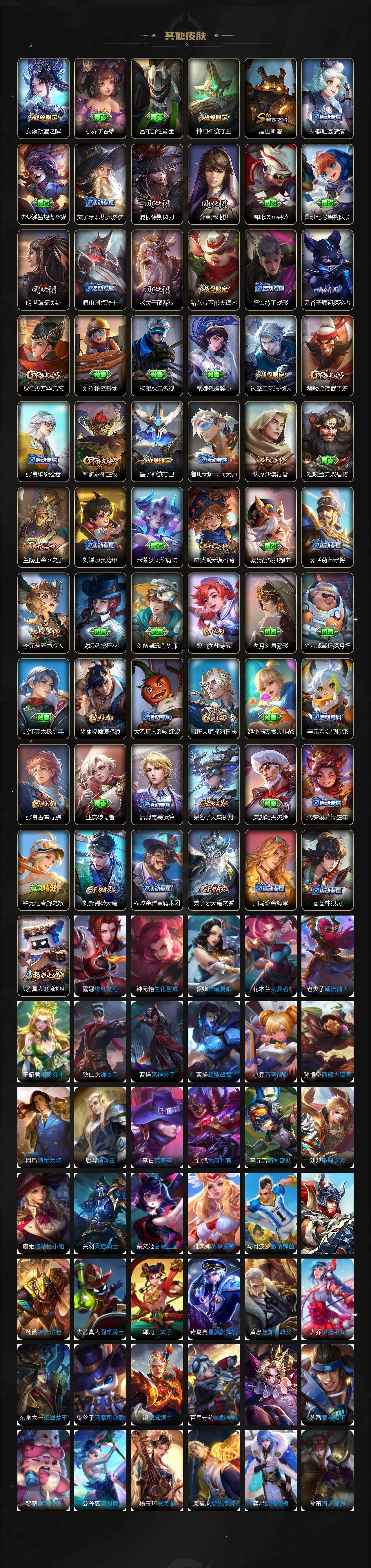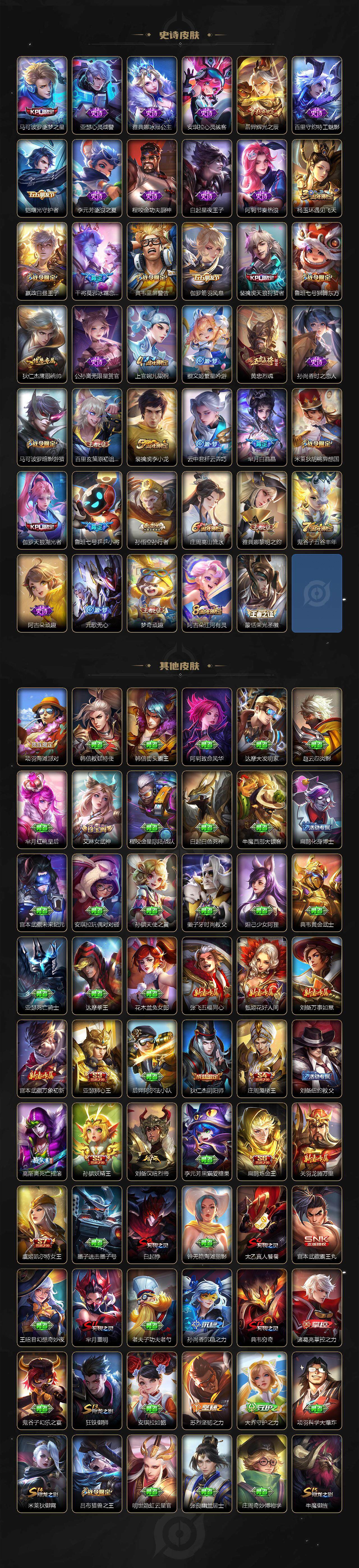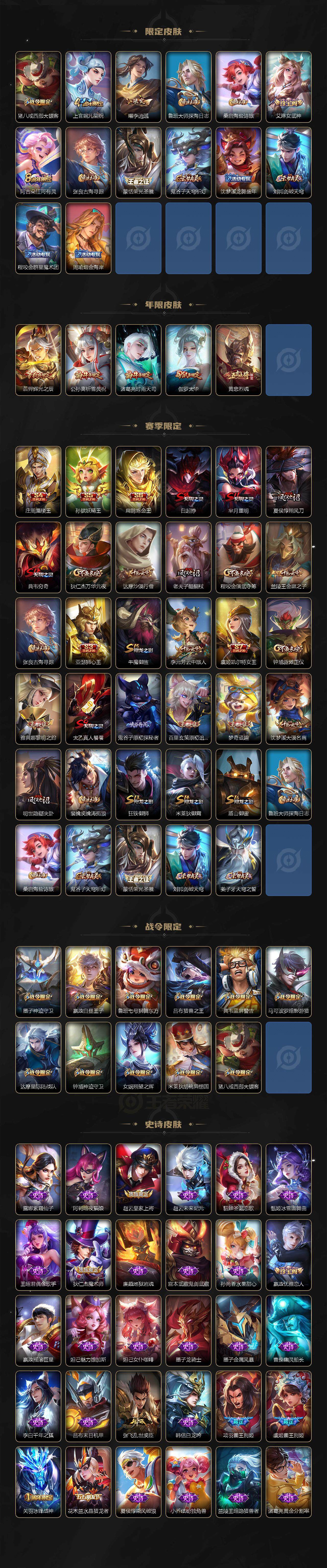 【限定皮肤】:白起狰,姜子牙天穹之誓,狄仁杰阴阳师,虞姬凯尔特女王,赵云皇家上将,墨子神迹守卫,嬴政优雅恋人,嬴政白昼王子,鲁班七号狮舞东方,鲁班七号乒乒小将,庄周蜃楼王,庄周高山流水,高渐离死亡摇滚,孙膑妖精王,扁鹊炼金王,芈月重明,芈月白晶晶,吕布猎兽之王,元歌无心,夏侯惇朔风刀,典韦穷奇,典韦蓝屏警告,马可波罗逐梦之星,马可波罗暗影游猎,马可波罗深海之息,狄仁杰魔术师,狄仁杰万华元夜,狄仁杰神器狴犴令,达摩星际陆战队,达摩沙漠行僧,项羽海滩派对,项羽霸王别姬,老夫子醍醐杖,关羽冰锋战神,程咬金演武夺筹,兰陵王金庭之子,亚瑟狮心王,孙悟空零号赤焰,孙悟空孙行者,牛魔御旌,后羿辉光之辰,李元芳云中旅人,虞姬霸王别姬,虞姬启明星使,钟馗神迹守卫,钟馗驱傩正仪,杨玉环遇见飞天,女娲朔望之晖,干将莫邪冰霜恋舞曲,雅典娜黎明之约,蔡文姬繁星吟游,太乙真人饕餮,鬼谷子原初探秘者,鬼谷子五谷丰年,诸葛亮时雨天司,黄忠烈魂,百里玄策原初追逐者,弈星混沌棋,梦奇顽趣,公孙离祈雪灵祝,沈梦溪大漠名商,明世隐疑决卦,裴擒虎天狼狩猎者,裴擒虎李小龙,裴擒虎擒涛扼浪,狂铁御狮,米莱狄御霄,米莱狄胡桃异想国,云中君纤云弄巧,伽罗太华,伽罗天狼溯光者,盾山御銮,猪八戒西部大镖客,上官婉儿梁祝,曜李逍遥 ,鲁班大师探海日志,桑启海盐诗旅,艾琳女武神,阿古朵江河有灵,张良古海寻踪,蒙恬荣光圣徽,鬼谷子天穹祈灯,沈梦溪龙舞盛年,刘邦剑破天穹,程咬金群星魔术团,周瑜熔金海岸
