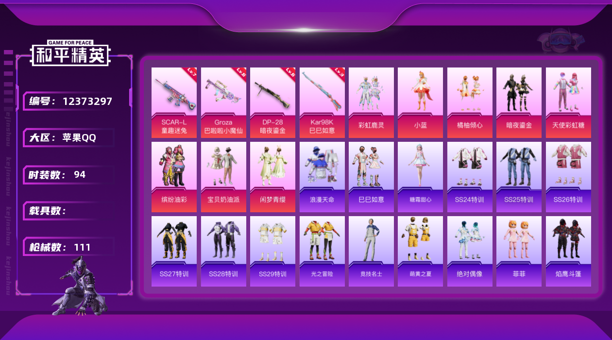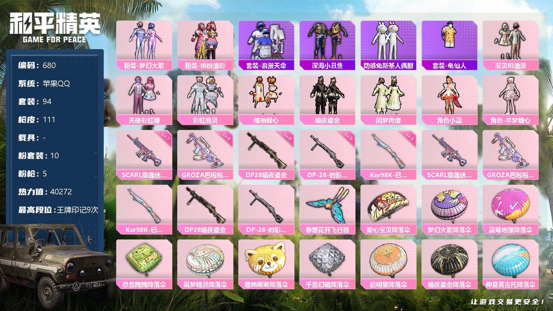 [12373297]【商品标题】:苹果 手Q-10粉装-5特效枪-0载具-1粉色飞行器-40272热力值-9王牌印记-94套装-111枪皮