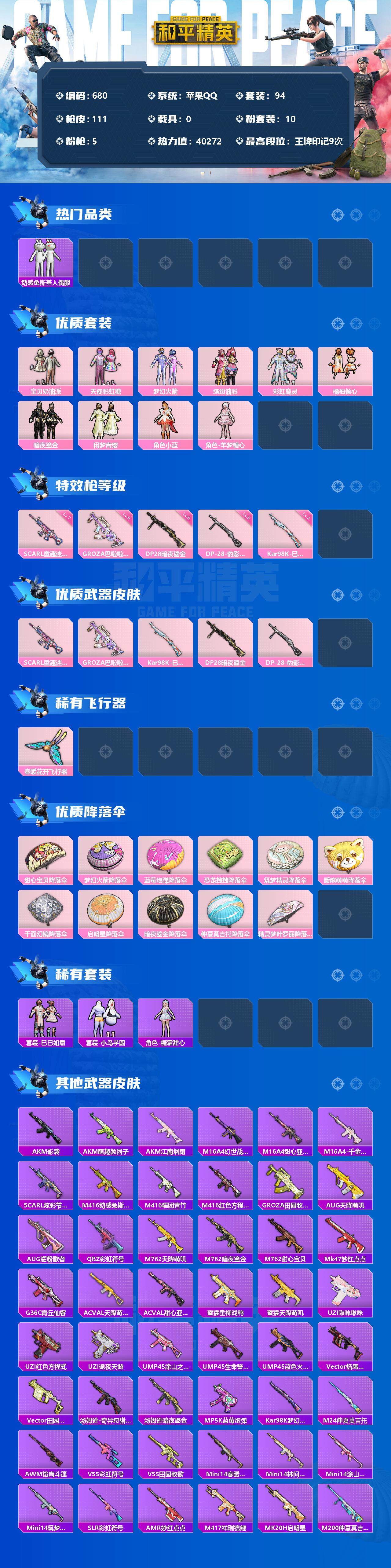 [12373297]【商品标题】:苹果 手Q-10粉装-5特效枪-0载具-1粉色飞行器-40272热力值-9王牌印记-94套装-111枪皮 【热门品类】:粉装-梦幻火箭,粉装-缤纷油彩,套装-浪漫天命,套装-深海小丑鱼,套装-动感兔斯基人偶服,套装-龟仙人 【粉色套装】:粉装-宝贝奶油派,粉装-天使彩虹糖,粉装-梦幻火箭,粉装-缤纷油彩,粉装-彩虹鹿灵,粉装-橘柚倾心,粉装-暗夜鎏金,粉装-闲梦青缨,角色-小蓝,角色-羊梦糖心 【粉色枪皮等级】:SCAR-L-童趣迷兔(七级),GROZA-巴啦啦小魔仙(六级),Kar98K-巳巳如意(三级),DP-28-暗夜鎏金(六级),DP-28-豹影疾电(五级) 【粉色枪皮】:SCAR-L-童趣迷兔,GROZA-巴啦啦小魔仙,Kar98K-巳巳如意,DP-28-暗夜鎏金,DP-28-豹影疾电 【粉色飞行器】:春暖花开飞行器 【粉色降落伞】:甜心宝贝降落伞,梦幻火箭降落伞,蓝莓炮弹降落伞,恐龙拽拽降落伞,筑梦精灵降落伞,暖熊萌萌降落伞,千面幻镜降落伞,启明星降落伞,暗夜鎏金降落伞,仲夏莫吉托降落伞,精灵梦叶罗丽降落伞 【稀有套装】:套装-龟仙人,套装-巳巳如意,套装-小鸟芋圆,角色-糖霜甜心 【稀有枪皮】:AKM-影袭,AKM-江南烟雨,AKM-萌趣颜团子,M16A4-幻世战舞者,M16A4-甜心亚梦,M16A4-千金淑猫,SCAR-L-炫彩节奏,M416-动感兔斯基,M416-糯团青竹,M416-红色方程式,GROZA-田园牧歌,AUG-天降萌叽,AUG-耀粉歌者,QBZ-彩虹符号,M762-天降萌叽,M762-暗夜鎏金,M762-甜心宝贝,Mk47-妙红点点,G36C-青丘仙客,AC-VAL-天降萌叽,AC-VAL-甜心亚梦,蜜獾-垂柳戏鸭,蜜獾-天降萌叽,UZI-啾咪啾咪,UZI-红色方程式,UZI-诡夜天鹅,UMP45-涂山之恋,UMP45-生命誓言,UMP45-蓝色火焰,Vector-焰鹰斗篷,Vector-田园牧歌,汤姆逊-奇异狩猎者,汤姆逊-暗夜鎏金,MP5K-蓝莓炮弹,Kar98K-梦幻火箭,M24-仲夏莫吉托,AWM-焰鹰斗篷,VSS-彩虹符号,VSS-田园牧歌,Mini14-春暖花开,Mini14-林间仙鹿,Mini14-涂山之恋,Mini14-筑梦精灵,SLR-彩虹符号,AMR-妙红点点,M417-祥瑞锦鲤,MK20-H-启明