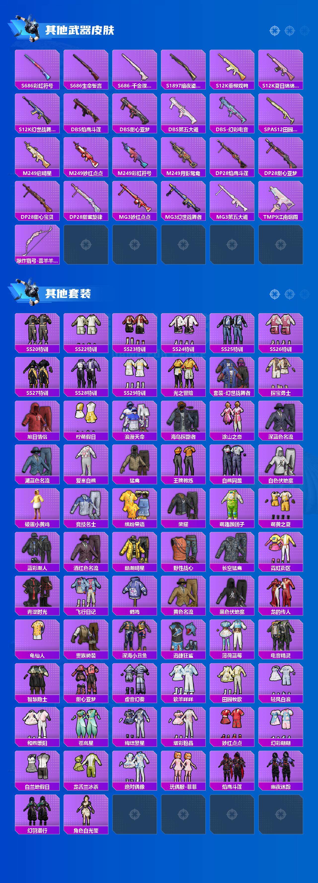 【稀有枪皮】:AKM-影袭,AKM-江南烟雨,AKM-萌趣颜团子,M16A4-幻世战舞者,M16A4-甜心亚梦,M16A4-千金淑猫,SCAR-L-炫彩节奏,M416-动感兔斯基,M416-糯团青竹,M416-红色方程式,GROZA-田园牧歌,AUG-天降萌叽,AUG-耀粉歌者,QBZ-彩虹符号,M762-天降萌叽,M762-暗夜鎏金,M762-甜心宝贝,Mk47-妙红点点,G36C-青丘仙客,AC-VAL-天降萌叽,AC-VAL-甜心亚梦,蜜獾-垂柳戏鸭,蜜獾-天降萌叽,UZI-啾咪啾咪,UZI-红色方程式,UZI-诡夜天鹅,UMP45-涂山之恋,UMP45-生命誓言,UMP45-蓝色火焰,Vector-焰鹰斗篷,Vector-田园牧歌,汤姆逊-奇异狩猎者,汤姆逊-暗夜鎏金,MP5K-蓝莓炮弹,Kar98K-梦幻火箭,M24-仲夏莫吉托,AWM-焰鹰斗篷,VSS-彩虹符号,VSS-田园牧歌,Mini14-春暖花开,Mini14-林间仙鹿,Mini14-涂山之恋,Mini14-筑梦精灵,SLR-彩虹符号,AMR-妙红点点,M417-祥瑞锦鲤,MK20-H-启明