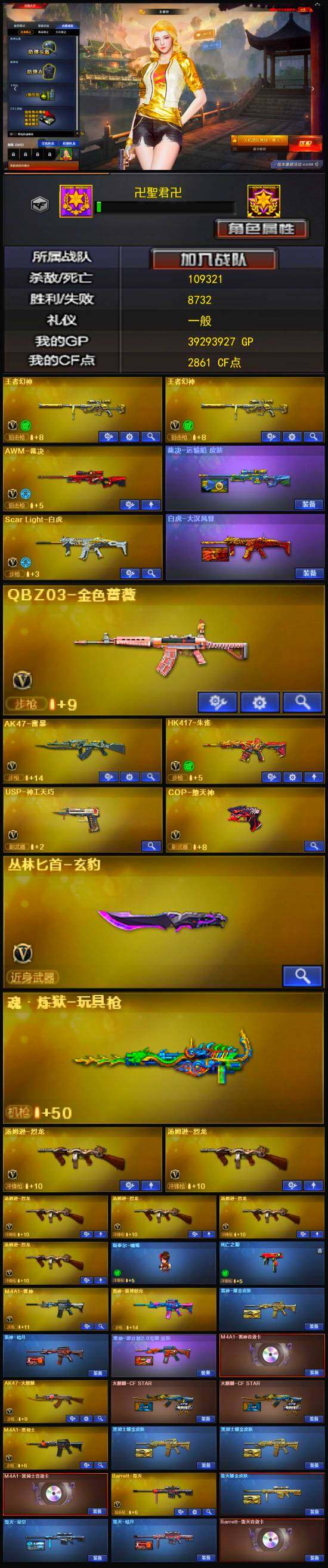 【热门武器】:QBZ03-金色蔷薇,Scar Light-白虎,HK417-朱雀,死亡之眼,M4A1-黑骑士,汤姆逊-烈龙*6,斯泰尔-蝴蝶,火麒麟-绝迹,COP-堕天神,沙鹰-修罗*2