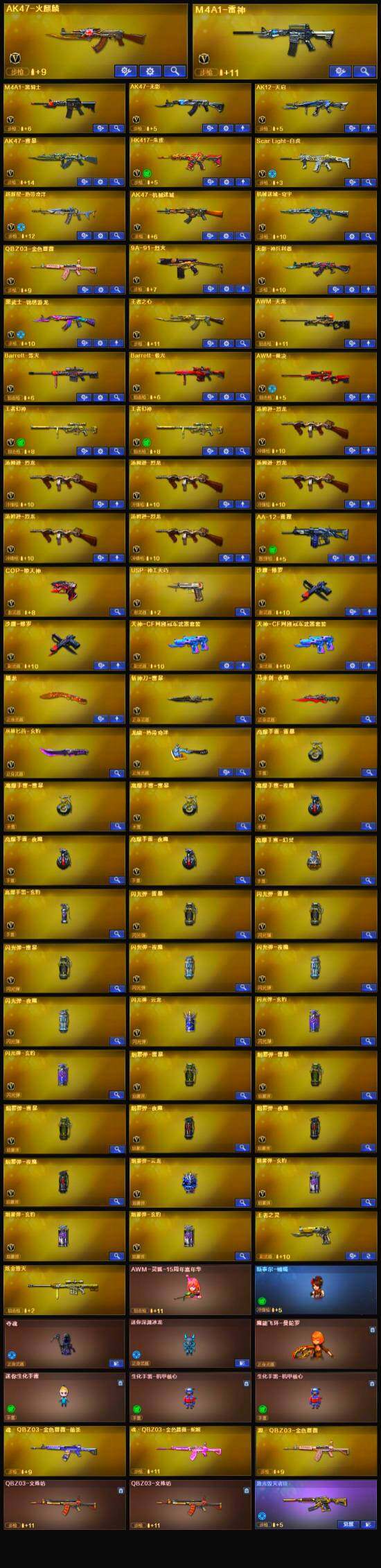 【英雄级武器】:USP-神工天巧,马来剑-夜魔,COP-堕天神,AK47-雷暴,斩神刀-雷暴,QBZ03-金色蔷薇,Scar Light-白虎,HK417-朱雀,无影-神兵利器,M4A1-雷神,M4A1-黑骑士,汤姆逊-烈龙*6,AK47-无影,AK47-火麒麟,AK12-天启,AWM-天龙,Barrett-毁灭,Barrett-极光,AWM-裁决,AK47-机械迷城,AA-12-雷霆,黑武士-锦绣游龙,超新星-热带奇洋,AK-47-猩红传说,沙鹰-修罗*2,屠龙,龙啸-热带奇洋