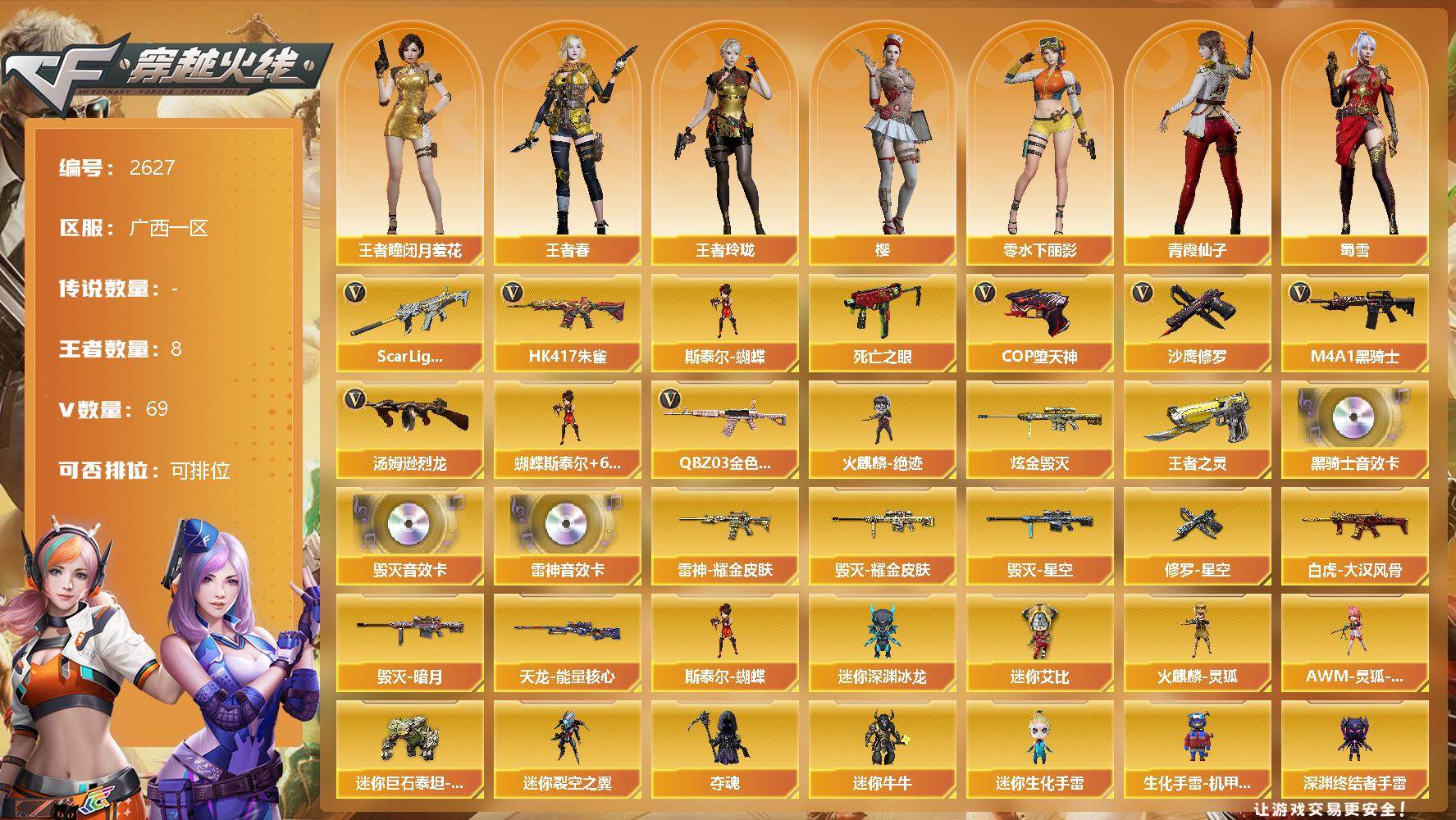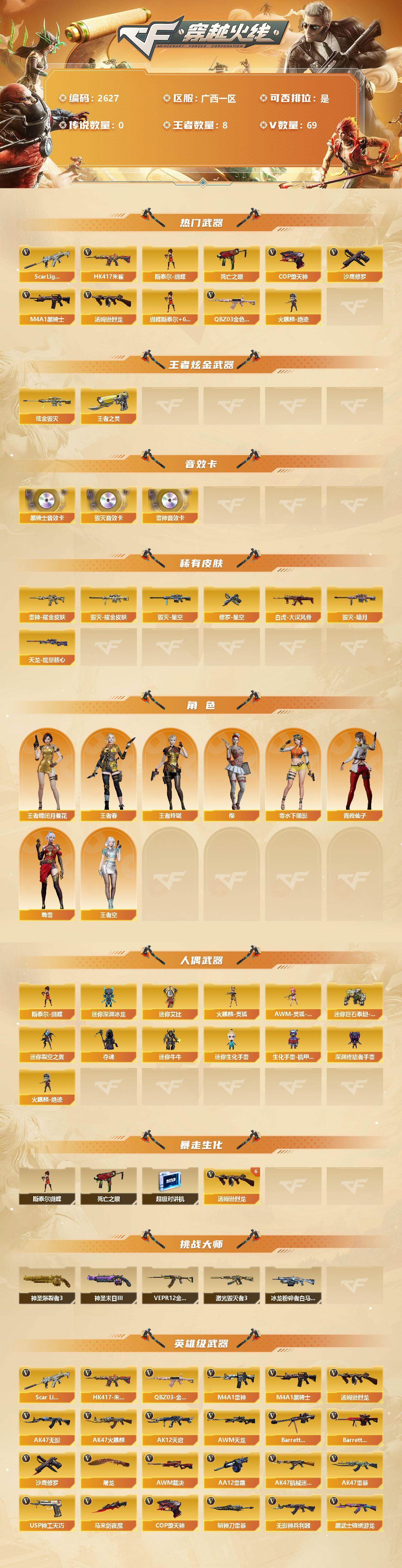 [12373812]【商品标题】:广西一区-69V-8王者-1炫金 【热门武器】:QBZ03-金色蔷薇,Scar Light-白虎,HK417-朱雀,死亡之眼,M4A1-黑骑士,汤姆逊-烈龙*6,斯泰尔-蝴蝶,火麒麟-绝迹,COP-堕天神,沙鹰-修罗*2 【王者炫金武器】:炫金毁灭,王者之灵 【音效卡】:M4A1-雷神音效卡,M4A1-黑骑士音效卡,Barrett-毁灭音效卡 【稀有皮肤】:白虎-大汉风骨,雷神-耀金皮肤,毁灭-暗月,毁灭耀金皮肤,毁灭-星空,天龙-能量核心,修罗-星空 【角色】:王者-瞳-闭月羞花,王者春,王者玲珑,王者空,零-水下丽影,樱,蜀雪,青霞仙子 【人偶武器】:火麒麟-绝迹,斯泰尔-蝴蝶,火麒麟-灵狐,AWM-灵狐-15周年嘉年华,迷你深渊冰龙,迷你艾比,迷你巨石泰坦-魔花研究所,迷你裂空之翼,夺魂,迷你牛牛*2,迷你生化手雷,生化手雷-机甲核心*2,深渊终结者手雷*2 【暴走生化】:斯泰尔-蝴蝶,死亡之眼,超级对讲机 【挑战大师】:神圣爆裂者III*2,神圣爆裂者-末日III,激光毁灭者III,VEPR-12-金魔,冰龙粉碎者-白马银枪 【英雄级武器】:USP-神工天巧,马来剑-夜魔,COP-堕天神,AK47-雷暴,斩神刀-雷暴,QBZ03-金色蔷薇,Scar Light-白虎,HK417-朱雀,无影-神兵利器,M4A1-雷神,M4A1-黑骑士,汤姆逊-烈龙*6,AK47-无影,AK47-火麒麟,AK12-天启,AWM-天龙,Barrett-毁灭,Barrett-极光,AWM-裁决,AK47-机械迷城,AA-12-雷霆,黑武士-锦绣游龙,超新星-热带奇洋,AK-47-猩红传说,沙鹰-修罗*2,屠龙,龙啸-热带奇洋 【特殊枪械】:蝴蝶斯泰尔+6烈龙,1白虎,1黑骑士,6烈龙,1蝴蝶斯泰尔