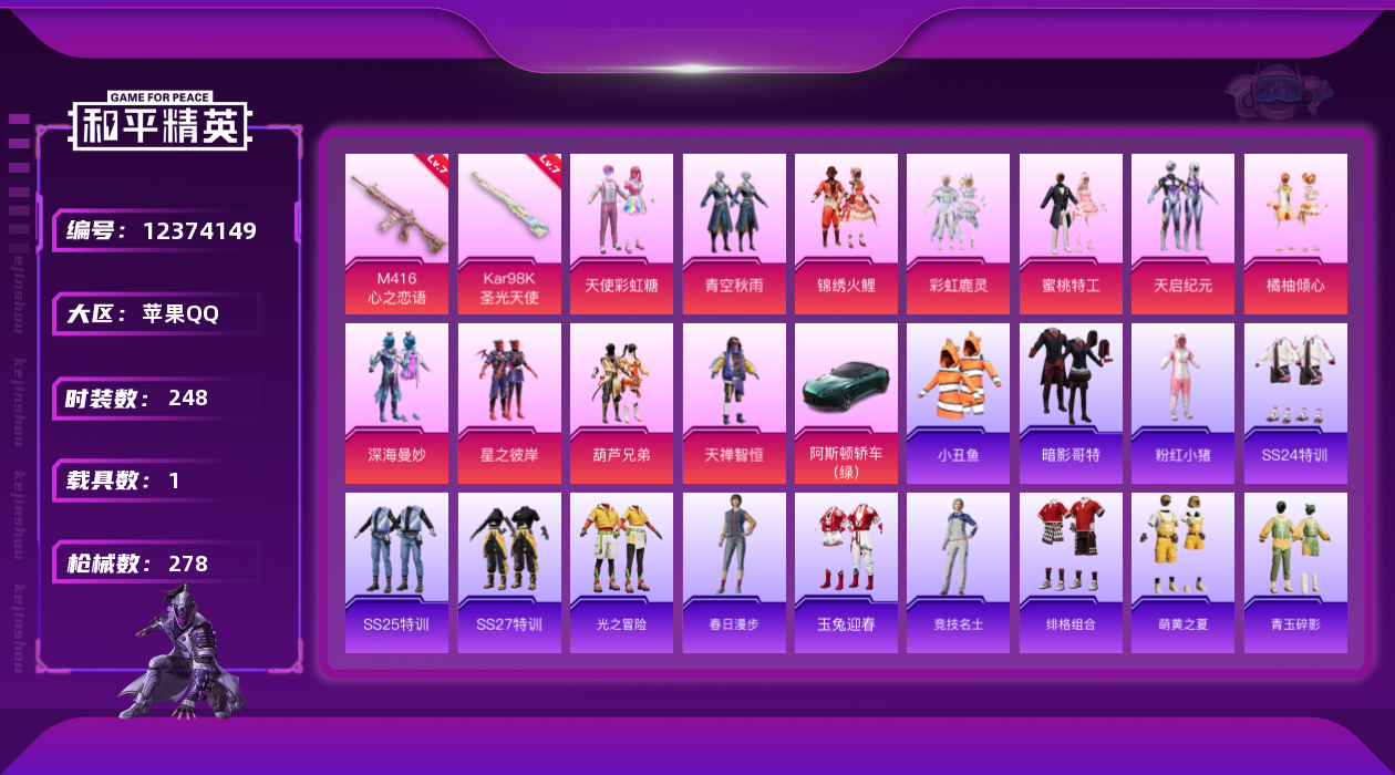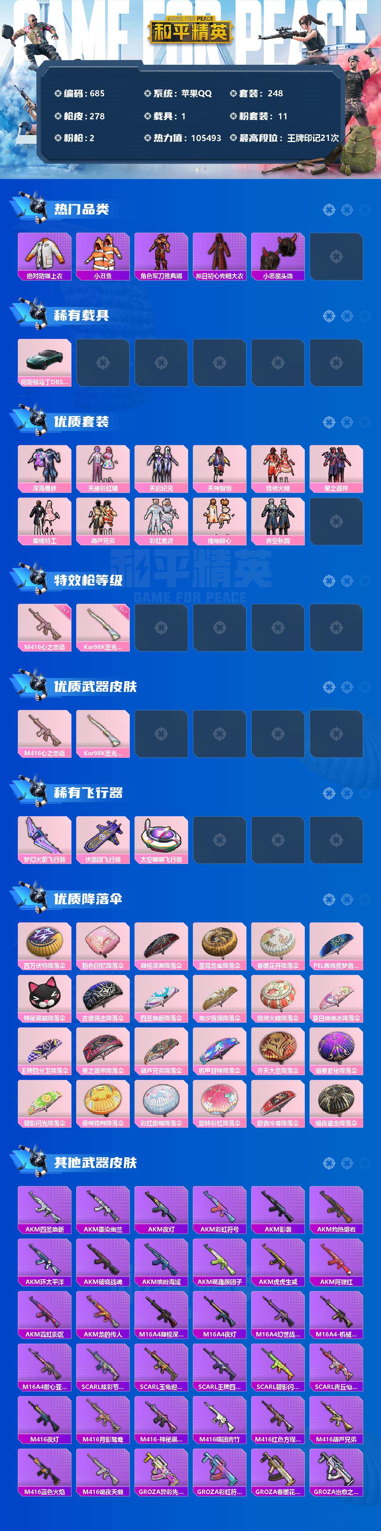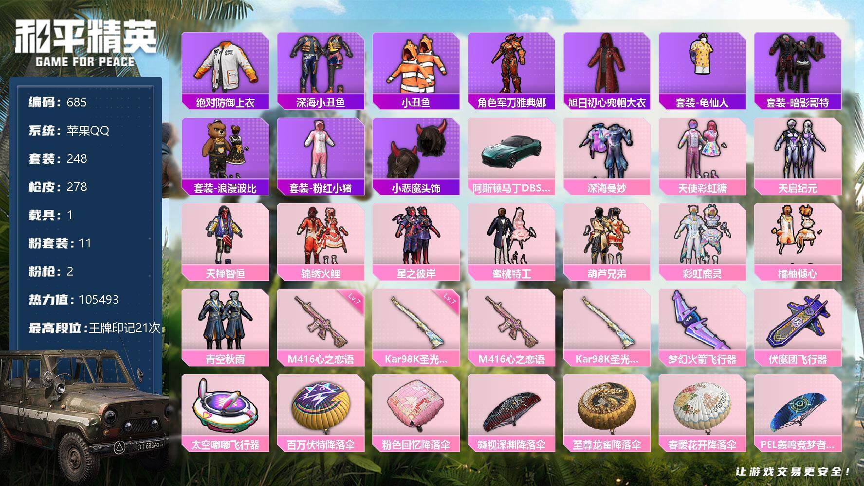 [12374149]【商品标题】:苹果 手Q-11粉装-2特效枪-1载具-3粉色飞行器-105493热力值-21王牌印记-248套装-278枪皮