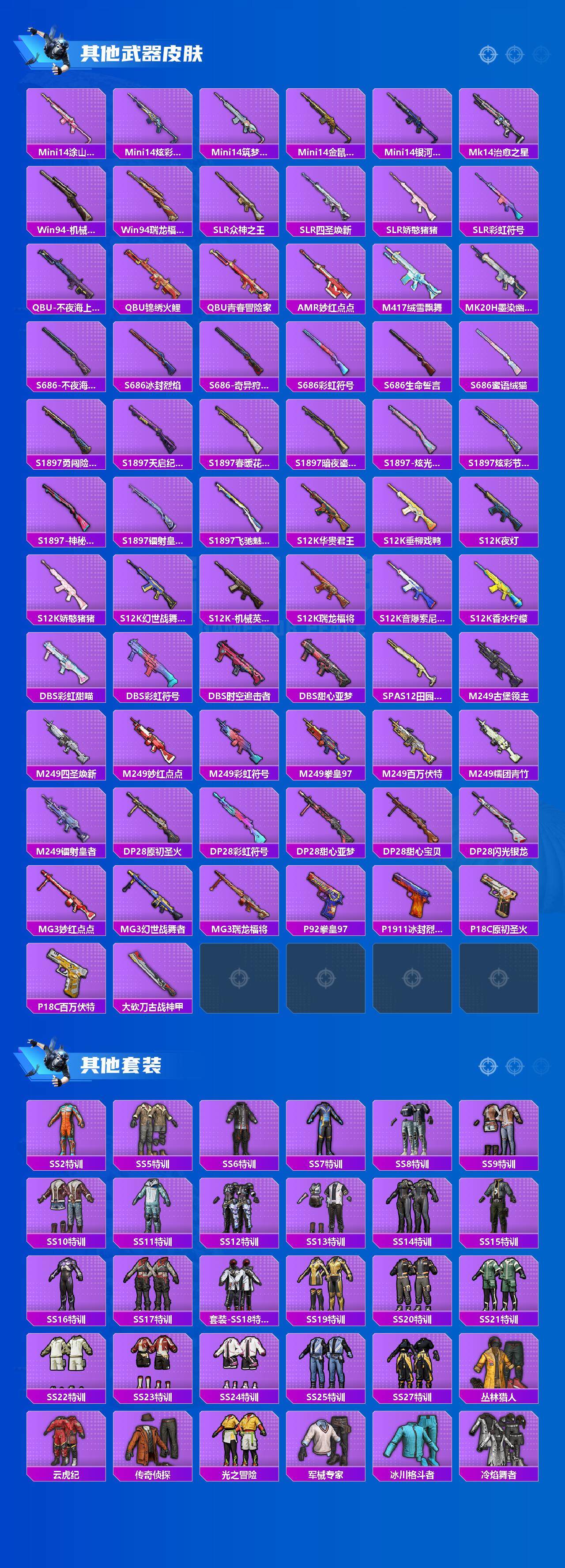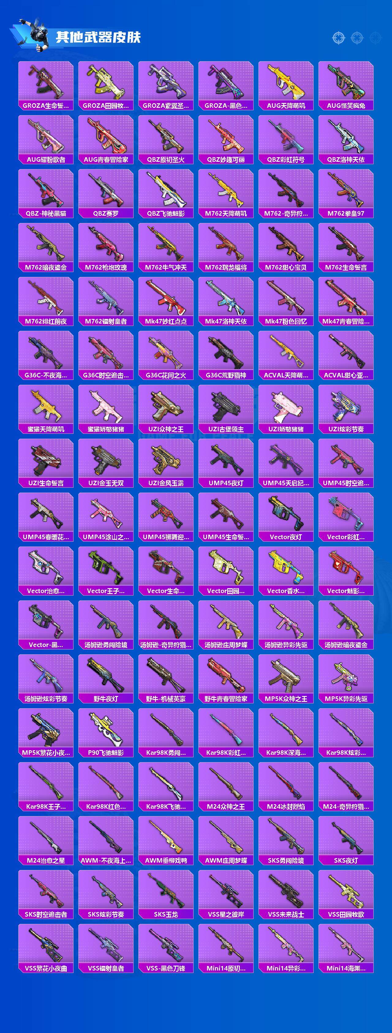 【稀有枪皮】:AKM-四圣焕新,AKM-墨染幽兰,AKM-夜灯,AKM-彩虹符号,AKM-影袭,AKM-灼热熔岩,AKM-环太平洋,AKM-破晓战魂,AKM-缤纷海域,AKM-萌趣颜团子,AKM-虎虎生威,AKM-阿狸红,AKM-霓虹街区,AKM-龙的传人,M16A4-凝视深渊,M16A4-夜灯,M16A4-幻世战舞者,M16A4-机械英豪,M16A4-甜心亚梦,SCAR-L-炫彩节奏,SCAR-L-玉兔迎春,SCAR-L-王牌四分卫,SCAR-L-碧影闪光,SCAR-L-青丘仙客,M416-夜灯,M416-月影鸳鸯,M416-神秘黑猫,M416-糯团青竹,M416-红色方程式,M416-葫芦兄弟,M416-蓝色火焰,M416-诡夜天鹅,GROZA-异彩先驱,GROZA-彩虹符号,GROZA-春暖花开,GROZA-治愈之星,GROZA-生命誓言,GROZA-田园牧歌,GROZA-紫翼圣骑,GROZA-黑色刀锋,AUG-天降