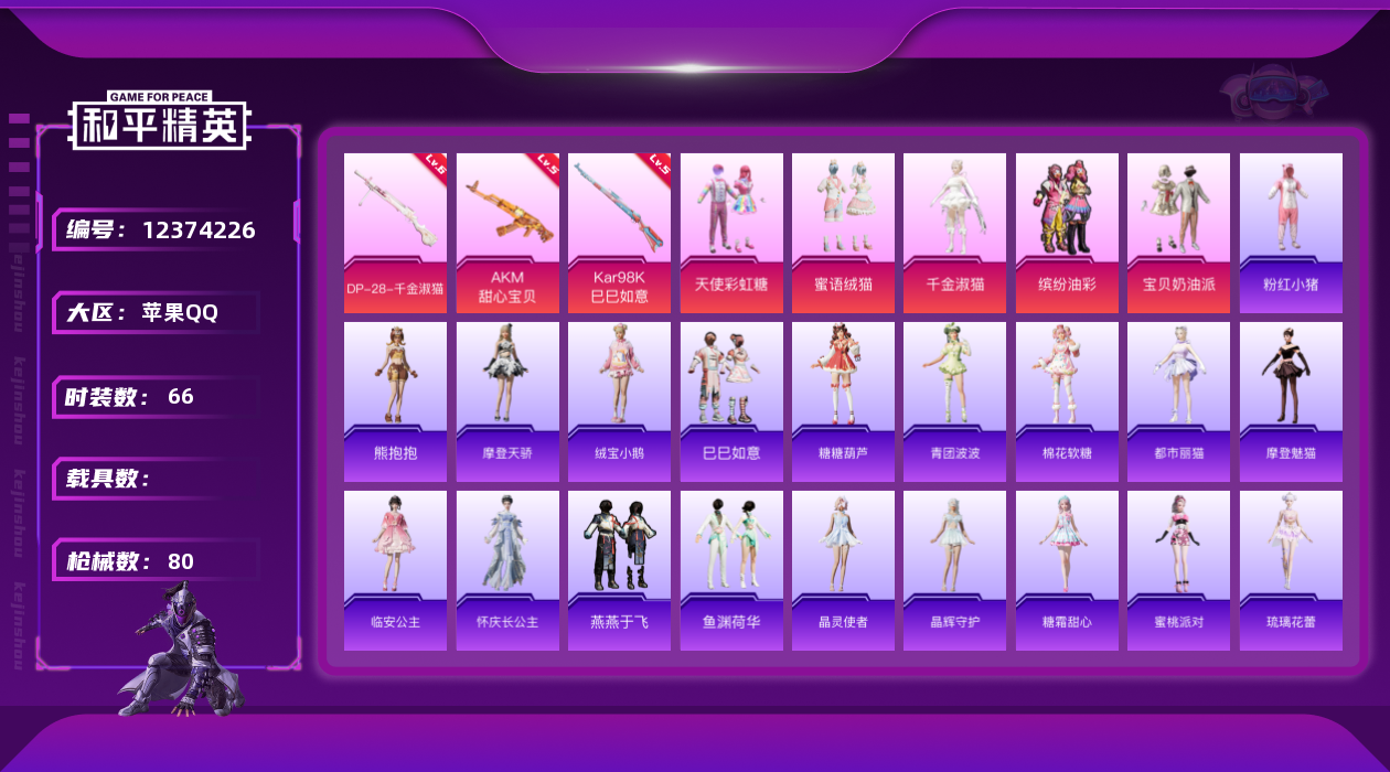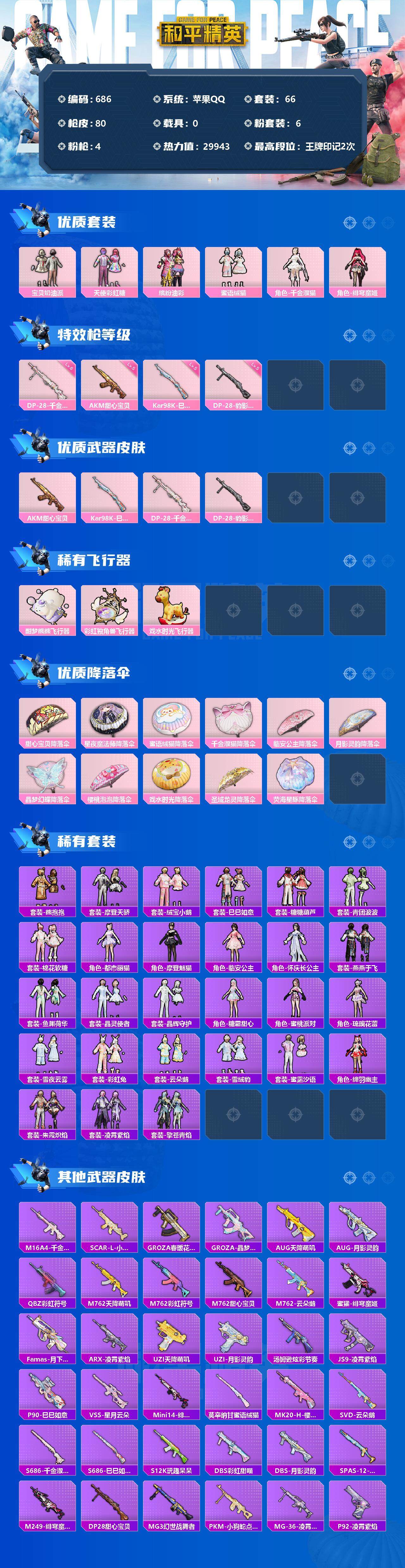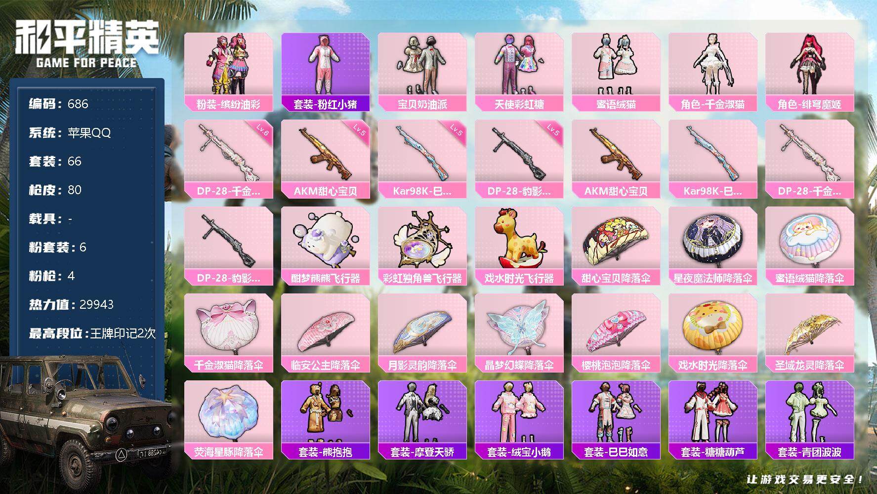 [12374226]【商品标题】:苹果 手Q-6粉装-4特效枪-0载具-3粉色飞行器-29943热力值-2王牌印记-66套装-80枪皮