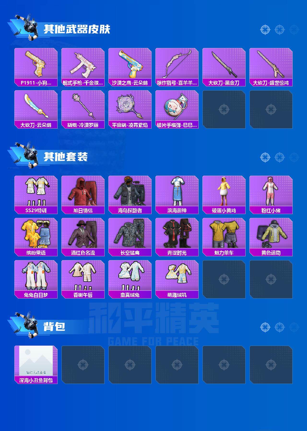 [12374226]【商品标题】:苹果 手Q-6粉装-4特效枪-0载具-3粉色飞行器-29943热力值-2王牌印记-66套装-80枪皮 【热门品类】:粉装-缤纷油彩,套装-粉红小猪 【粉色套装】:粉装-宝贝奶油派,粉装-天使彩虹糖,粉装-缤纷油彩,粉装-蜜语绒猫,角色-千金淑猫,角色-绯穹魔姬 【粉色枪皮等级】:AKM-甜心宝贝(五级),Kar98K-巳巳如意(五级),DP-28-千金淑猫(六级),DP-28-豹影疾电(五级) 【粉色枪皮】:AKM-甜心宝贝,Kar98K-巳巳如意,DP-28-千金淑猫,DP-28-豹影疾电 【粉色飞行器】:酣梦熊熊飞行器,彩虹独角兽飞行器,戏水时光飞行器 【粉色降落伞】:甜心宝贝降落伞,星夜魔法师降落伞,蜜语绒猫降落伞,千金淑猫降落伞,临安公主降落伞,月影灵韵降落伞,晶梦幻蝶降落伞,樱桃泡泡降落伞,戏水时光降落伞,圣域龙灵降落伞,荧海星豚降落伞 【稀有套装】:套装-熊抱抱,套装-摩登天骄,套装-绒宝小鹅,套装-巳巳如意,套装-糖糖葫芦,套装-青团波波,套装-棉花软糖,角色-都市丽猫,角色-摩登魅猫,角色-临安公主,角色-怀庆长公主,套装-燕燕于飞,套装-鱼渊荷华,套装-晶灵使者,套装-晶辉守护,角色-糖霜甜心,角色-蜜桃派对,角色-琉璃花蕾,套装-雪夜云雾,套装-彩虹兔,套装-云朵鹅,套装-雪绒豹,套装-蜜露汐语,角色-绛羽幽主,套装-朱霞炽焰,套装-凌霄紫焰,套装-擎苍青焰 【稀有枪皮】:M16A4-千金淑猫,SCAR-L-小狗蛇点点,GROZA-春暖花开,GROZA-晶梦幻蝶,AUG-天降萌叽,AUG-月影灵韵,QBZ-彩虹符号,M762-天降萌叽,M762-彩虹符号,M762-甜心宝贝,M762-云朵鹅,蜜獾-绯穹魔姬,Famas-月下星之子,ARX-凌霄紫焰,UZI-天降萌叽,UZI-月影灵韵,汤姆逊-炫彩节奏,JS9-凌霄紫焰,P90-巳巳如意,VSS-星月云朵,Mini14-绯穹魔姬,莫辛纳甘-蜜语绒猫,MK20-H-樱桃泡泡,SVD-云朵鹅,S686-巳巳如意,S686-千金淑猫,S12K-玩趣呆呆,DBS-彩虹甜喵,DBS-月影灵韵,SPAS-12-云朵鹅,M249-绯穹魔姬,DP-28-甜心宝贝,MG3-幻世战舞者,PKM-小狗蛇点点,MG-36-凌霄紫焰,P92-凌霄紫焰,P1911-小狗蛇点点,蝎式手枪-千金淑猫,沙漠之鹰-云