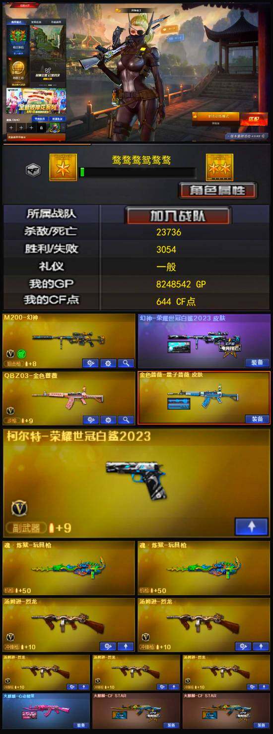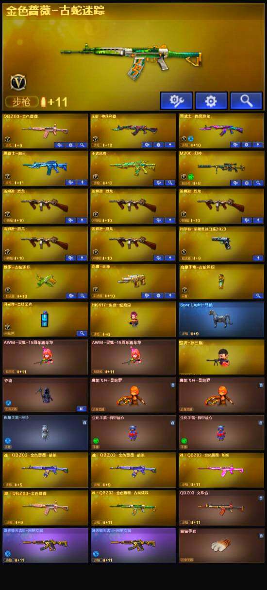 【热门武器】:QBZ03-金色蔷薇,M200-幻神,柯尔特-荣耀世冠白鲨2023,金色蔷薇-古蛇迷踪,修罗-古蛇迷踪,金色小号,汤姆逊-烈龙*5,毁灭-孙三炮,COP-白鲨