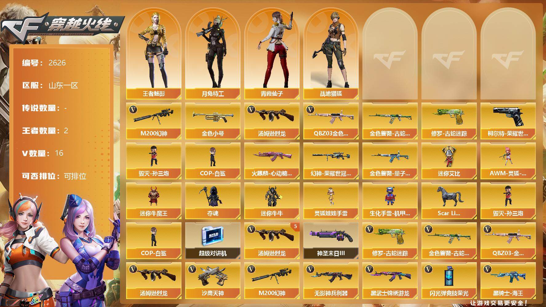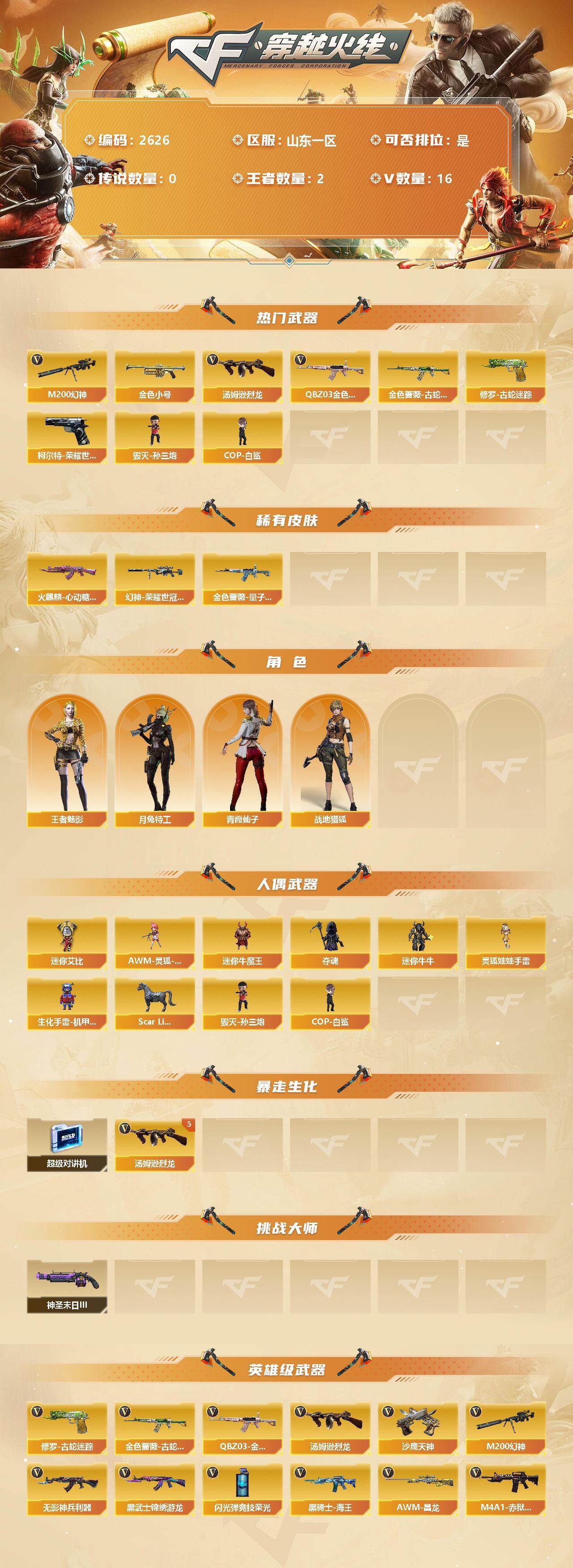 [12374228]【商品标题】:山东一区-16V-2王者-0炫金 【热门武器】:QBZ03-金色蔷薇,M200-幻神,柯尔特-荣耀世冠白鲨2023,金色蔷薇-古蛇迷踪,修罗-古蛇迷踪,金色小号,汤姆逊-烈龙*5,毁灭-孙三炮,COP-白鲨 【稀有皮肤】:幻神-荣耀世冠白鲨2023 皮肤,金色蔷薇-量子蔷薇 皮肤,火麒麟-心动糖果 【角色】:王者-魅影,月兔特工,战地猎狐,青霞仙子 【人偶武器】:COP-白鲨,毁灭-孙三炮,AWM-灵狐-15周年嘉年华*2,Scar Light-马枪,迷你艾比,迷你牛魔王,夺魂,迷你牛牛,灵狐娃娃手雷,生化手雷-机甲核心*2 【暴走生化】:超级对讲机 【挑战大师】:神圣爆裂者-末日III 【英雄级武器】:闪光弹-竞技荣光,QBZ03-金色蔷薇,金色蔷薇-古蛇迷踪,无影-神兵利器,汤姆逊-烈龙*5,M200-幻神,黑武士-锦绣游龙,黑骑士-海王,AWM-昌龙,M4A1-赤狱骑士,修罗-古蛇迷踪,沙鹰-天神 【特殊枪械】:5烈龙