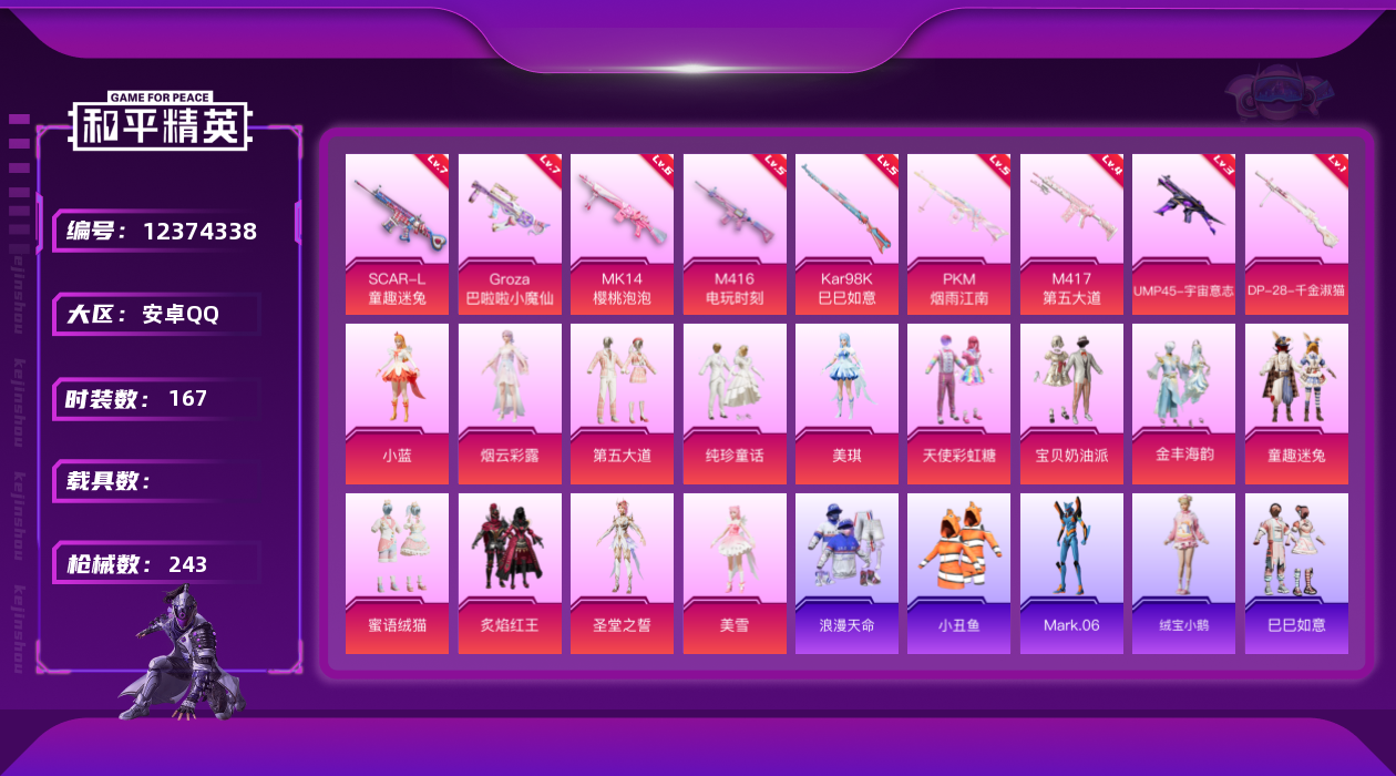 - PX_2095635- 苹果手Q-12王牌印记-19粉装-15特效枪-5载具-93383热力值-177套装-234枪皮-3卓越印记-0传奇印记 【19粉装】,梦幻火箭,宝贝奶油派,缤纷油彩,放客神游,幻海仙踪,星穹咏叹调,智耀战神,千金淑猫,海渊国主,猩猩队长,圣光天使,霞光圣骑,寒光使者,樱桃泡泡,牡丹亭·游园,铁血龙王,海螺星光,未来歌姬,金丰海韵 【15特效枪】SCAR-L-机甲封神-7级
