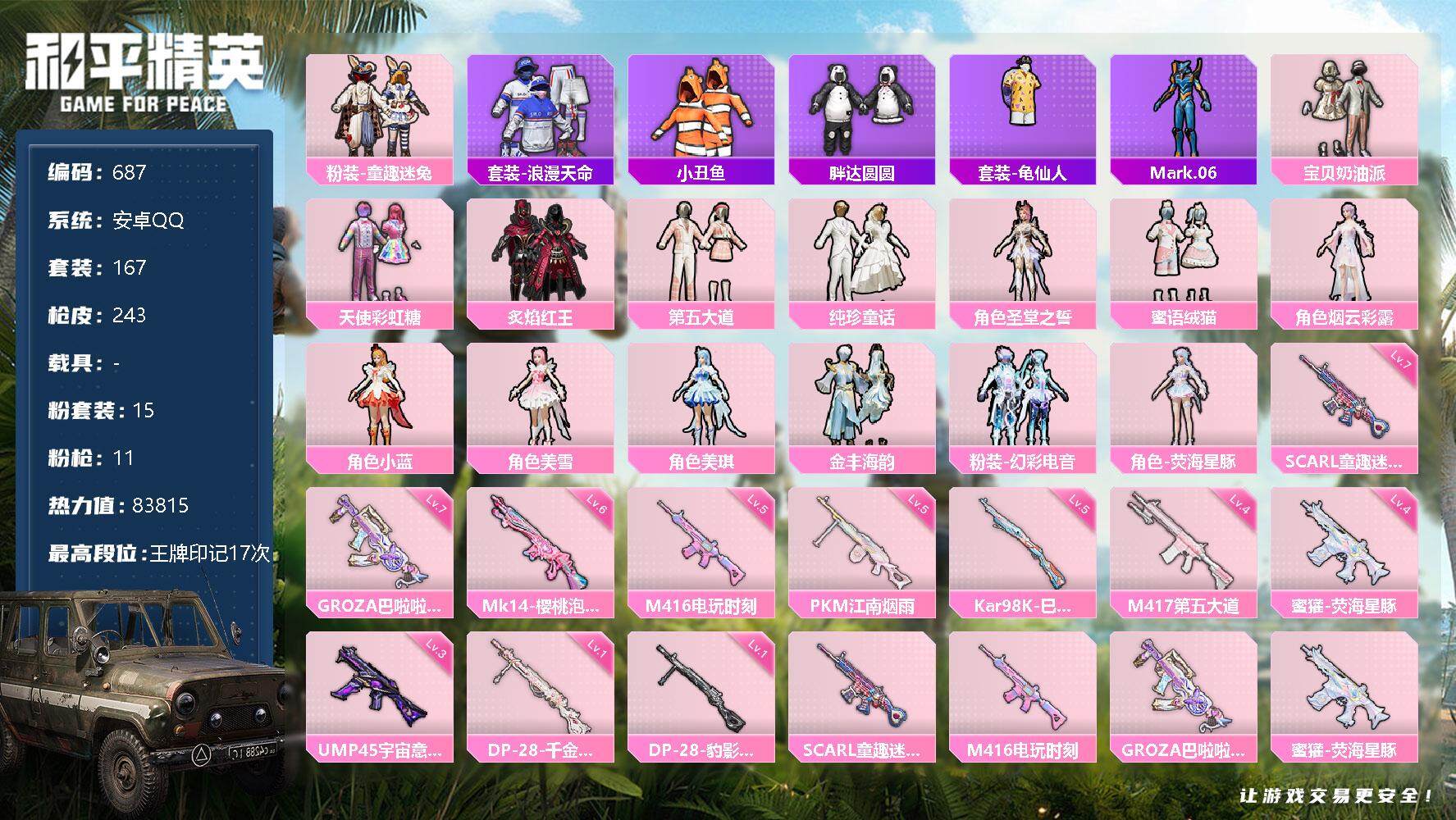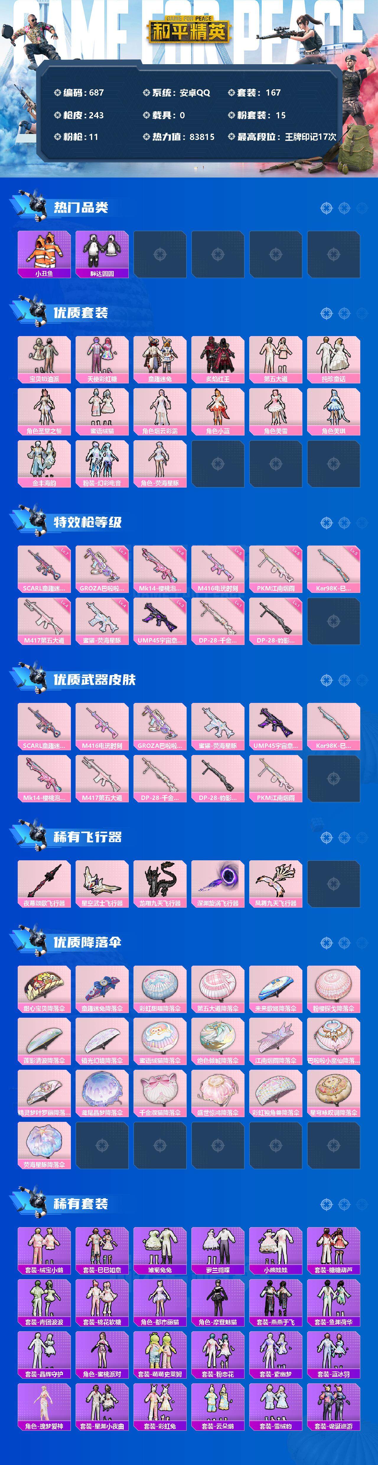 [12374338]【商品标题】:安卓 手Q-15粉装-11特效枪-0载具-6粉色飞行器-83815热力值-17王牌印记-167套装-243枪皮