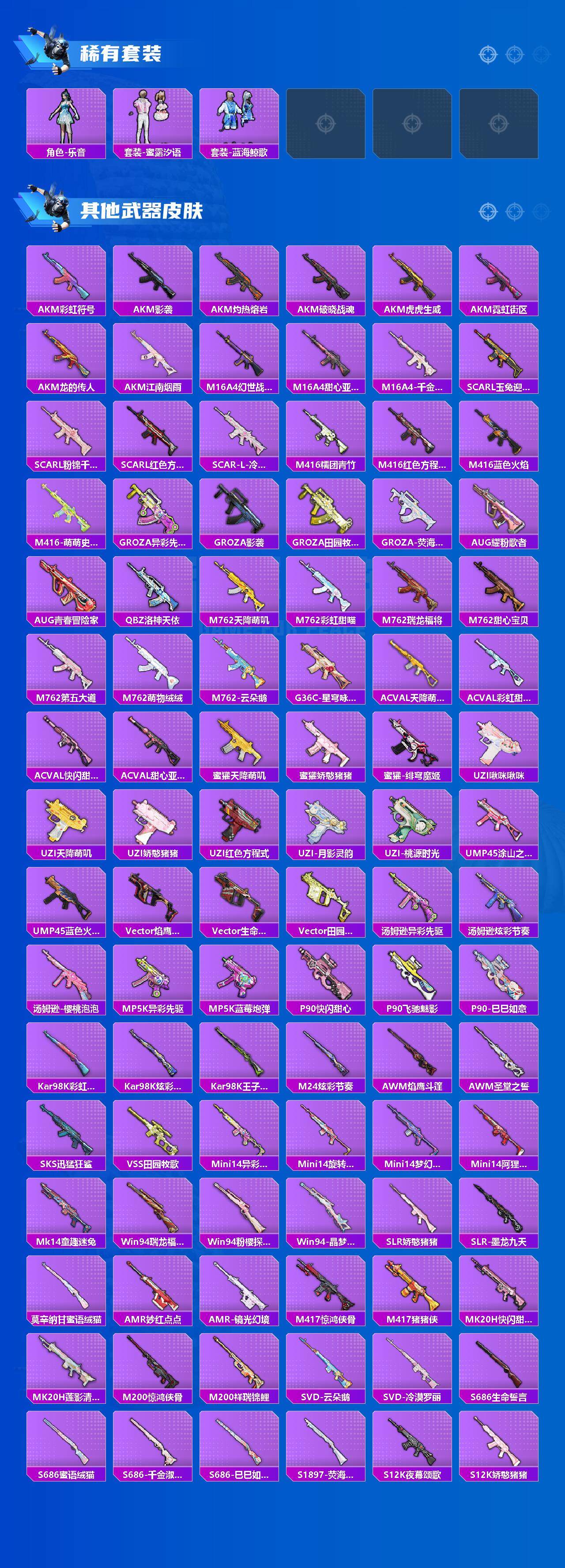 SCAR-L-童趣迷兔,M416-电玩时刻,GROZA-巴啦啦小魔仙,UMP45-宇宙意志,Kar98K-巳巳如意,Mk14-樱桃泡泡,M417-第五大道,DP-28-千金淑猫,PKM-江南烟雨