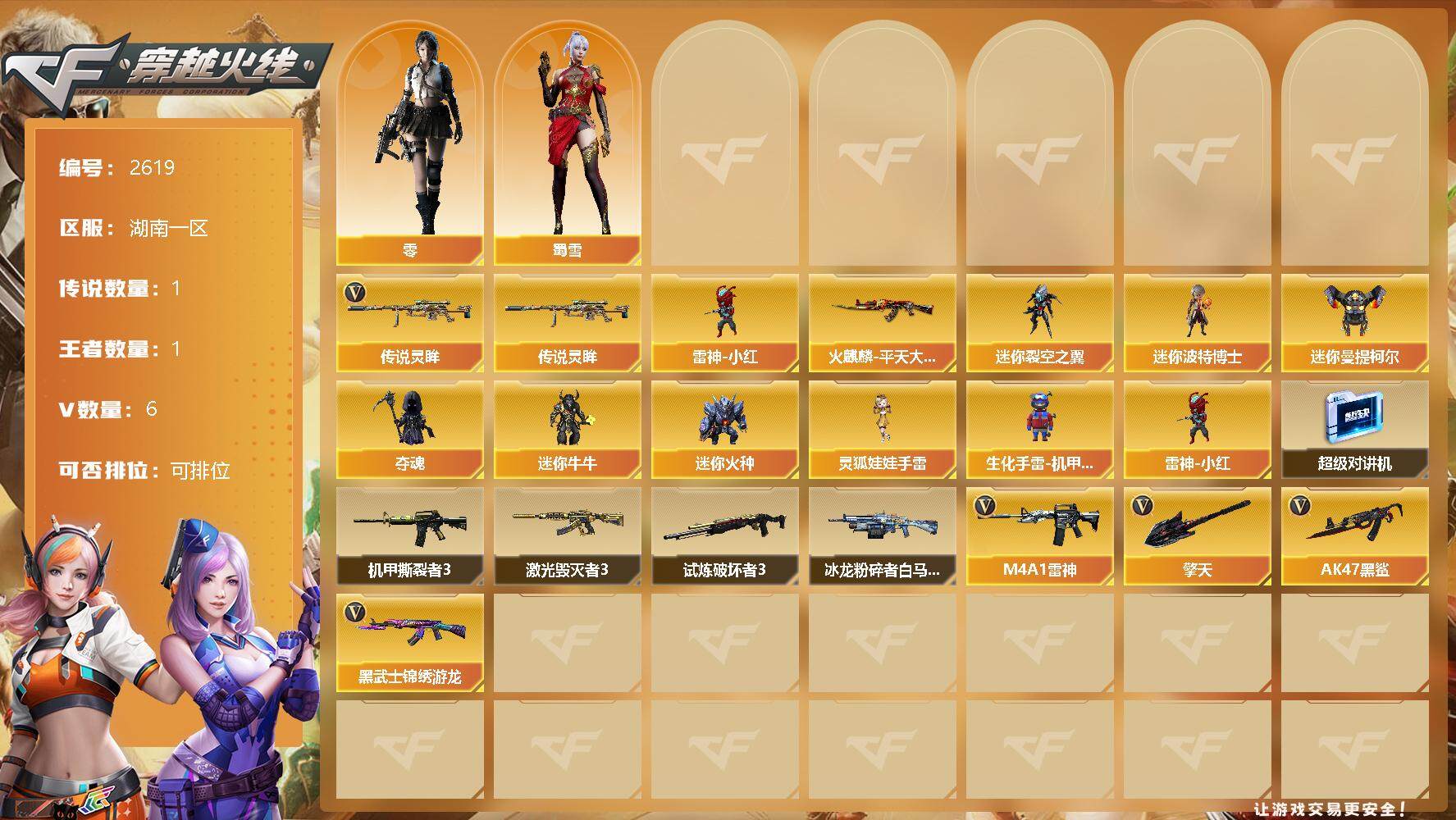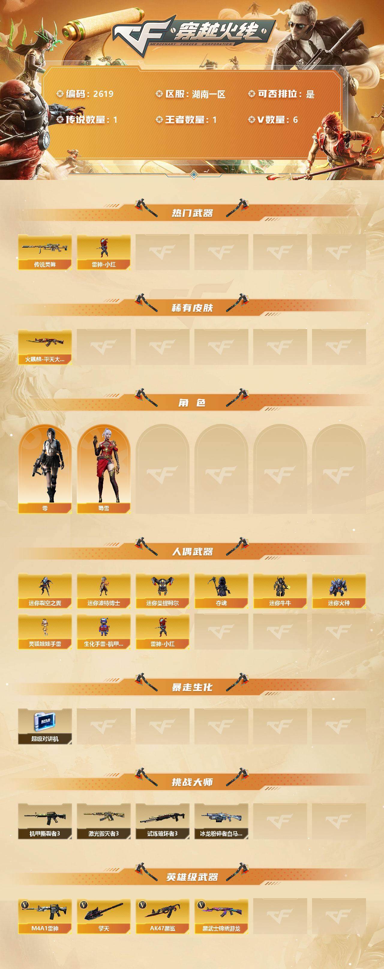 [12374410]【商品标题】:湖南一区-6V-1王者-0炫金 【传说武器】:传说灵眸 【热门武器】:传说灵眸,雷神-小红 【稀有皮肤】:火麒麟-平天大圣 【角色】:零,蜀雪 【人偶武器】:雷神-小红,迷你裂空之翼*2,迷你波特博士*2,迷你曼提柯尔,夺魂,迷你牛牛,迷你火种,灵狐娃娃手雷,生化手雷-机甲核心 【暴走生化】:超级对讲机 【挑战大师】:机甲撕裂者III,试炼破坏者III,激光毁灭者III,冰龙粉碎者-白马银枪 【英雄级武器】:M4A1-雷神,AK47-黑鲨,黑武士-锦绣游龙,擎天*2 【特殊枪械】: