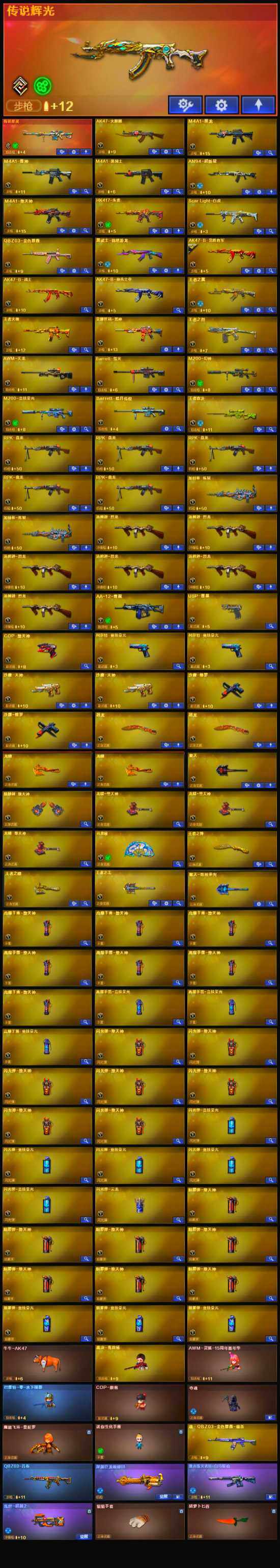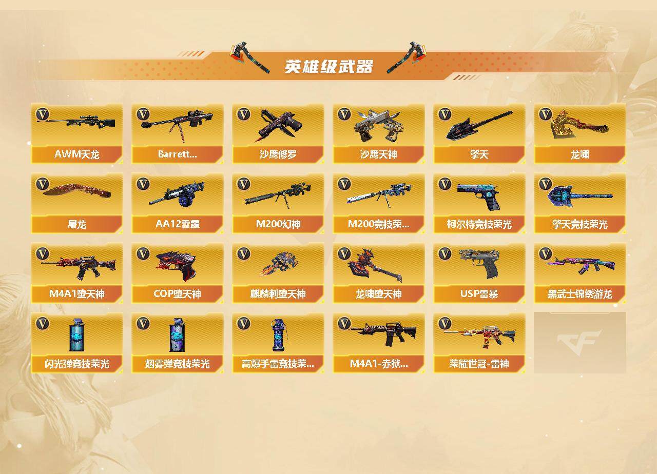 【英雄级武器】:M200-竞技荣光,柯尔特-竞技荣光*2,擎天-竞技荣光,高爆手雷-竞技荣光*3,烟雾弹-竞技荣光*3,闪光弹-竞技荣光*5,M4A1-堕天神,COP-堕天神,麒麟刺-堕天神,龙啸-堕天神*3,USP-雷暴,荣耀世冠-雷神,QBZ03-金色蔷薇,Scar Light-白虎,HK417-朱雀,M4A1-雷神,M4A1-黑龙,M4A1-黑骑士,RPK-盘龙*5,加特林-炼狱*2,汤姆逊-烈龙*6,AK47-火麒麟,AN94-超新星,AWM-天龙,Barrett-毁灭,AA-12-雷霆,M200-幻神,黑武士-锦绣游龙,AK47-B-常胜将军,M4A1-赤狱骑士,沙鹰-天神*2,沙鹰-修罗*2,擎天,龙啸*2,屠龙*2