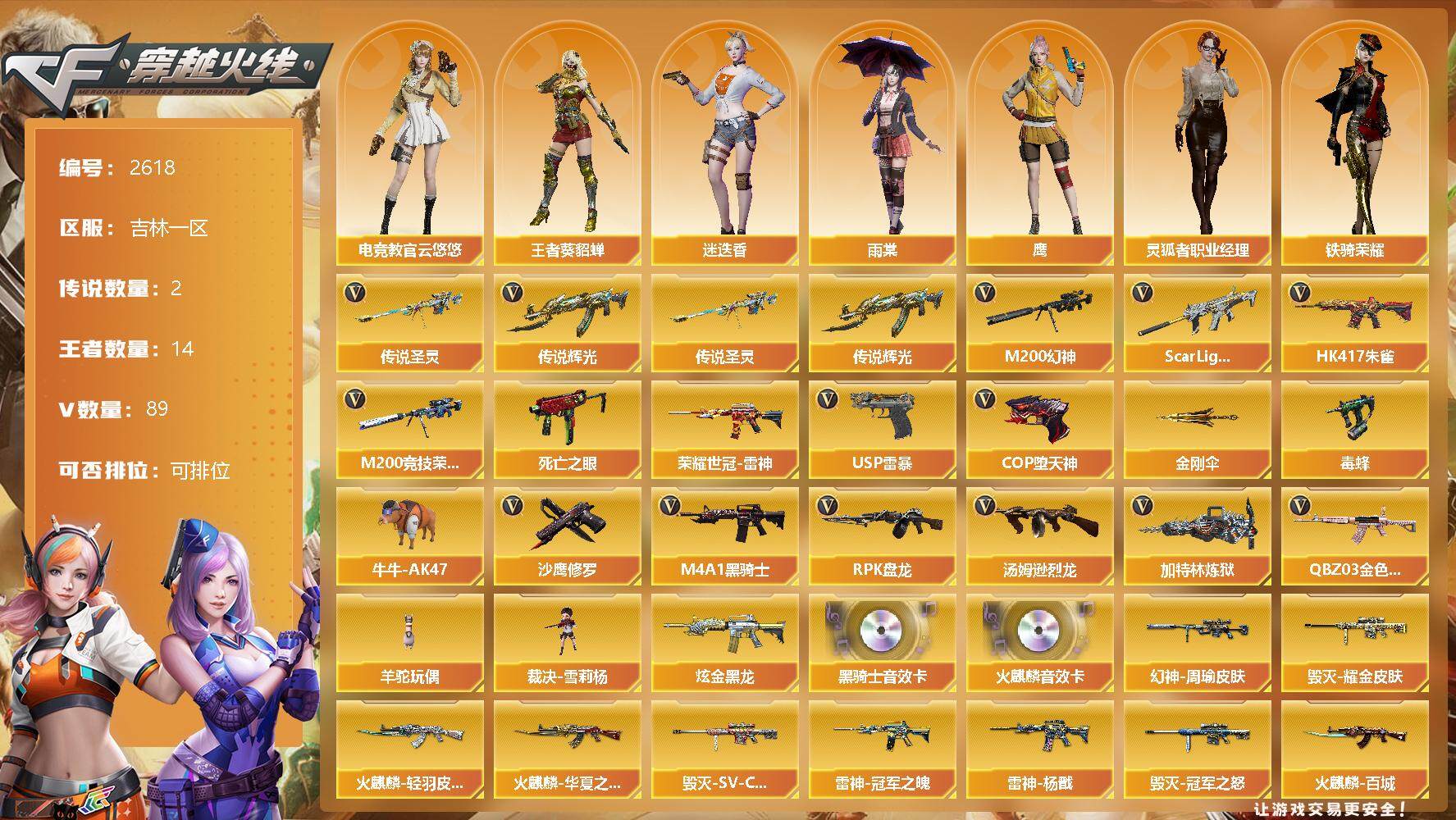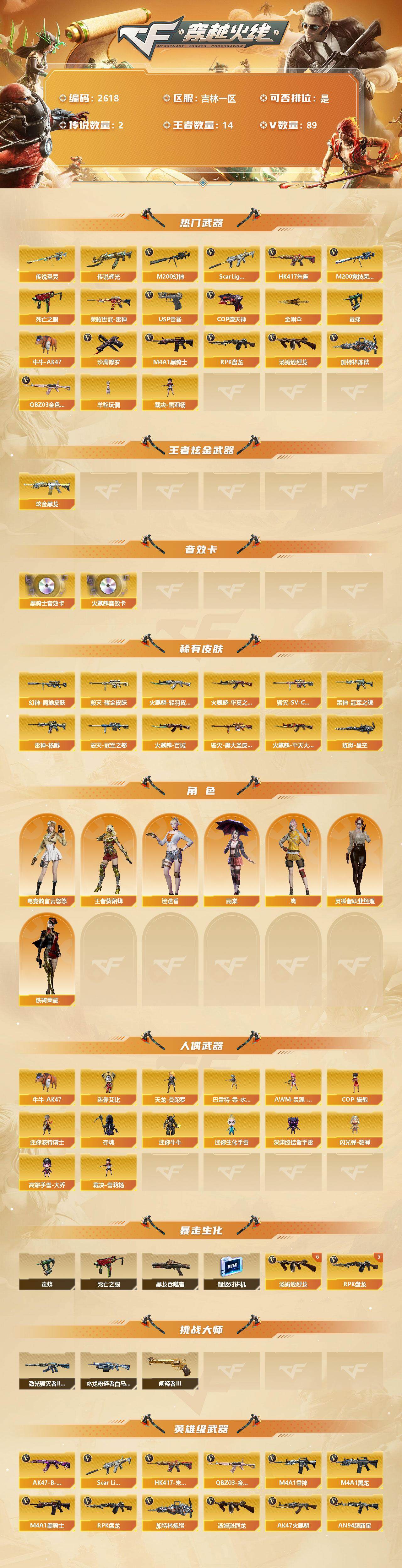 [12374493]【商品标题】:吉林一区-89V-14王者-1炫金 【传说武器】:传说圣灵,传说辉光 【热门武器】:传说圣灵,传说辉光,QBZ03-金色蔷薇,Scar Light-白虎,HK417-朱雀,M200-幻神,M200-竞技荣光,死亡之眼,荣耀世冠-雷神,毒蜂,牛牛-AK47,M4A1-黑骑士,汤姆逊-烈龙*6,RPK-盘龙*5,加特林-炼狱*2,羊驼玩偶,裁决-雪莉杨,USP-雷暴,COP-堕天神,沙鹰-修罗*2,金刚伞 【王者炫金武器】:炫金黑龙 【音效卡】:AK47-火麒麟音效卡,M4A1-黑骑士音效卡 【稀有皮肤】:幻神-周瑜皮肤,雷神-冠军之魄,雷神-杨戬,火麒麟-华夏之心,火麒麟-轻羽皮肤,火麒麟-平天大圣,火麒麟-百城,炼狱-星空,毁灭耀金皮肤,毁灭-冠军之怒,毁灭-SV-CFPLS16冠军,毁灭-黑大圣皮肤 【角色】:王者-葵-貂蝉,灵狐者-职业经理,迷迭香,雨棠,电竞教官-云悠悠,鹰,铁骑荣耀 【人偶武器】:裁决-雪莉杨,天龙-曼陀罗,巴雷特-零-水下丽影,AWM-灵狐-15周年嘉年华,COP-旗袍,牛牛-AK47,迷你艾比,迷你波特博士,夺魂,迷你牛牛,迷你生化手雷,深渊终结者手雷,闪光弹-貂蝉,高爆手雷-大乔 【暴走生化】:毒蜂,死亡之眼,黑龙吞噬者,超级对讲机 【挑战大师】:阐释者III,激光毁灭者III-白马银枪,冰龙粉碎者-白马银枪*2 【英雄级武器】:M200-竞技荣光,柯尔特-竞技荣光*2,擎天-竞技荣光,高爆手雷-竞技荣光*3,烟雾弹-竞技荣光*3,闪光弹-竞技荣光*5,M4A1-堕天神,COP-堕天神,麒麟刺-堕天神,龙啸-堕天神*3,USP-雷暴,荣耀世冠-雷神,QBZ03-金色蔷薇,Scar Light-白虎,HK417-朱雀,M4A1-雷神,M4A1-黑龙,M4A1-黑骑士,RPK-盘龙*5,加特林-炼狱*2,汤姆逊-烈龙*6,AK47-火麒麟,AN94-超新星,AWM-天龙,Barrett-毁灭,AA-12-雷霆,M200-幻神,黑武士-锦绣游龙,AK47-B-常胜将军,M4A1-赤狱骑士,沙鹰-天神*2,沙鹰-修罗*2,擎天,龙啸*2,屠龙*2 【特殊枪械】:1白虎,1黑骑士,6烈龙,5盘龙,2炼狱