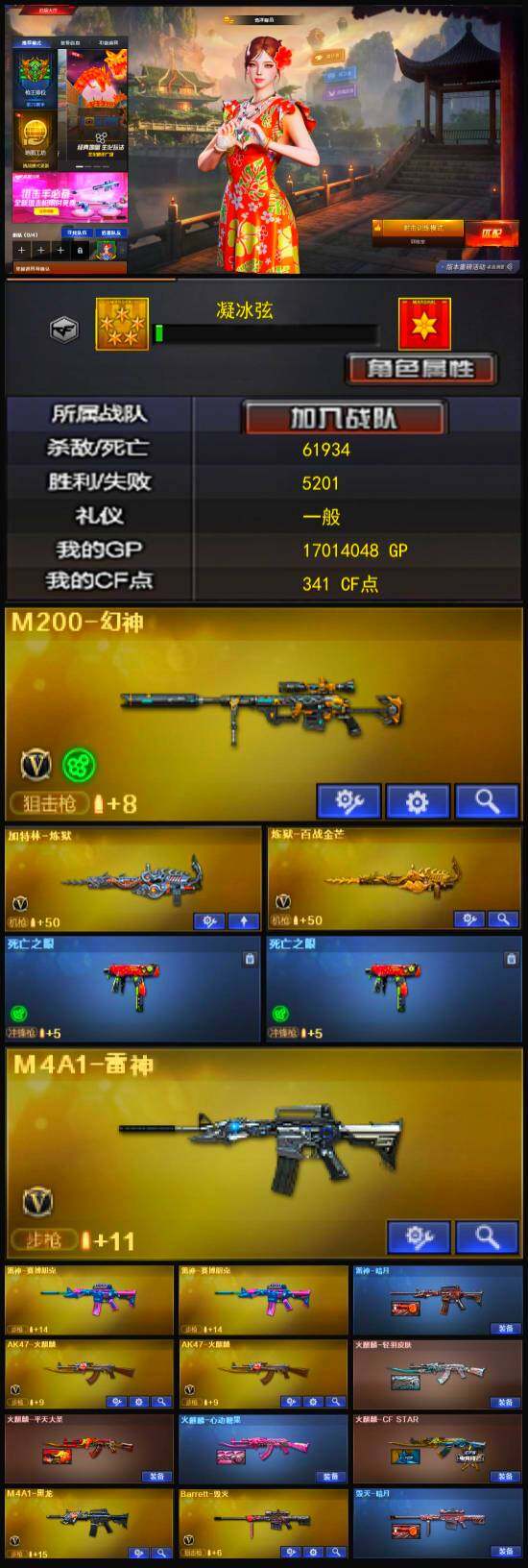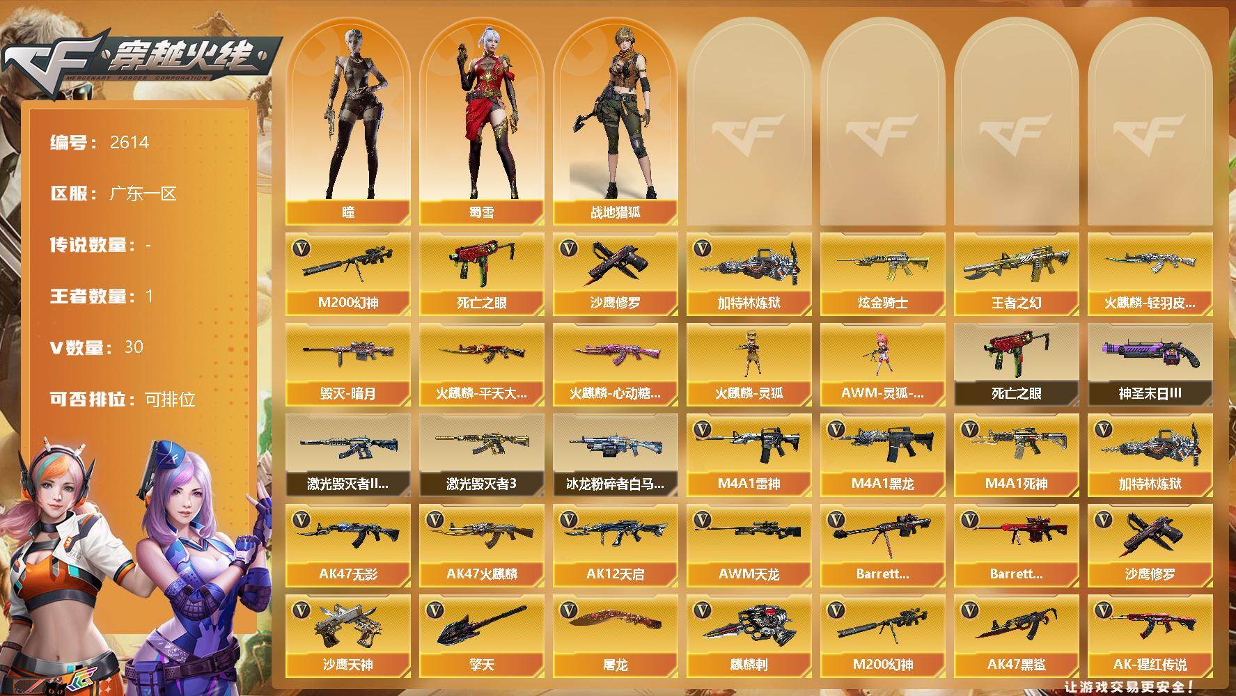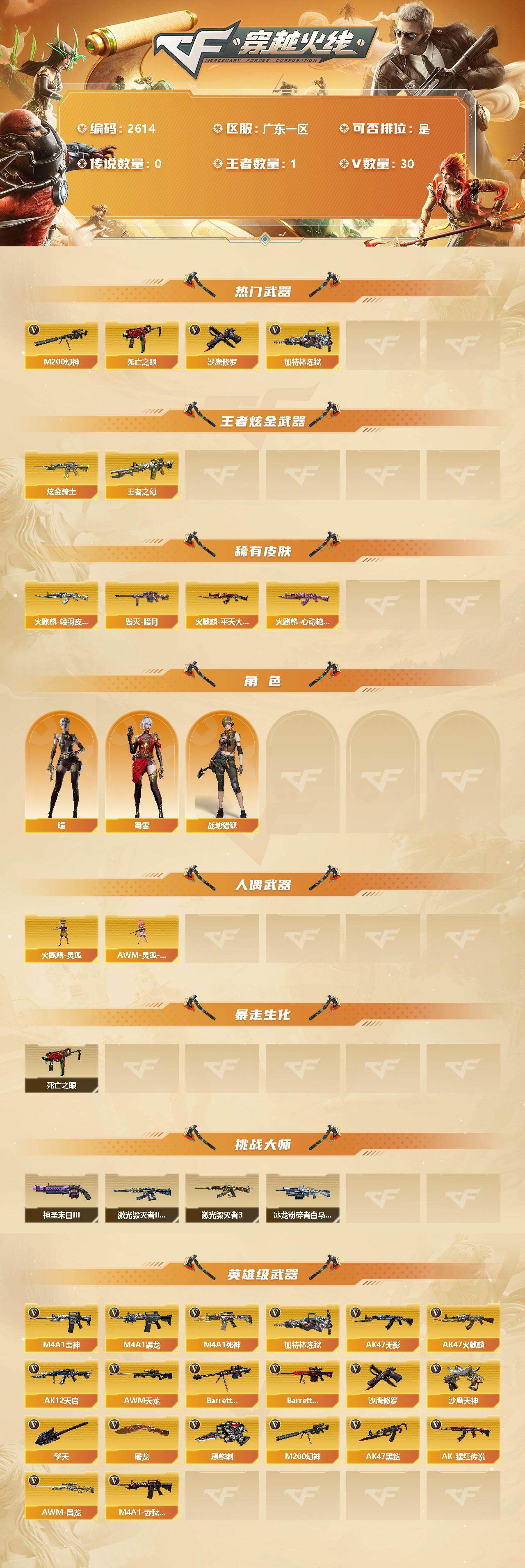 [12374619]【商品标题】:广东一区-30V-1王者-1炫金 【热门武器】:M200-幻神,死亡之眼*2,加特林-炼狱,沙鹰-修罗 【王者炫金武器】:炫金骑士,王者之幻 【稀有皮肤】:火麒麟-轻羽皮肤,火麒麟-平天大圣,火麒麟-心动糖果,毁灭-暗月 【角色】:瞳,战地猎狐,蜀雪 【人偶武器】:火麒麟-灵狐,AWM-灵狐-15周年嘉年华 【暴走生化】:死亡之眼*2 【挑战大师】:神圣爆裂者-末日III,激光毁灭者III,激光毁灭者III-白马银枪,冰龙粉碎者-白马银枪 【英雄级武器】:M4A1-雷神,M4A1-黑龙,M4A1-死神,加特林-炼狱,AK47-无影,AK47-火麒麟*2,AK12-天启,AWM-天龙*2,Barrett-毁灭,Barrett-极光,M200-幻神,AK47-黑鲨,AK-47-猩红传说,AWM-昌龙,M4A1-赤狱骑士,沙鹰-天神,沙鹰-修罗,麒麟刺*3,擎天,屠龙 【特殊枪械】:1炼狱