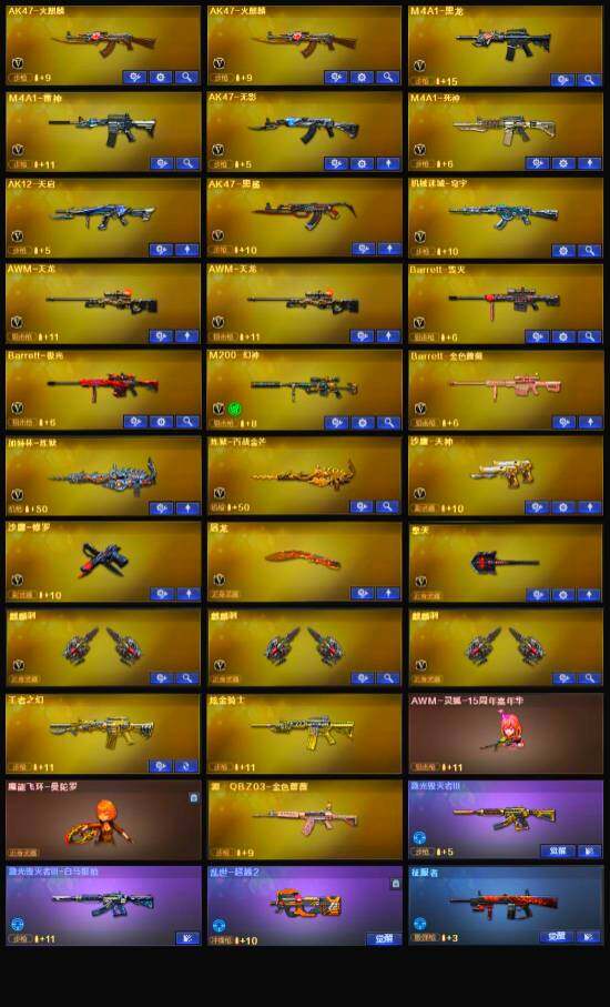 【英雄级武器】:M4A1-雷神,M4A1-黑龙,M4A1-死神,加特林-炼狱,AK47-无影,AK47-火麒麟*2,AK12-天启,AWM-天龙*2,Barrett-毁灭,Barrett-极光,M200-幻神,AK47-黑鲨,AK-47-猩红传说,AWM-昌龙,M4A1-赤狱骑士,沙鹰-天神,沙鹰-修罗,麒麟刺*3,擎天,屠龙