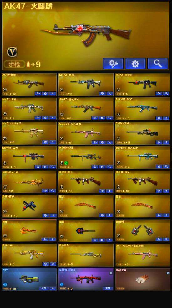 【英雄级武器】:QBZ03-金色蔷薇,M4A1-雷神,M4A1-玫瑰精灵,M4A1-黑骑士,M4A1-死神,汤姆逊-烈龙*2,AK47-麒麟,AK47-火麒麟,AWM-天龙,Barrett-毁灭,AK47-机械迷城,M200-幻神,AK-47-猩红传说,AWM-昌龙,M4A1-赤狱骑士,沙鹰-修罗,麒麟刺,擎天,龙啸,屠龙*2