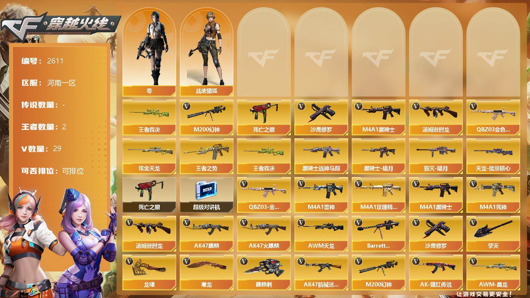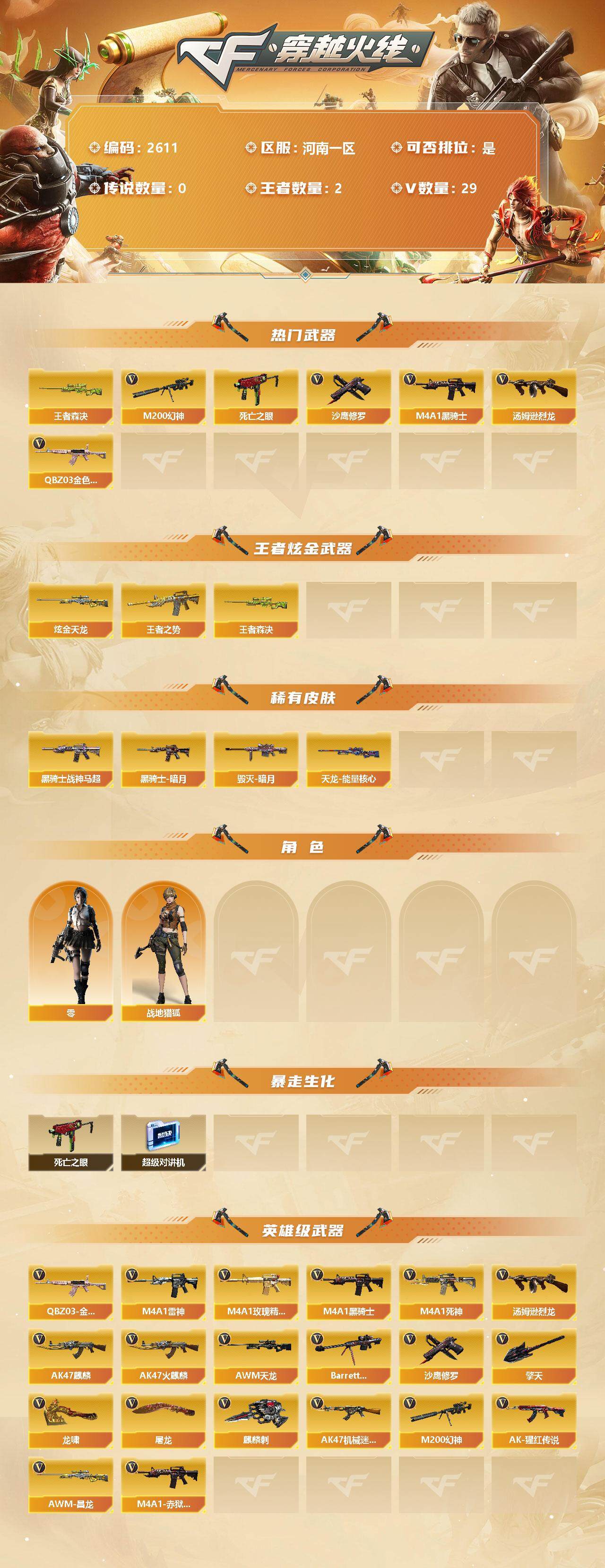 [12374670]【商品标题】:河南一区-29V-2王者-1炫金 【热门武器】:王者森决,QBZ03-金色蔷薇,M200-幻神,死亡之眼,M4A1-黑骑士,汤姆逊-烈龙*2,沙鹰-修罗 【王者炫金武器】:炫金天龙,王者之势,王者森决 【稀有皮肤】:黑骑士-暗月,黑骑士-战神马超,毁灭-暗月,天龙-能量核心 【角色】:零,战地猎狐 【暴走生化】:死亡之眼,超级对讲机 【英雄级武器】:QBZ03-金色蔷薇,M4A1-雷神,M4A1-玫瑰精灵,M4A1-黑骑士,M4A1-死神,汤姆逊-烈龙*2,AK47-麒麟,AK47-火麒麟,AWM-天龙,Barrett-毁灭,AK47-机械迷城,M200-幻神,AK-47-猩红传说,AWM-昌龙,M4A1-赤狱骑士,沙鹰-修罗,麒麟刺,擎天,龙啸,屠龙*2 【特殊枪械】:1黑骑士,2烈龙