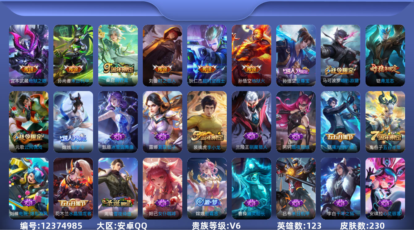 [12374985]【商品标题】:安卓Q-V6-荣耀黄金I段位-123英雄-230皮肤-0典藏-0珍品无双-0无双-0珍品传说-6传说-62史诗