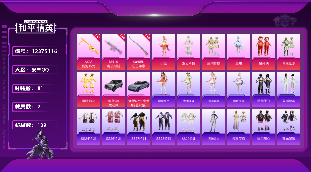[12375116]【商品标题】:安卓 手Q-8粉装-3特效枪-2载具-7粉色飞行器-46908热力值-5王牌印记-81套装-139枪皮