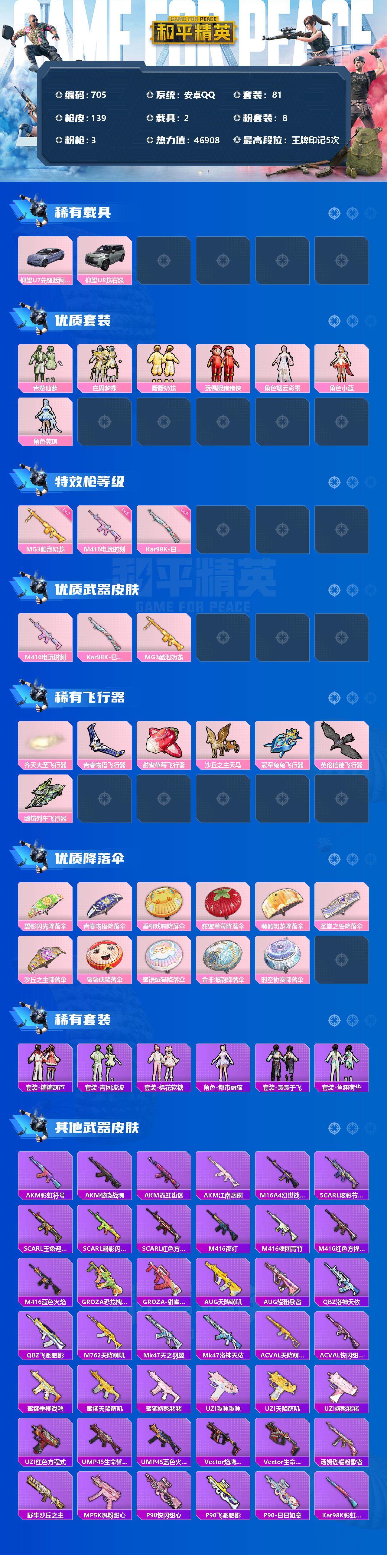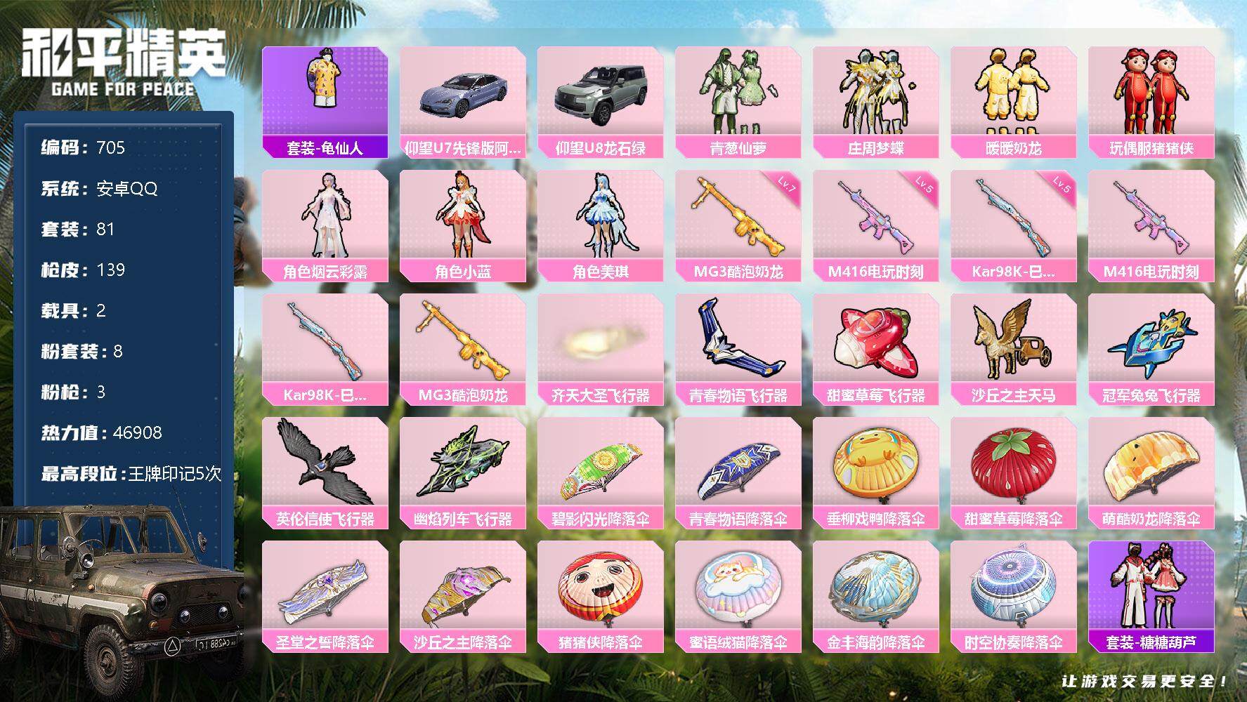 [12375116]【商品标题】:安卓 手Q-8粉装-3特效枪-2载具-7粉色飞行器-46908热力值-5王牌印记-81套装-139枪皮 【热门品类】:套装-龟仙人 【粉色载具】:仰望U7(阿盖尔紫),仰望U8(龙石绿) 【粉色套装】:粉装-青葱仙萝,粉装-庄周梦蝶,粉装-暖暖奶龙,玩偶服-猪猪侠,角色-烟云彩露,角色-小蓝,角色-美琪 【粉色枪皮等级】:M416-电玩时刻(五级),Kar98K-巳巳如意(五级),MG3-酷泡奶龙(七级) 【粉色枪皮】:M416-电玩时刻,Kar98K-巳巳如意,MG3-酷泡奶龙 【粉色飞行器】:齐天大圣飞行器,青春物语飞行器,甜蜜草莓飞行器,沙丘之主天马,冠军兔兔飞行器,英伦信使飞行器,幽焰列车飞行器 【粉色降落伞】:碧影闪光降落伞,青春物语降落伞,垂柳戏鸭降落伞,甜蜜草莓降落伞,萌酷奶龙降落伞,圣堂之誓降落伞,沙丘之主降落伞,猪猪侠降落伞,蜜语绒猫降落伞,金丰海韵降落伞,时空协奏降落伞 【稀有套装】:套装-龟仙人,套装-糖糖葫芦,套装-青团波波,套装-棉花软糖,角色-都市丽猫,套装-燕燕于飞,套装-鱼渊荷华 【稀有枪皮】:AKM-彩虹符号,AKM-江南烟雨,AKM-破晓战魂,AKM-霓虹街区,M16A4-幻世战舞者,SCAR-L-炫彩节奏,SCAR-L-玉兔迎春,SCAR-L-碧影闪光,SCAR-L-红色方程式,M416-夜灯,M416-糯团青竹,M416-红色方程式,M416-蓝色火焰,GROZA-恐龙拽拽,GROZA-甜蜜草莓,AUG-天降萌叽,AUG-耀粉歌者,QBZ-洛神天依,QBZ-飞驰魅影,M762-天降萌叽,Mk47-天之羽翼,Mk47-洛神天依,AC-VAL-天降萌叽,AC-VAL-快闪甜心,蜜獾-垂柳戏鸭,蜜獾-天降萌叽,蜜獾-娇憨猪猪,UZI-啾咪啾咪,UZI-天降萌叽,UZI-娇憨猪猪,UZI-红色方程式,UMP45-生命誓言,UMP45-蓝色火焰,Vector-焰鹰斗篷,Vector-生命誓言,汤姆逊-耀粉歌者,野牛-沙丘之主,MP5K-飒粉甜心,P90-快闪甜心,P90-飞驰魅影,P90-巳巳如意,Kar98K-彩虹符号,Kar98K-炫彩节奏,Kar98K-红色方程式,Kar98K-飞驰魅影,AWM-焰鹰斗篷,VSS-碧影闪光,Mini14-梦幻火箭,Mini14-耀粉歌者,SLR-娇憨猪猪,MK20-H-快闪甜心,S