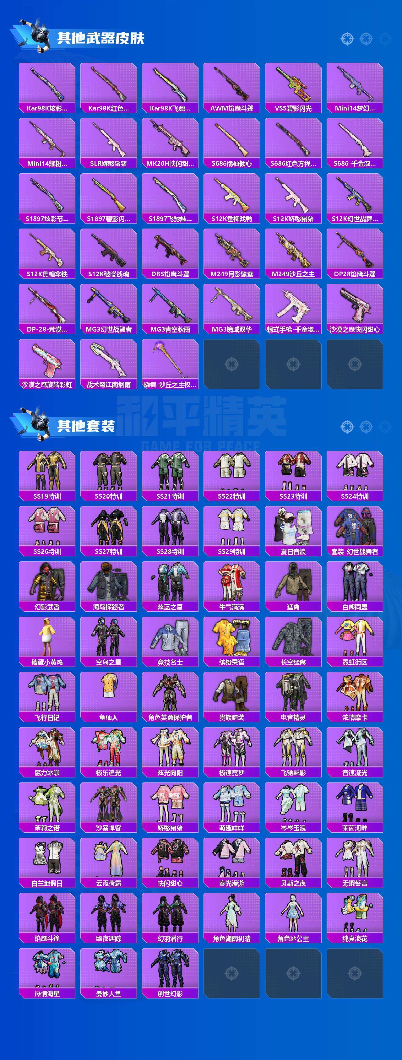 【稀有枪皮】:AKM-彩虹符号,AKM-江南烟雨,AKM-破晓战魂,AKM-霓虹街区,M16A4-幻世战舞者,SCAR-L-炫彩节奏,SCAR-L-玉兔迎春,SCAR-L-碧影闪光,SCAR-L-红色方程式,M416-夜灯,M416-糯团青竹,M416-红色方程式,M416-蓝色火焰,GROZA-恐龙拽拽,GROZA-甜蜜草莓,AUG-天降萌叽,AUG-耀粉歌者,QBZ-洛神天依,QBZ-飞驰魅影,M762-天降萌叽,Mk47-天之羽翼,Mk47-洛神天依,AC-VAL-天降萌叽,AC-VAL-快闪甜心,蜜獾-垂柳戏鸭,蜜獾-天降萌叽,蜜獾-娇憨猪猪,UZI-啾咪啾咪,UZI-天降萌叽,UZI-娇憨猪猪,UZI-红色方程式,UMP45-生命誓言,UMP45-蓝色火焰,Vector-焰鹰斗篷,Vector-生命誓言,汤姆逊-耀粉歌者,野牛-沙丘之主,MP5K-飒粉甜心,P90-快闪甜心,P90-飞驰魅影,P90-巳巳如意,Kar98K-彩虹符号,Kar98K-炫彩节奏,Kar98K-红色方程式,Kar98K-飞驰魅影,AWM-焰鹰斗篷,VSS-碧影闪光,Mini14-梦幻火箭,Mini14-耀粉歌者,SLR-娇憨猪猪,MK20-H-快闪甜心,S