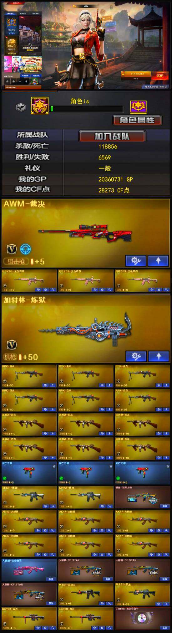 【热门武器】:QBZ03-金色蔷薇*3,死亡之眼*3,M4A1-黑骑士,汤姆逊-烈龙*6,RPK-盘龙*6,加特林-炼狱,沙鹰-修罗*2