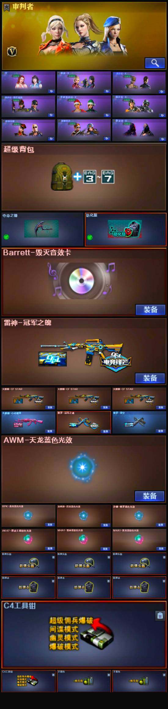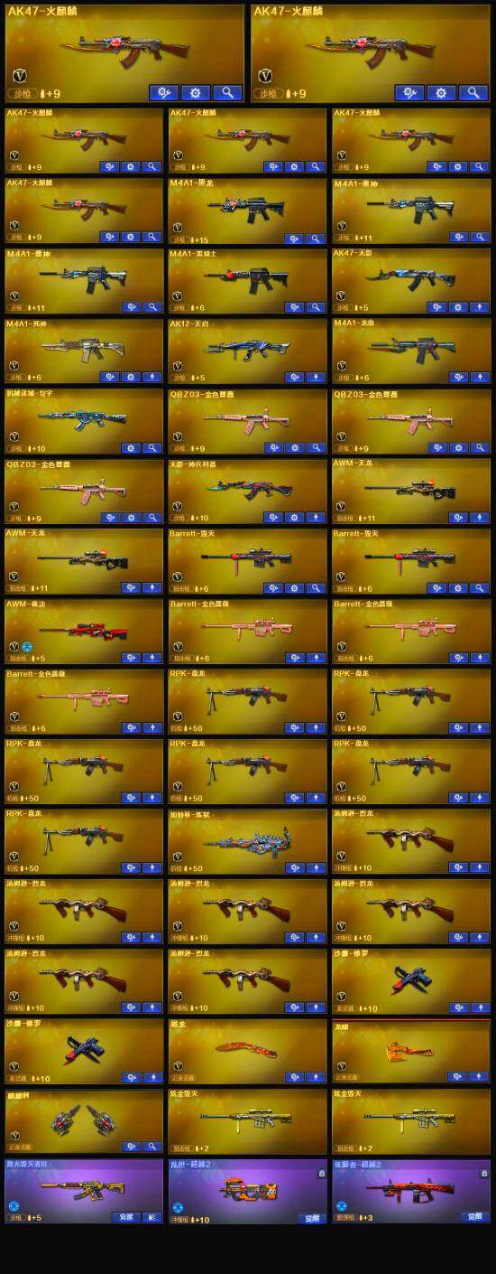 【英雄级武器】:QBZ03-金色蔷薇*3,无影-神兵利器,M4A1-雷神*2,M4A1-黑龙,M4A1-黑骑士,M4A1-死神,RPK-盘龙*6,加特林-炼狱,汤姆逊-烈龙*6,AK47-无影,AK47-火麒麟*6,AK12-天启,AWM-天龙*2,Barrett-毁灭*2,AWM-裁决,M4A1-龙血,沙鹰-修罗*2,麒麟刺,龙啸,屠龙