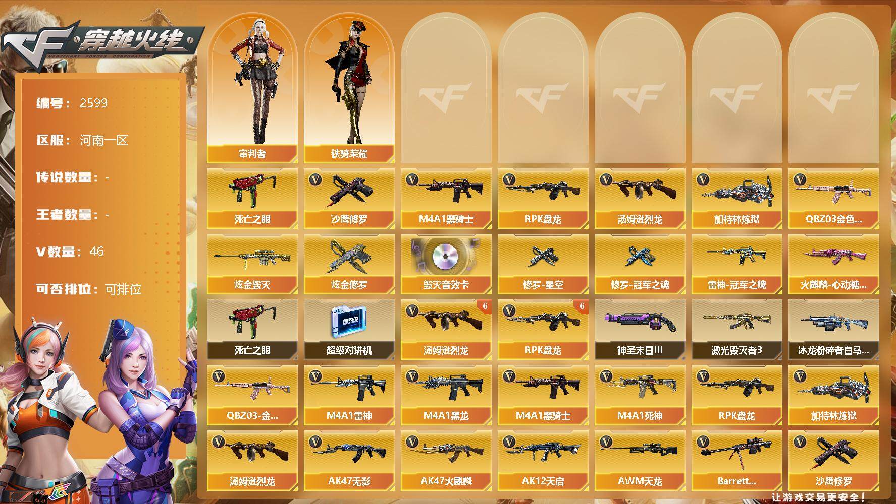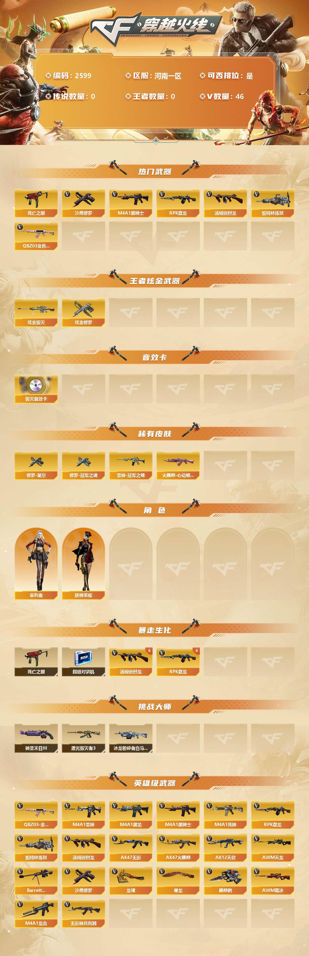 [12375099]【商品标题】:河南一区-46V-0王者-3炫金 【热门武器】:QBZ03-金色蔷薇*3,死亡之眼*3,M4A1-黑骑士,汤姆逊-烈龙*6,RPK-盘龙*6,加特林-炼狱,沙鹰-修罗*2 【王者炫金武器】:炫金毁灭*2,炫金修罗 【音效卡】:Barrett-毁灭音效卡 【稀有皮肤】:雷神-冠军之魄,火麒麟-心动糖果,修罗-星空,修罗-冠军之魂 【角色】:审判者,铁骑荣耀 【暴走生化】:死亡之眼*3,超级对讲机 【挑战大师】:神圣爆裂者-末日III,激光毁灭者III,冰龙粉碎者-白马银枪 【英雄级武器】:QBZ03-金色蔷薇*3,无影-神兵利器,M4A1-雷神*2,M4A1-黑龙,M4A1-黑骑士,M4A1-死神,RPK-盘龙*6,加特林-炼狱,汤姆逊-烈龙*6,AK47-无影,AK47-火麒麟*6,AK12-天启,AWM-天龙*2,Barrett-毁灭*2,AWM-裁决,M4A1-龙血,沙鹰-修罗*2,麒麟刺,龙啸,屠龙 【特殊枪械】:1黑骑士,6烈龙,6盘龙,1炼狱