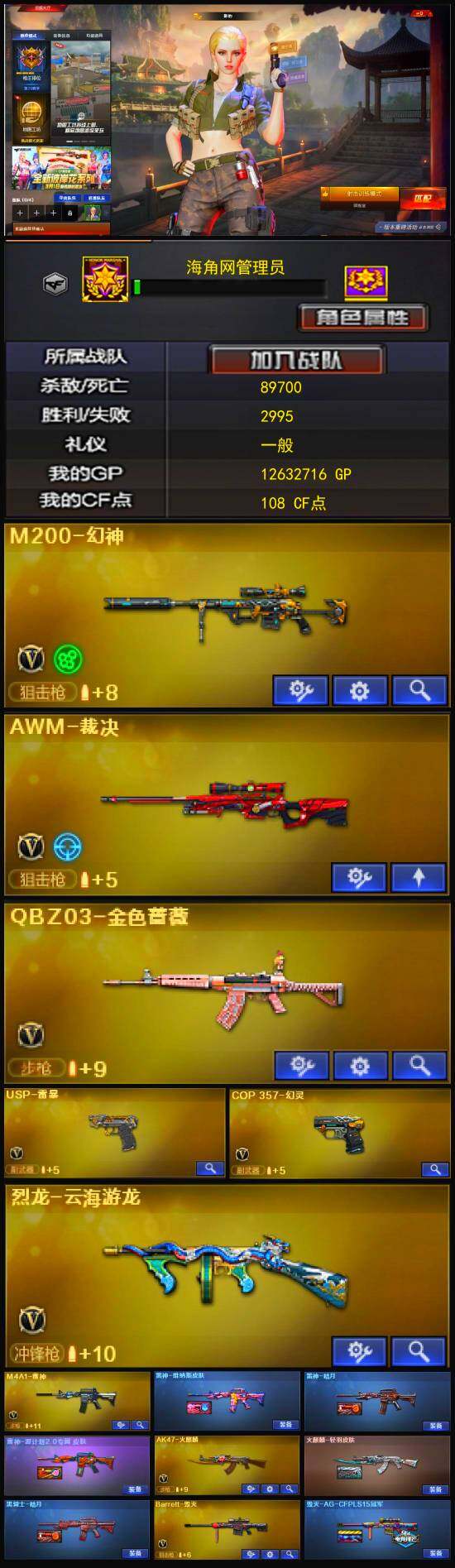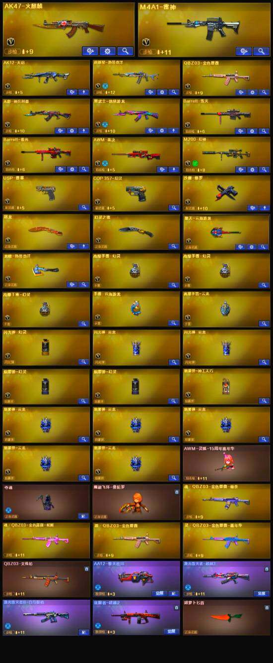 【英雄级武器】:COP 357-幻灵,幻灵之锋,USP-雷暴,QBZ03-金色蔷薇,无影-神兵利器,M4A1-雷神,AK47-火麒麟,AK12-天启,Barrett-毁灭,Barrett-极光,AWM-裁决,M200-幻神,黑武士-锦绣游龙,超新星-热带奇洋,M4A1-赤狱骑士,沙鹰-修罗,屠龙,擎天-云海游龙,龙啸-热带奇洋