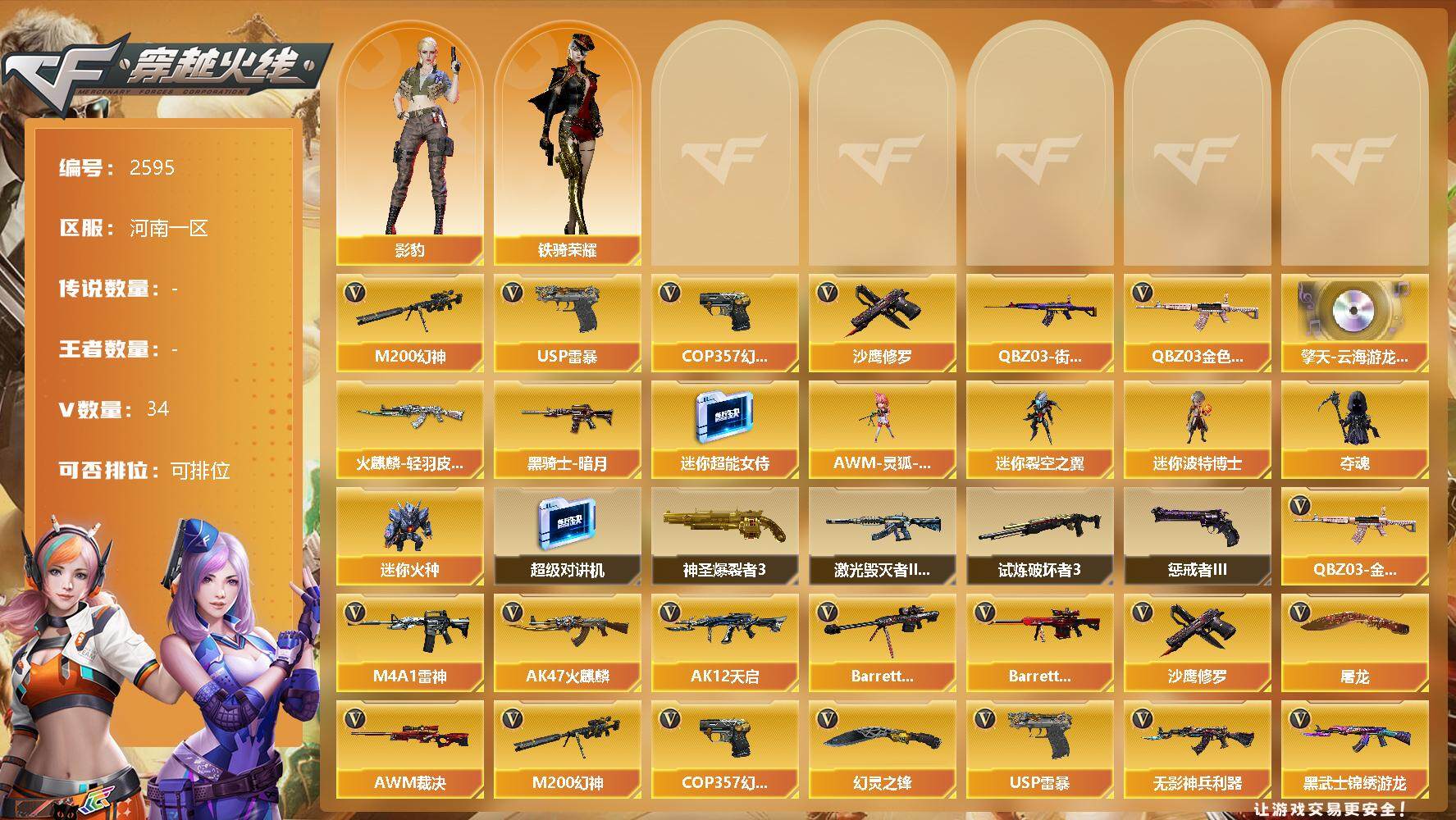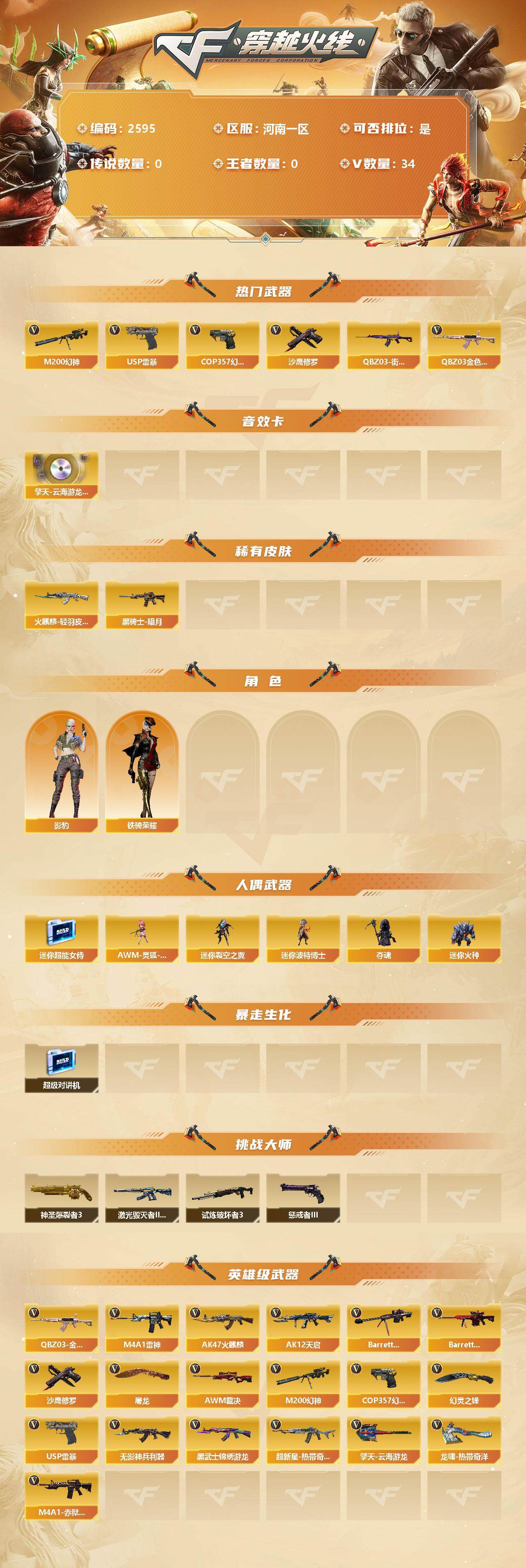 [12375241]【商品标题】:河南一区-34V-0王者-0炫金 【热门武器】:QBZ03-金色蔷薇,M200-幻神,QBZ03-街机,USP-雷暴,COP 357-幻灵,沙鹰-修罗 【音效卡】:擎天-云海游龙音效卡 【稀有皮肤】:火麒麟-轻羽皮肤,黑骑士-暗月 【角色】:影豹,铁骑荣耀 【人偶武器】:AWM-灵狐-15周年嘉年华,迷你超能女侍,迷你裂空之翼*3,迷你波特博士*4,夺魂,迷你火种*2 【暴走生化】:超级对讲机 【挑战大师】:神圣爆裂者III,惩戒者III,试炼破坏者III,激光毁灭者III-白马银枪 【英雄级武器】:COP 357-幻灵,幻灵之锋,USP-雷暴,QBZ03-金色蔷薇,无影-神兵利器,M4A1-雷神,AK47-火麒麟,AK12-天启,Barrett-毁灭,Barrett-极光,AWM-裁决,M200-幻神,黑武士-锦绣游龙,超新星-热带奇洋,M4A1-赤狱骑士,沙鹰-修罗,屠龙,擎天-云海游龙,龙啸-热带奇洋 【特殊枪械】: