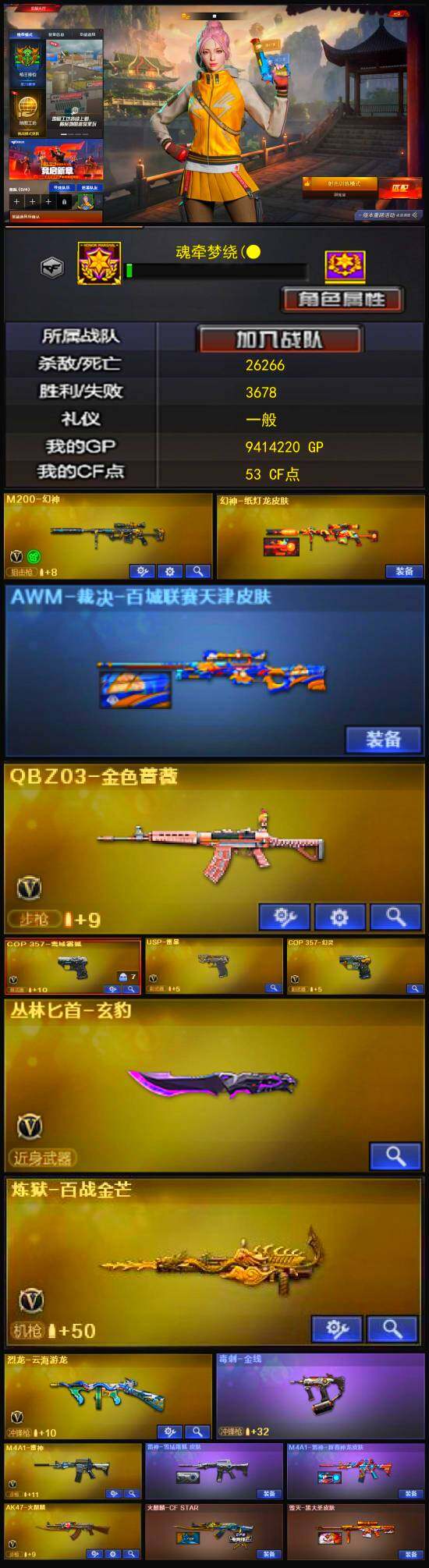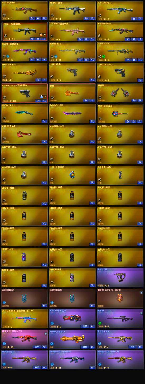 【英雄级武器】:COP 357-幻灵,USP-雷暴,QBZ03-金色蔷薇,无影-神兵利器,M4A1-雷神,AK47-火麒麟,M200-幻神,黑武士-锦绣游龙,死神-雪域霜狐,M4A1-赤狱骑士,COP 357-雪域霜狐,麒麟刺,龙啸,擎天-云海游龙,屠龙-云海游龙*2