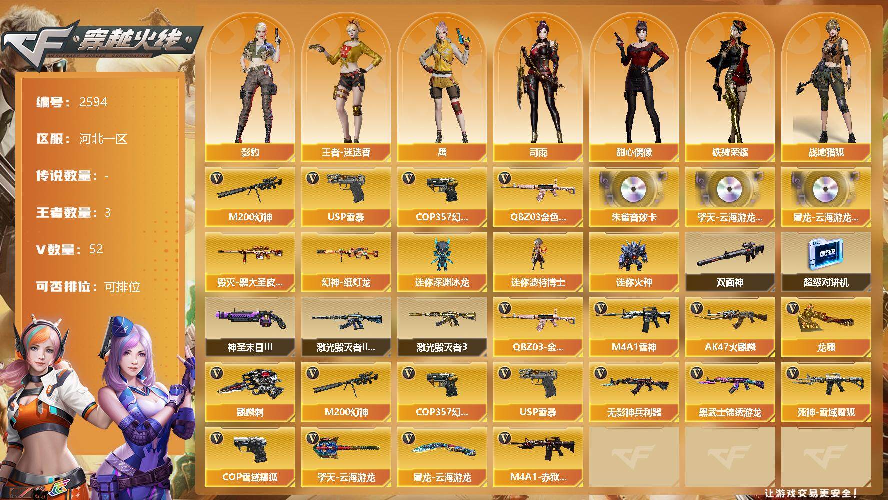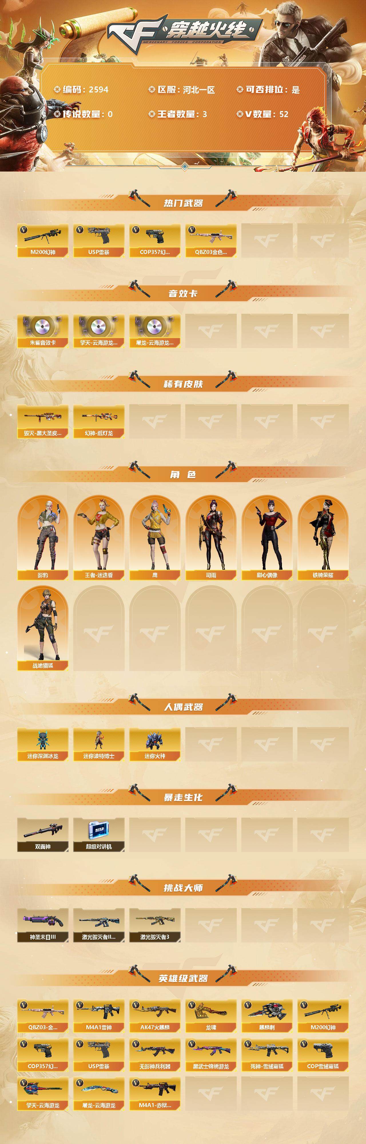 [12375343]【商品标题】:河北一区-52V-3王者-0炫金 【热门武器】:QBZ03-金色蔷薇,M200-幻神,USP-雷暴,COP 357-幻灵 【音效卡】:擎天-云海游龙音效卡,屠龙-云海游龙音效卡,HK417-朱雀音效卡 【稀有皮肤】:幻神-纸灯龙皮肤,毁灭-黑大圣皮肤 【角色】:王者-迷迭香,影豹,鹰,司雨,战地猎狐,铁骑荣耀,甜心偶像 【人偶武器】:迷你深渊冰龙*2,迷你波特博士,迷你火种 【暴走生化】:双面神,超级对讲机 【挑战大师】:神圣爆裂者-末日III,激光毁灭者III*2,激光毁灭者III-白马银枪 【英雄级武器】:COP 357-幻灵,USP-雷暴,QBZ03-金色蔷薇,无影-神兵利器,M4A1-雷神,AK47-火麒麟,M200-幻神,黑武士-锦绣游龙,死神-雪域霜狐,M4A1-赤狱骑士,COP 357-雪域霜狐,麒麟刺,龙啸,擎天-云海游龙,屠龙-云海游龙*2 【特殊枪械】: