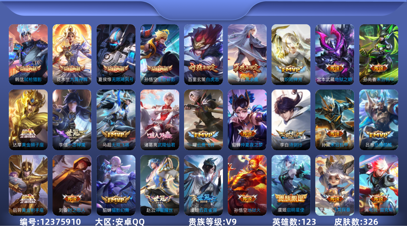[12375910]【商品标题】:安卓Q-V7-永恒钻石V段位-123英雄-326皮肤-4典藏-0珍品无双-0无双-0珍品传说-23传说-98史诗