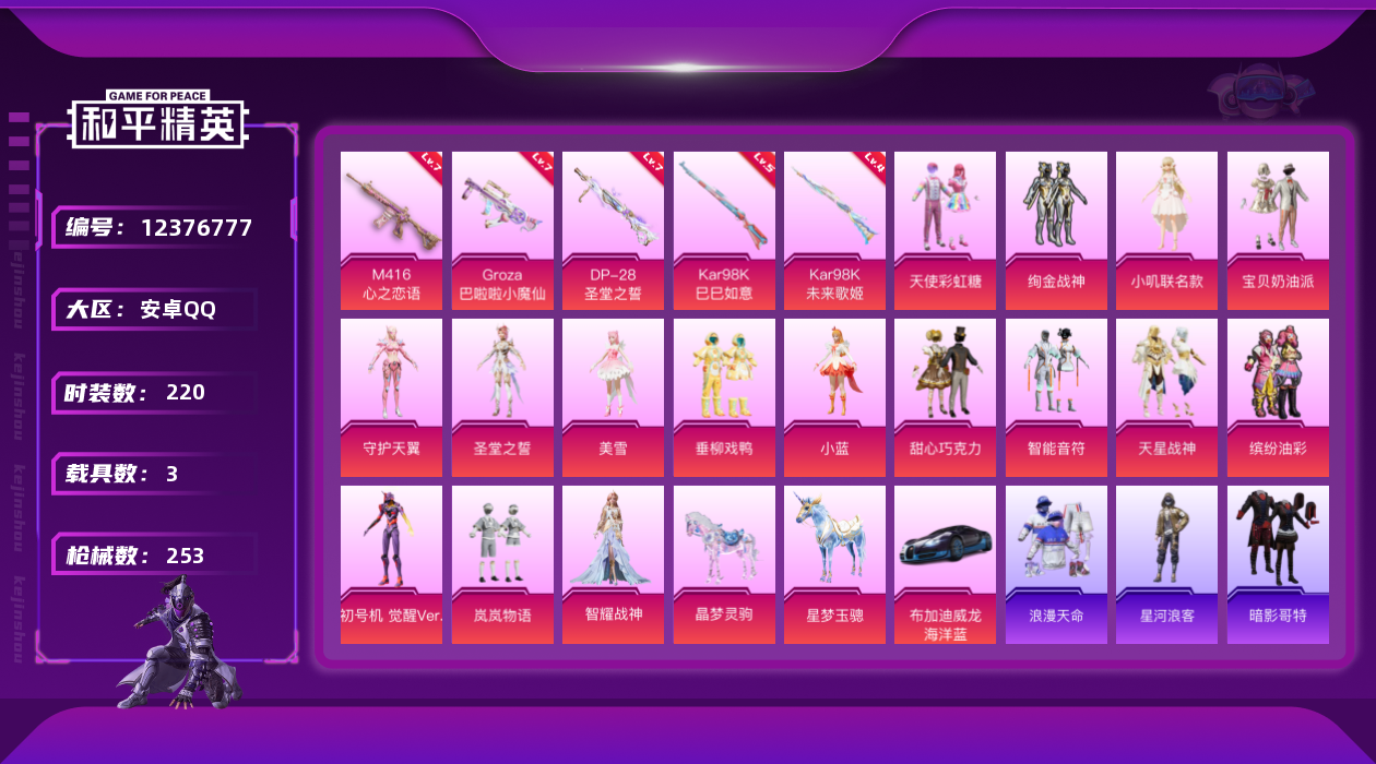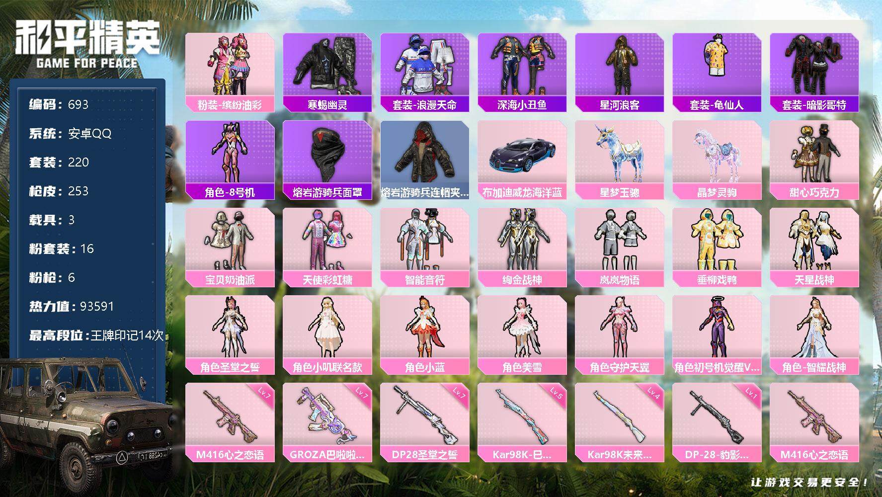 [12376777]【商品标题】:安卓 手Q-16粉装-6特效枪-3载具-4粉色飞行器-93591热力值-14王牌印记-220套装-253枪皮