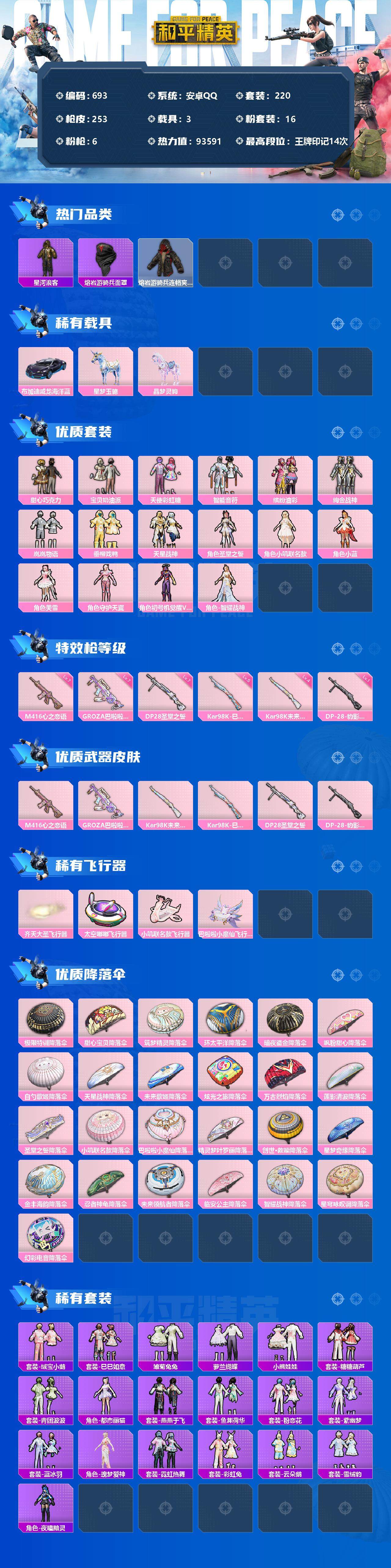 [12376777]【商品标题】:安卓 手Q-16粉装-6特效枪-3载具-4粉色飞行器-93591热力值-14王牌印记-220套装-253枪皮 【热门品类】:粉装-缤纷油彩,套装-寒蝎幽灵,套装-浪漫天命,套装-深海小丑鱼,套装-星河浪客,套装-龟仙人,套装-暗影哥特,角色-8号机,熔岩游骑兵面罩,熔岩游骑兵连帽夹克 【粉色载具】:布加迪威龙(海洋蓝),星梦玉骢,晶梦灵驹 【粉色套装】:粉装-甜心巧克力,粉装-宝贝奶油派,粉装-天使彩虹糖,粉装-智能音符,粉装-缤纷油彩,粉装-绚金战神,粉装-岚岚物语,粉装-垂柳戏鸭,粉装-天星战神,角色-圣堂之誓,角色-小叽联名款,角色-小蓝,角色-美雪,角色-守护天翼,角色-初号机 觉醒Ver.,角色-智耀战神 【粉色枪皮等级】:M416-心之恋语(七级),GROZA-巴啦啦小魔仙(七级),Kar98K-未来歌姬(四级),Kar98K-巳巳如意(五级),DP-28-圣堂之誓(七级),DP-28-豹影疾电(一级) 【粉色枪皮】:M416-心之恋语,GROZA-巴啦啦小魔仙,Kar98K-未来歌姬,Kar98K-巳巳如意,DP-28-圣堂之誓,DP-28-豹影疾电 【粉色飞行器】:齐天大圣飞行器,太空嘟嘟飞行器,小叽联名款飞行器,巴啦啦小魔仙飞行器 【粉色降落伞】:极限特训降落伞,甜心宝贝降落伞,筑梦精灵降落伞,环太平洋降落伞,暗夜鎏金降落伞,飒粉甜心降落伞,白勺歌姬降落伞,天星战神降落伞,未来歌姬降落伞,炫光之旅降落伞,万古烈焰降落伞,莲影清波降落伞,圣堂之誓降落伞,小叽联名款降落伞,巴啦啦小魔仙降落伞,精灵梦叶罗丽降落伞,创世·救赎降落伞,星梦奇缘降落伞,金丰海韵降落伞,忍者神龟降落伞,未来领航者降落伞,临安公主降落伞,智耀战神降落伞,星穹咏叹调降落伞,幻彩电音降落伞 【稀有套装】:套装-龟仙人,套装-绒宝小鹅,套装-巳巳如意,套装-雏菊兔兔,套装-萝兰蝴蝶,套装-小熊娃娃,套装-糖糖葫芦,套装-青团波波,角色-都市丽猫,套装-燕燕于飞,套装-鱼渊荷华,套装-粉恋花,套装-紫幽梦,套装-蓝冰羽,角色-瑰梦爱神,套装-霓虹热舞,套装-彩虹兔,套装-云朵鹅,套装-雪绒豹,角色-夜瞳黯灵 【稀有枪皮】:AKM-彩虹符号,AKM-星兔领航员,AKM-生命誓言,AKM-缤纷海域,AKM-虎虎生威,AKM-霓虹街区,AKM-龙的传人,M16A4-天使羽翼,M